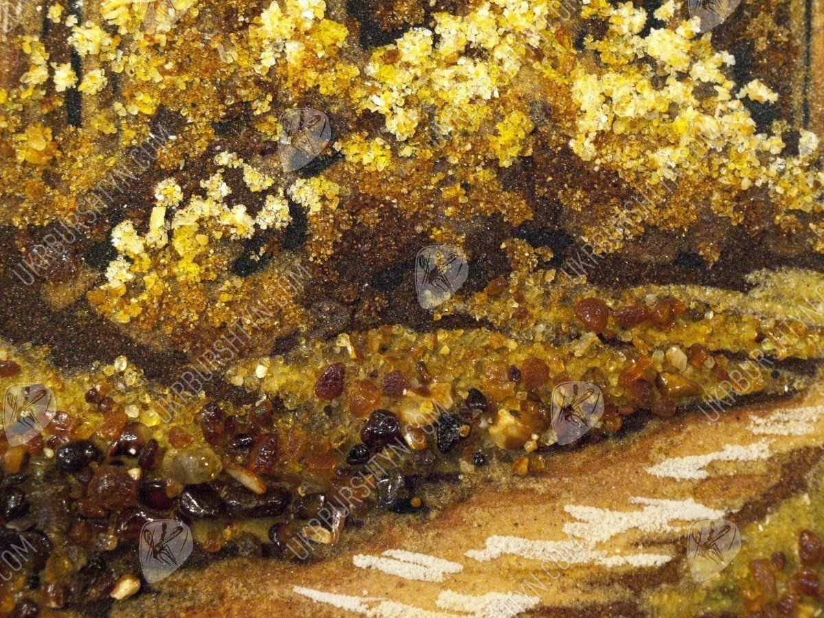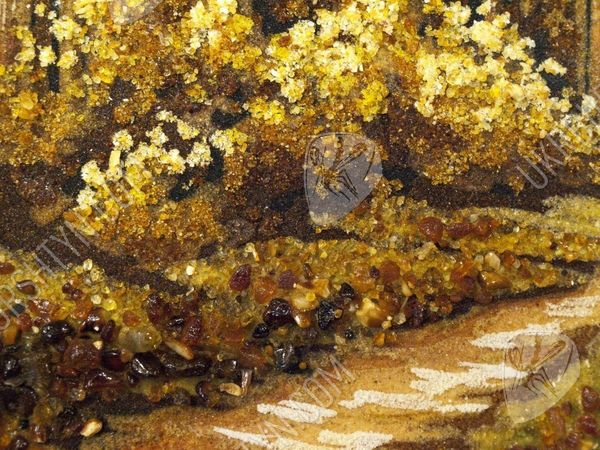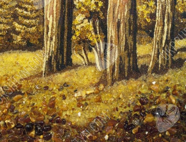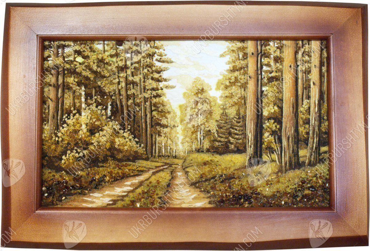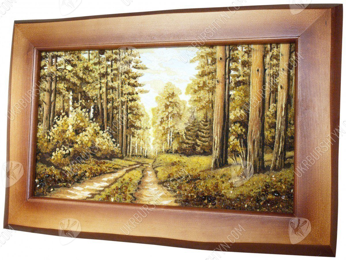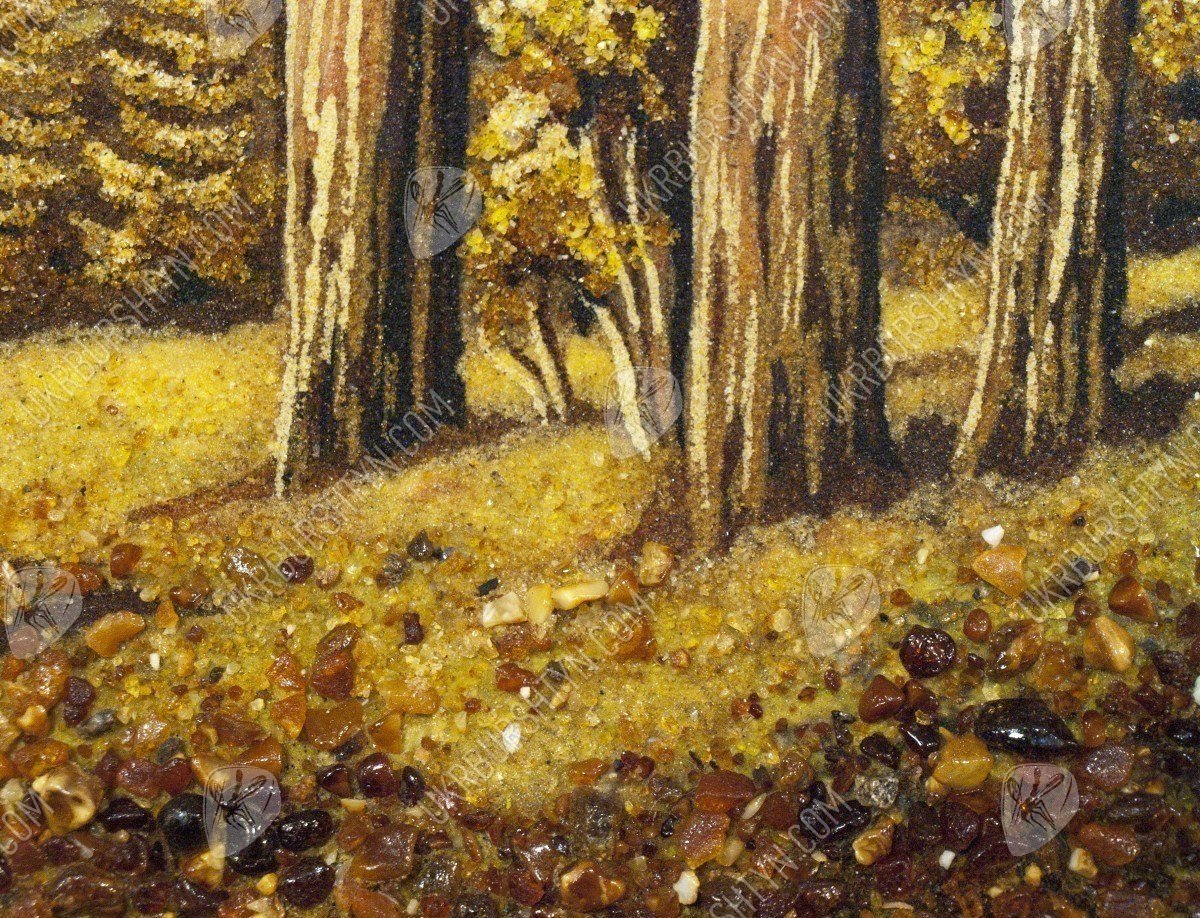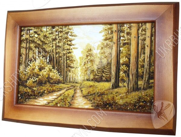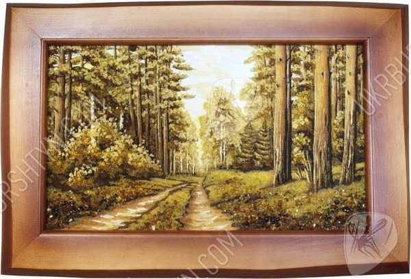 Прогулка в сосновом бору всегда радует, дарит новые силы и вдохновение от контакта с живой природой. Именно так наш мастер создал это уникальное панно, на котором изображена торная дорога в лесу. На обочинах пути высятся огромные, раскидистые и величественные деревья. Картина высыпана из оливковой, золотистой и шафрановой янтарной крошки – подобное сочетание позволило в точности передать особый колорит солнечных лучей, проникающих сквозь ветви, стройных, прямых стволов, на которых застыли светлые потёки смолы, буйного подлеска, укрывающего узловатые корни. Произведение выглядит чрезвычайно живо, реалистично и объёмно – поэтому оно вполне может стать центральным элементом дизайна!