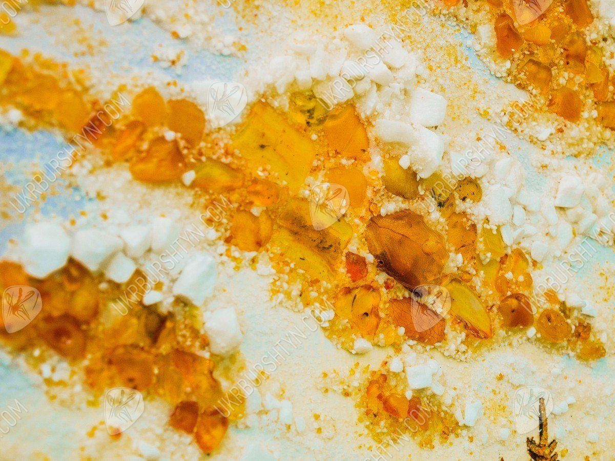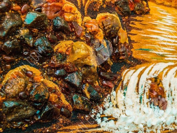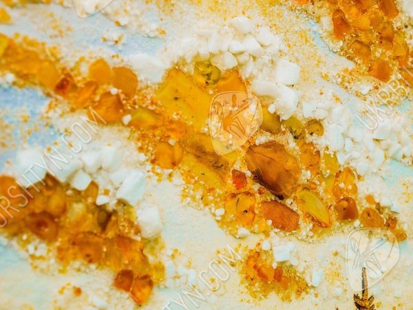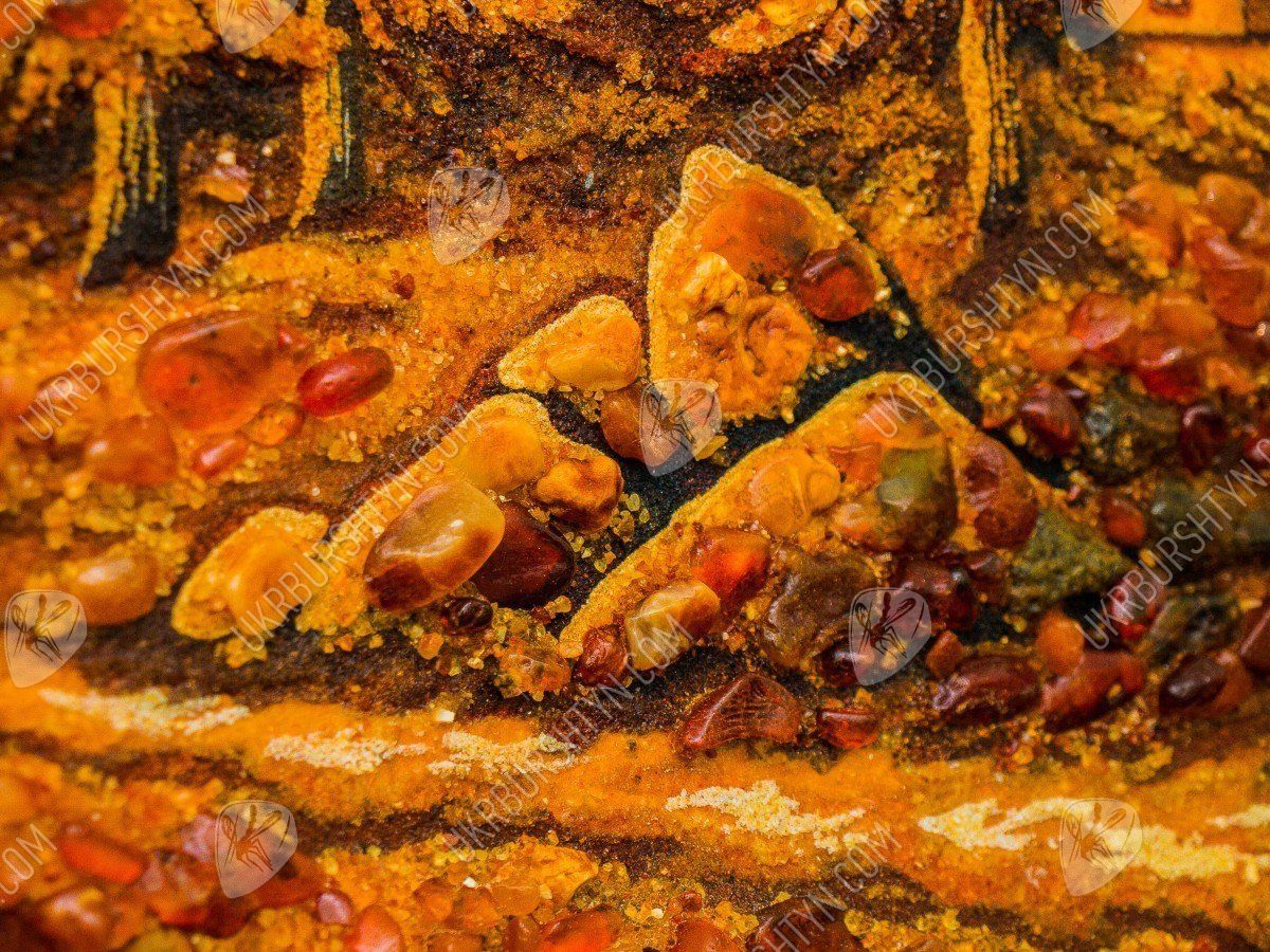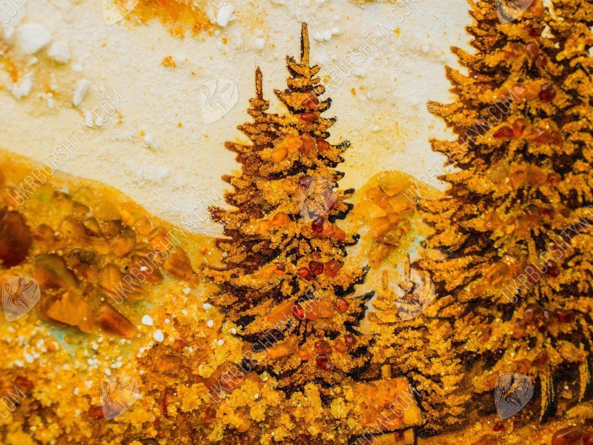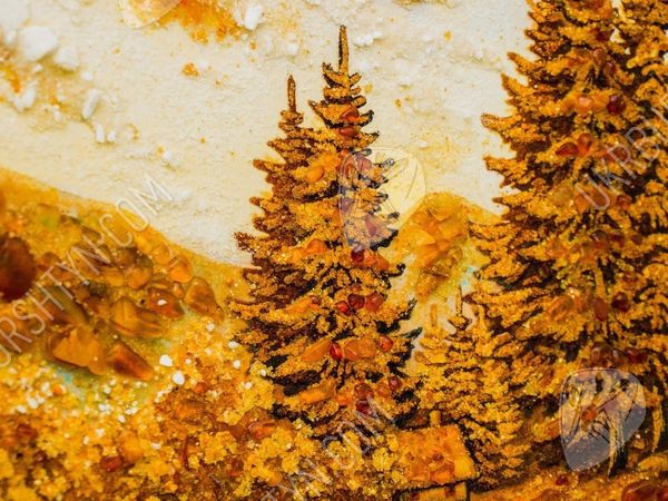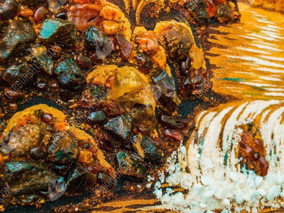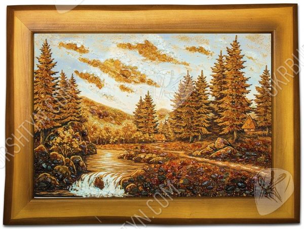 Красочные и подробные современные картины из янтаря – лучшее дополнение к стильному, эффектному интерьеру. Чтобы убедиться в этом, взгляните хотя бы на показанное здесь авторское панно! Мастер запечатлел на нём живописный и привлекательный лесной пейзаж. Высокие ели и лиственницы, вручную высыпанные из бежевой, рыжеватой и шафрановой самоцветной крошки, выглядят величественно и впечатляюще. А между ними струится река, пенясь на валунах и перекатах – они сымитированы с помощью цельных терракотовых, тёмно-коричневых и оранжевых драгоценных камней. Общая цветовая гамма изображения напоминает о тёплом, солнечном сентябре – поэтому работа станет прекрасным сезонным аксессуаром!
