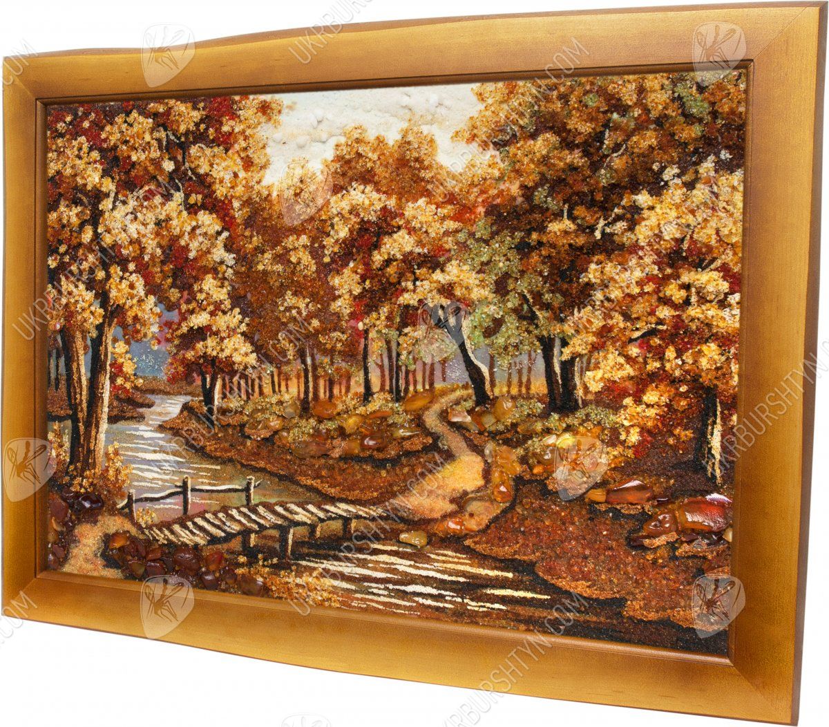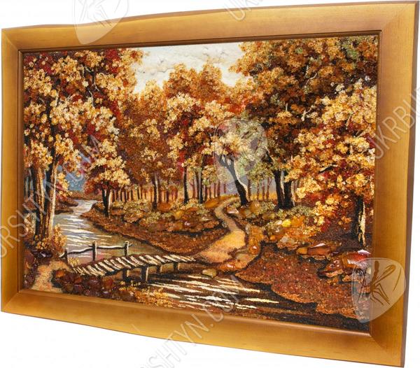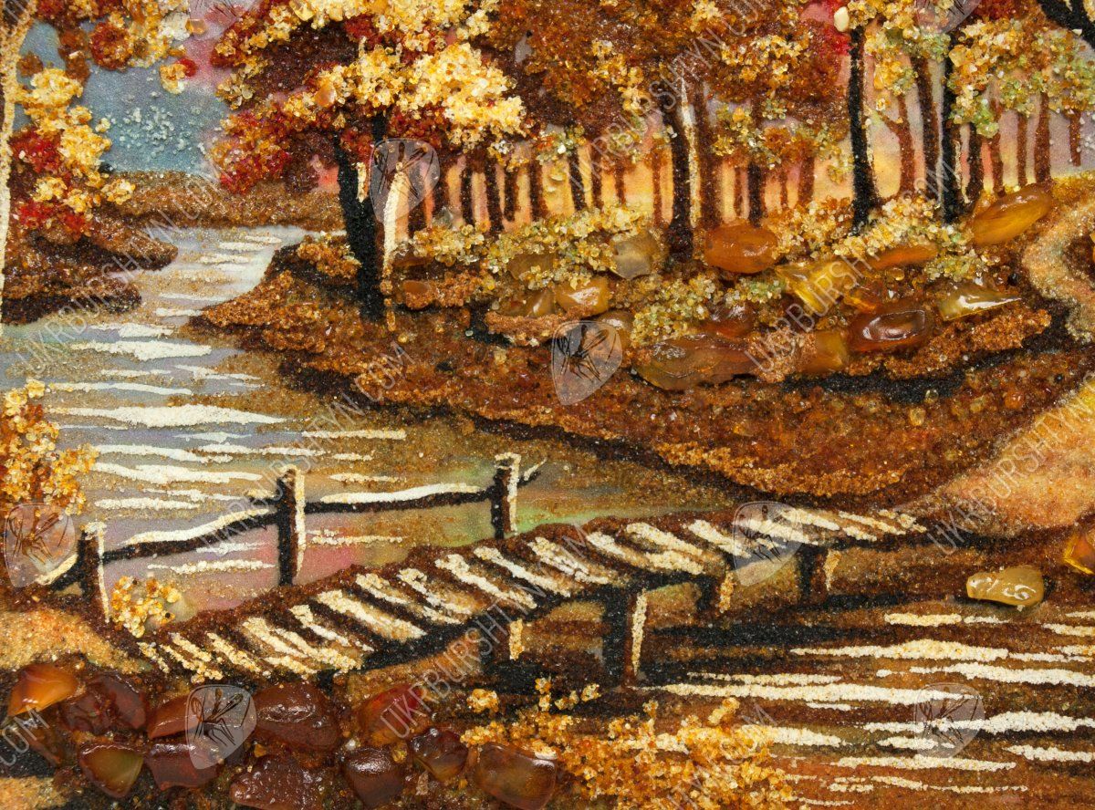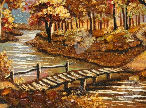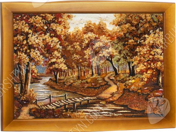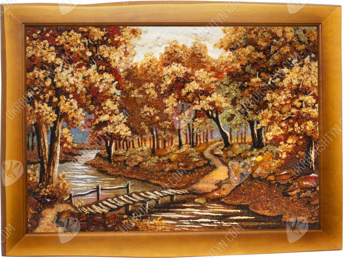 Мастер высыпал из природного полесского янтаря самый разгар «золотой» осени – кроны деревьев пламенеют лимонными, золотыми, медово-жёлтыми, шафрановыми и оранжевыми тонами, и такие же листья громоздятся у корней дубов, кленов и ясеней. Через парк вьётся узкая тропинка. Воды неторопливой речушки прозрачны и холодны, а перекинутый через неё мостик так и приглашает прогуляться!