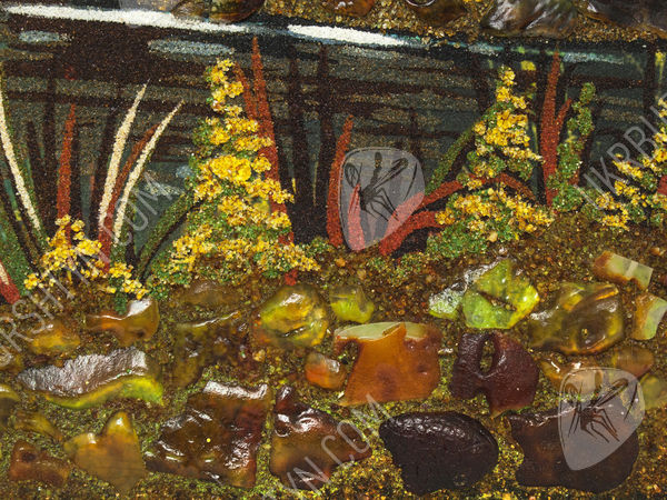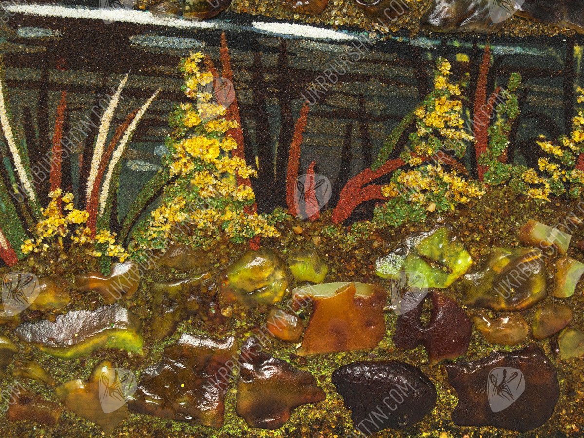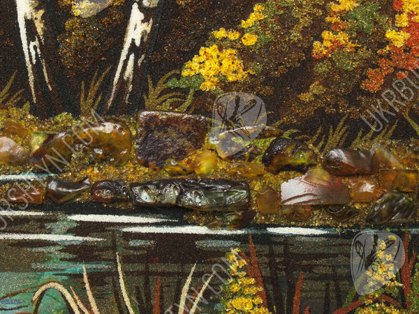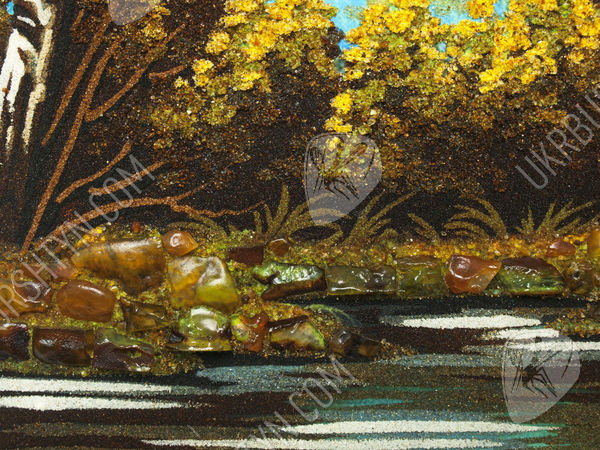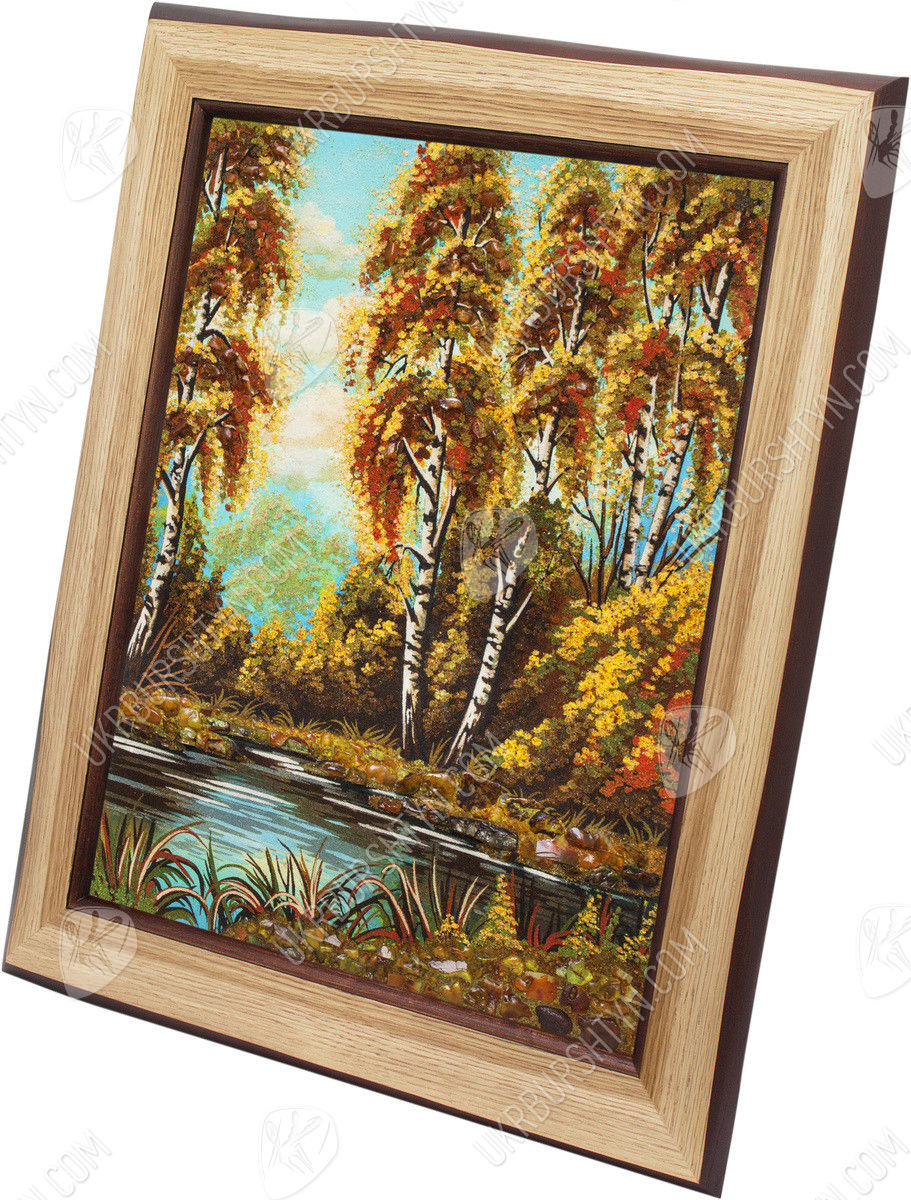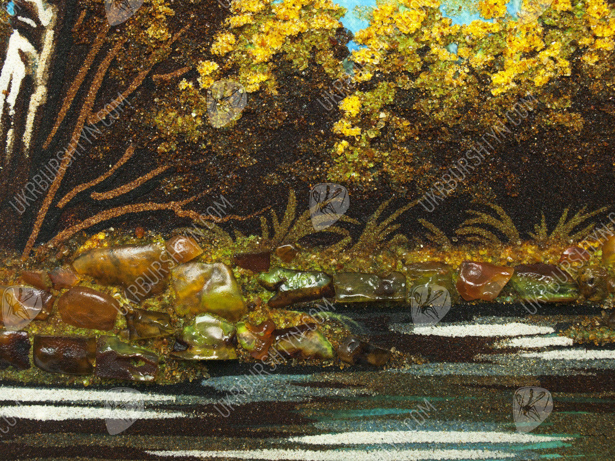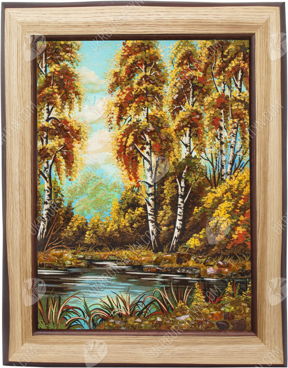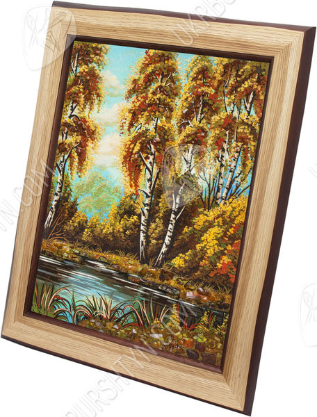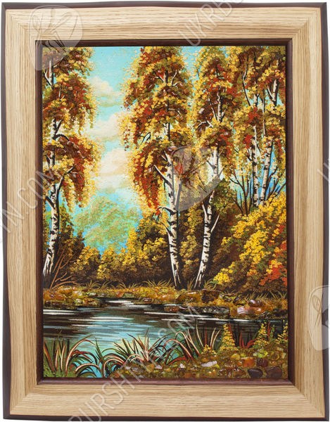 «Осенние березы» — классический пейзаж природы, который привлекает натуралистичностью оттенков. Стройные деревья в золотисто-желтой окраске красуются вокруг небольшого водоема. В сюжете чувствуется спокойствие и уравновешенность, что благоприятно влияет на семейную атмосферу. Эскиз инкрустирован камнями и крошкой из самоцветов. Благодаря удачному сочетанию цветов четко передаются краски леса, достигается реалистичность изображения. Изделие элегантно дополнит интерьер комнаты и станет интересным акцентом для рассмотрения. Янтарные картины для гостиной можно заказать разных размеров и оформить различными рамками.