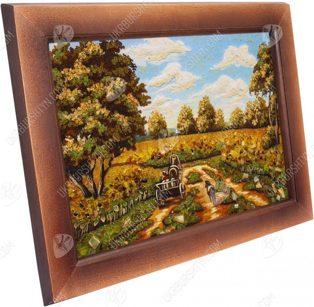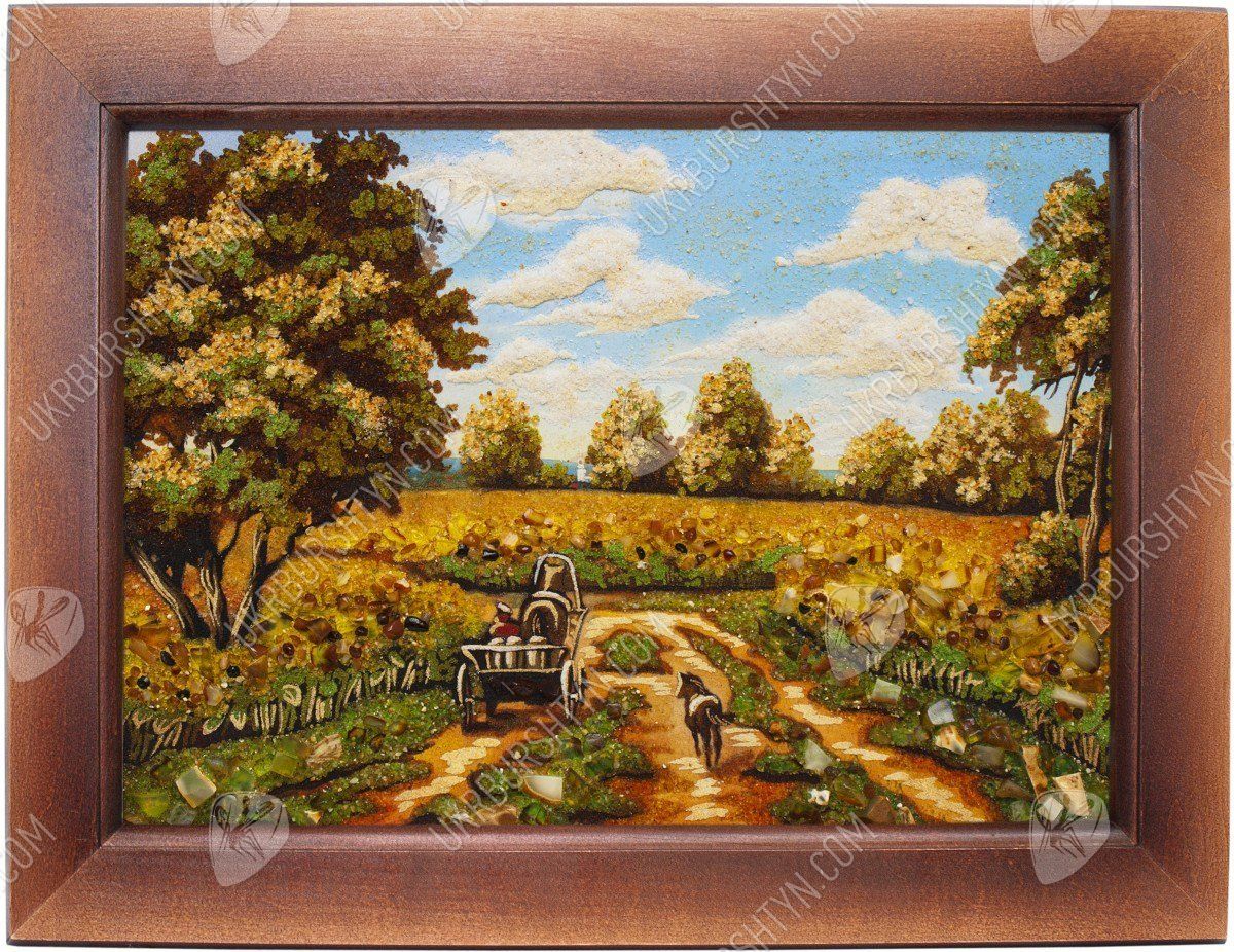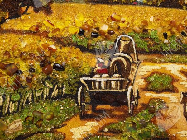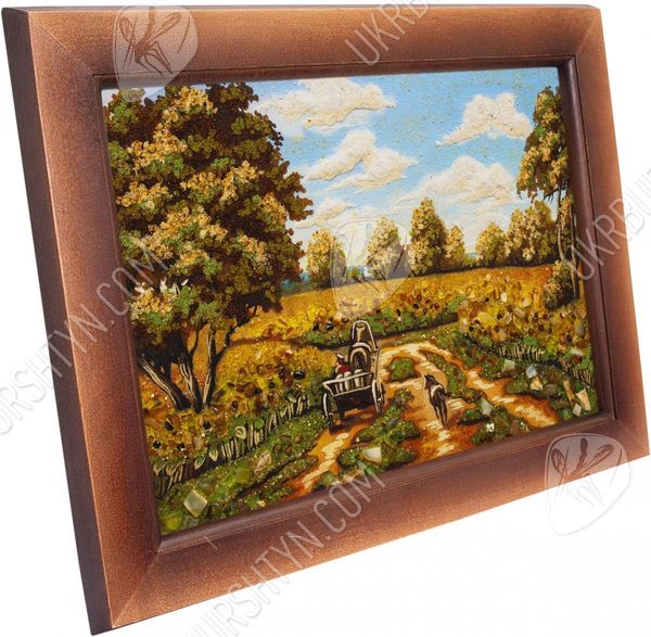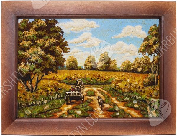 Подыскиваете живописные и оригинальные картины для интерьера, выдержанного в этническом или «кантри»-стиле? Это яркое панно подойдёт как нельзя лучше. Мастер высыпал из полесского янтаря красивый и умиротворяющий украинский пейзаж – битую дорогу, ведущую к полю, высокие деревья, дарящие прохладу даже в жаркий летний полдень, неторопливо плетущуюся лошадку и скачущего рядом с телегой жеребёнка. Благодаря гармоничному сочетанию цельных самоцветов и мелкой каменной крошки картина «Подсолнухи» выглядит реалистичной и рельефной – кажется, будто по золотому полю цветов вот-вот скользнёт тень от облака или пробежится лёгкий ветерок!