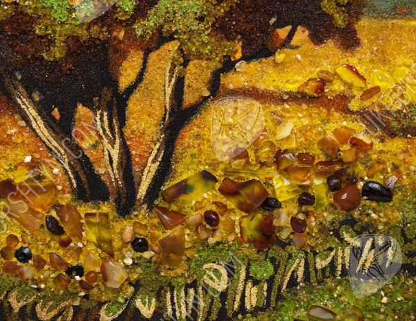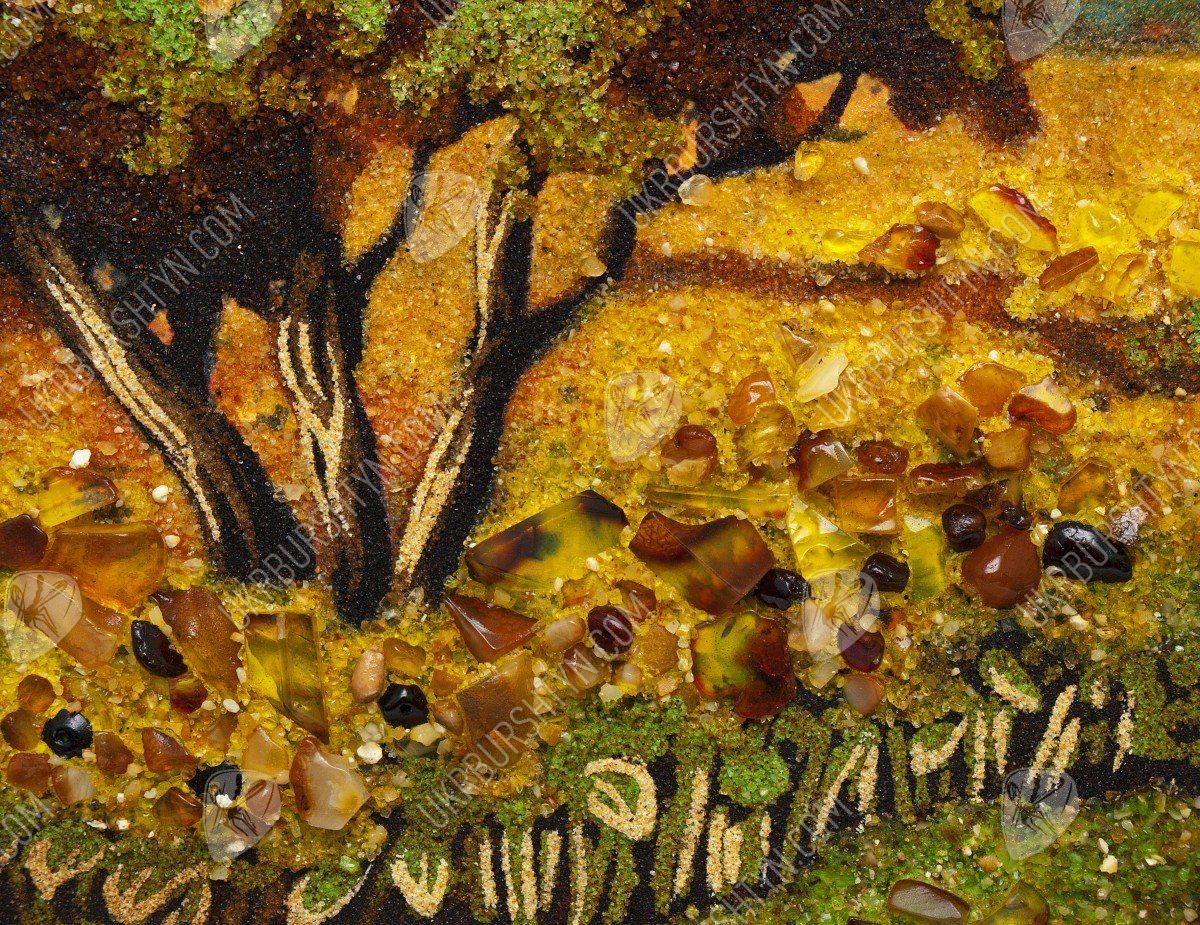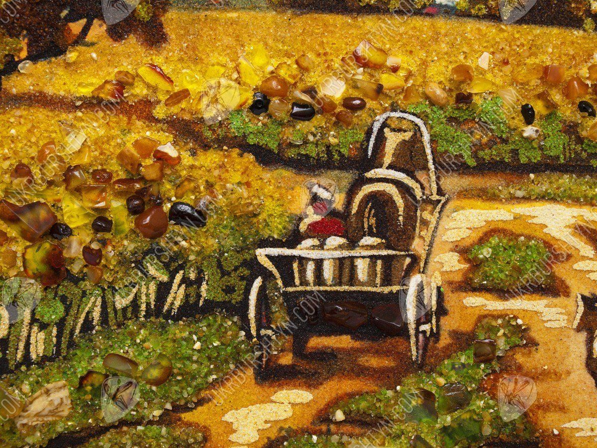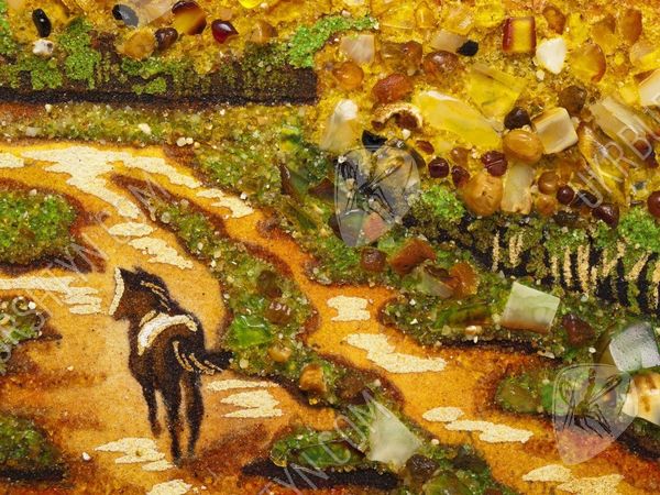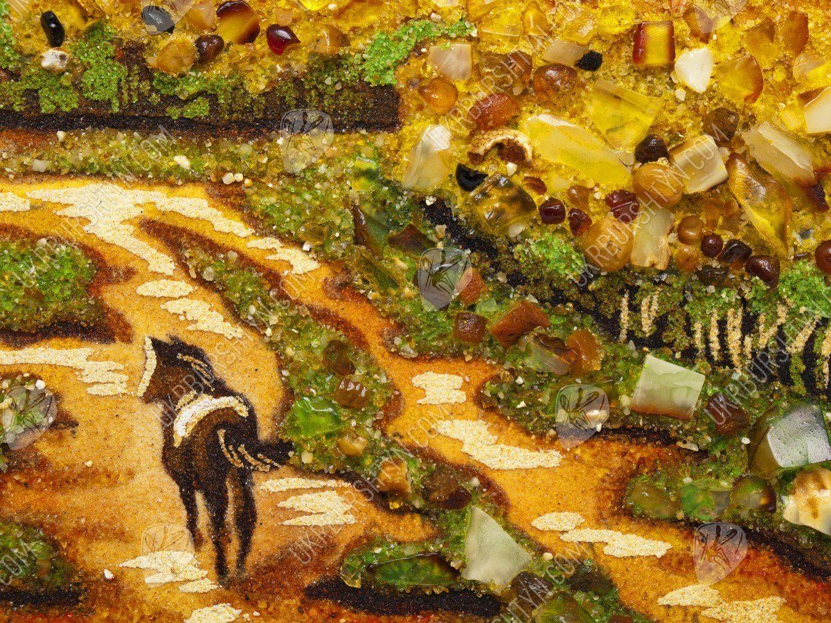 Подыскиваете живописные и оригинальные картины для интерьера, выдержанного в этническом или «кантри»-стиле? Это яркое панно подойдёт как нельзя лучше. Мастер высыпал из полесского янтаря красивый и умиротворяющий украинский пейзаж – битую дорогу, ведущую к полю, высокие деревья, дарящие прохладу даже в жаркий летний полдень, неторопливо плетущуюся лошадку и скачущего рядом с телегой жеребёнка. Благодаря гармоничному сочетанию цельных самоцветов и мелкой каменной крошки картина «Подсолнухи» выглядит реалистичной и рельефной – кажется, будто по золотому полю цветов вот-вот скользнёт тень от облака или пробежится лёгкий ветерок!