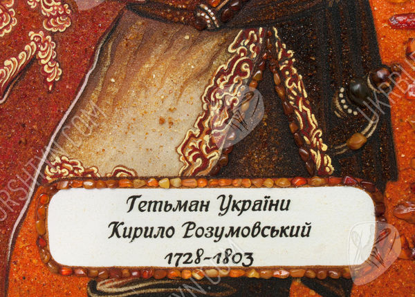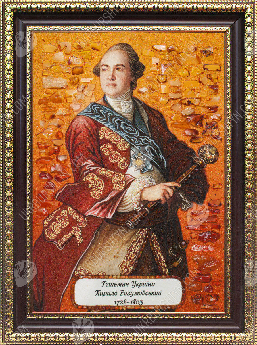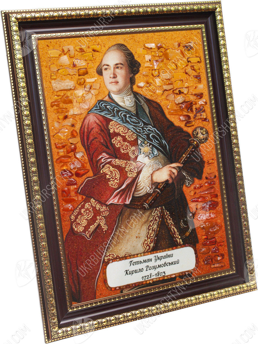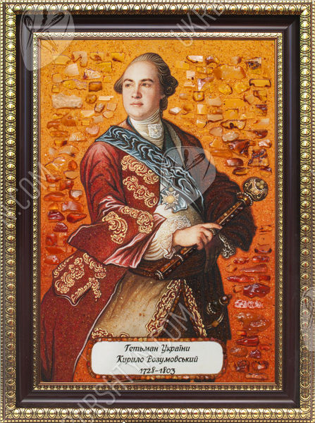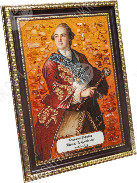 Кирилл Разумовский – гетман Войска Запорожского, которого часто характеризуют как прямолинейного, добродушного, щедрого человека. На картине изображен в статном костюме с булавой в руке. Портрет представлен в ярких оттенках. Выполнен из натурального янтаря в насыпной технике. Панно дополнительно декорировано изысканной рамкой с красивыми золотыми вставками. Такое изделие отлично подойдет в качестве подарка людям, чья профессия тесно связана с изучением истории и культуры Украины. Авторская работа хорошо дополнит интерьер кабинета. Станет стильным акцентом дизайна. Заинтересовались? Покупайте шикарный презент под заказ.