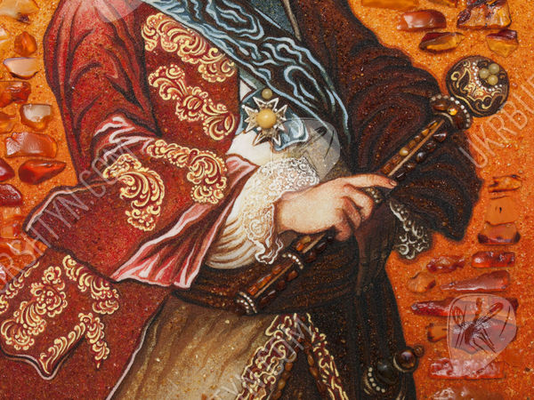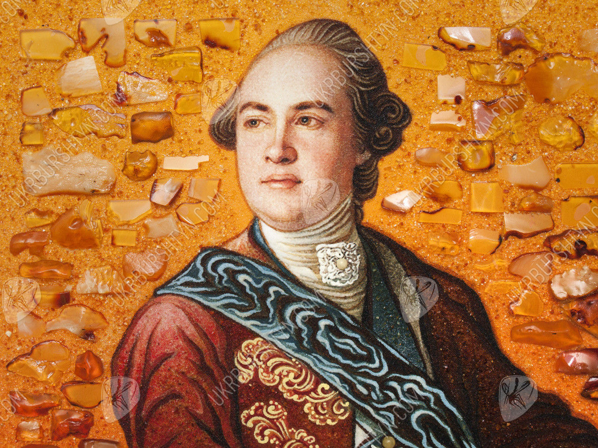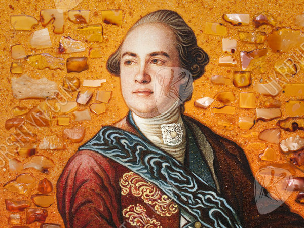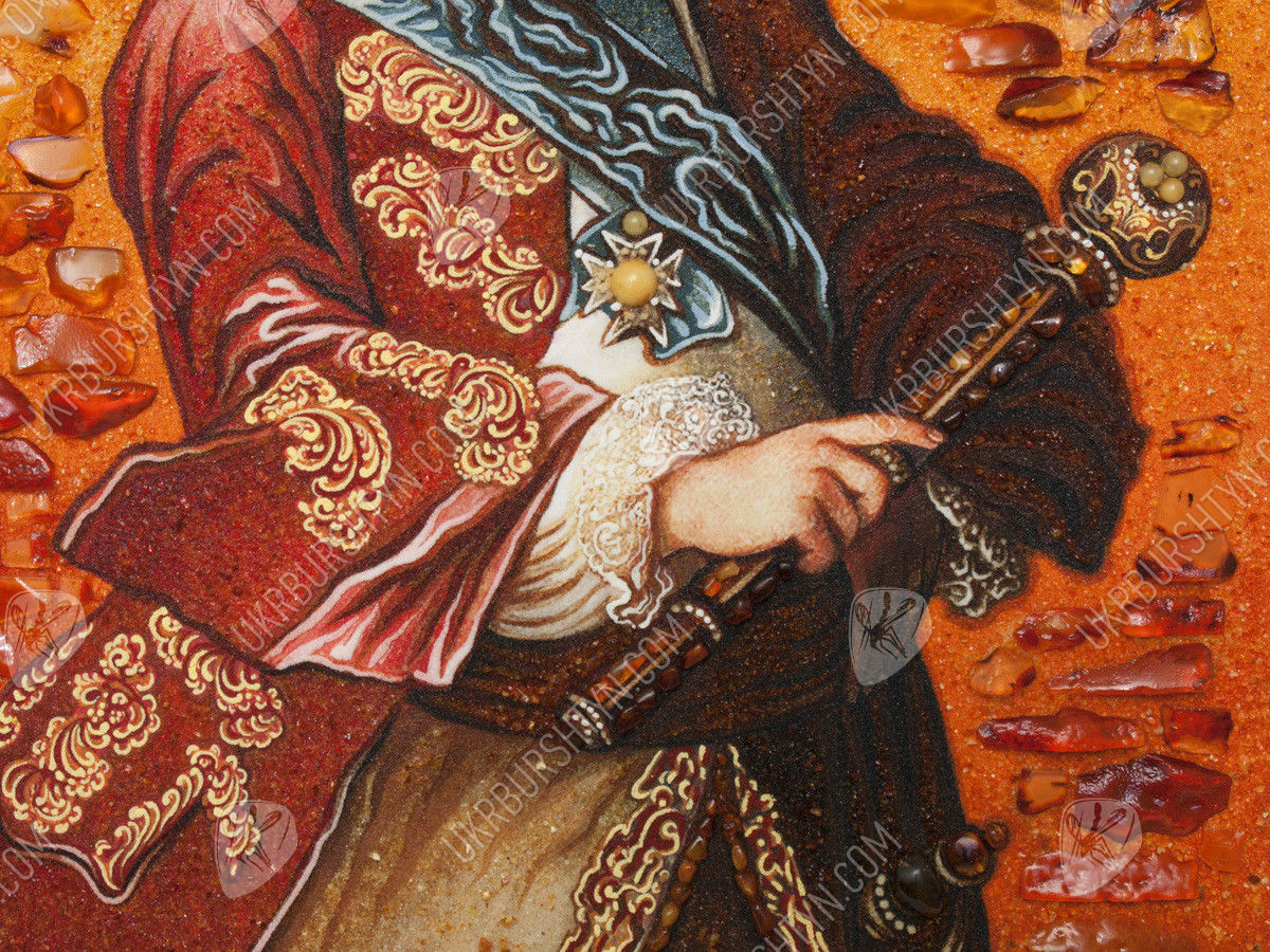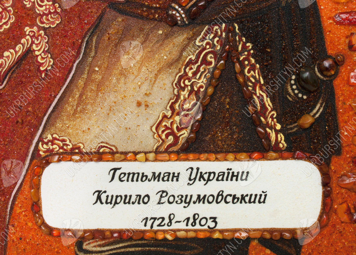 Кирилл Разумовский – гетман Войска Запорожского, которого часто характеризуют как прямолинейного, добродушного, щедрого человека. На картине изображен в статном костюме с булавой в руке. Портрет представлен в ярких оттенках. Выполнен из натурального янтаря в насыпной технике. Панно дополнительно декорировано изысканной рамкой с красивыми золотыми вставками. Такое изделие отлично подойдет в качестве подарка людям, чья профессия тесно связана с изучением истории и культуры Украины. Авторская работа хорошо дополнит интерьер кабинета. Станет стильным акцентом дизайна. Заинтересовались? Покупайте шикарный презент под заказ.
