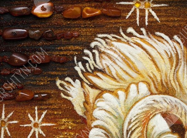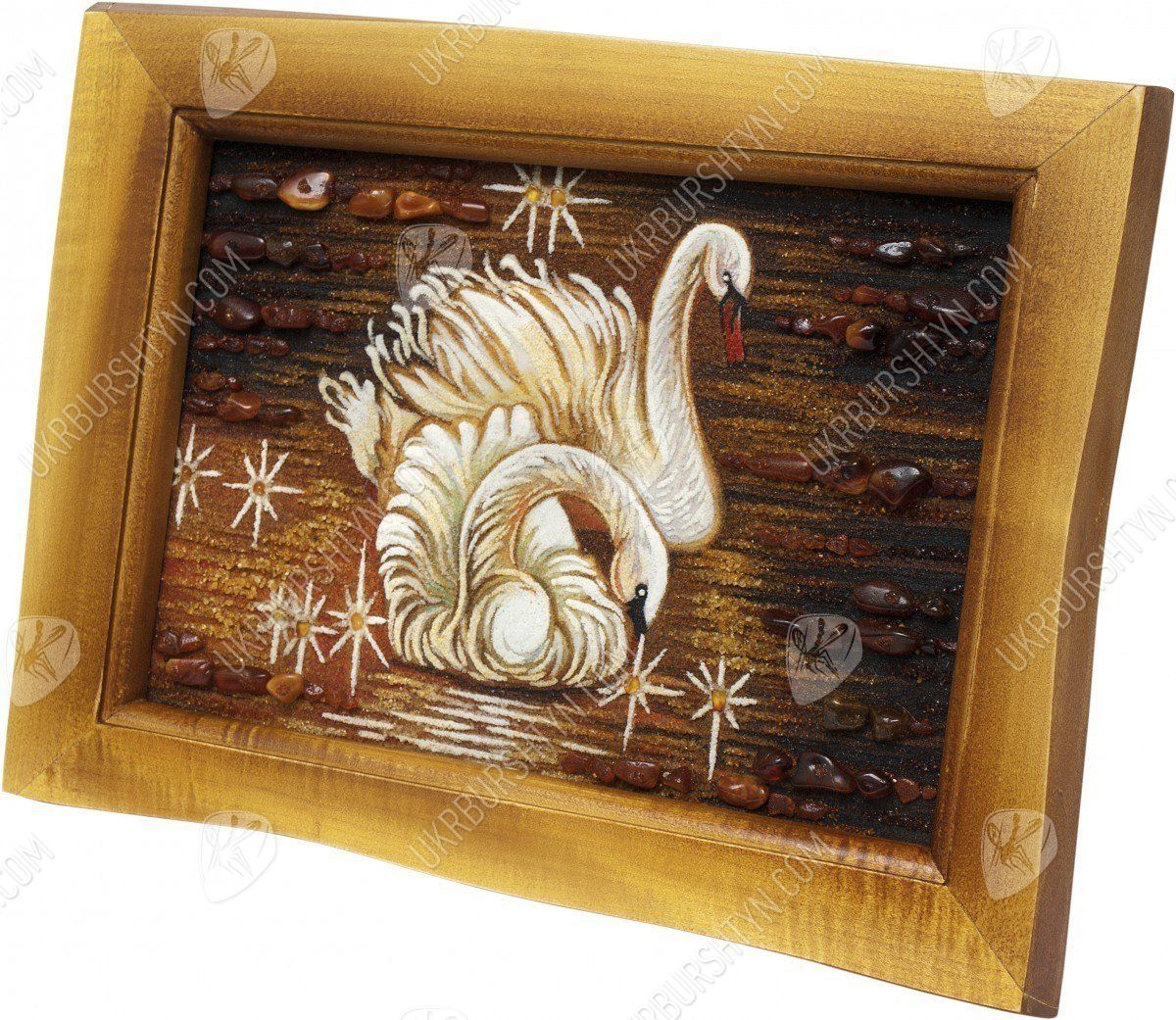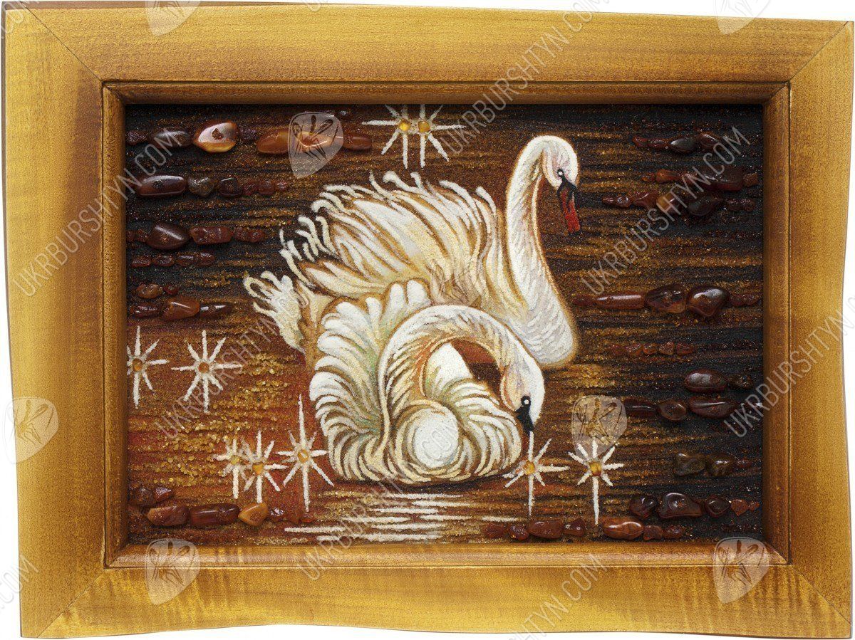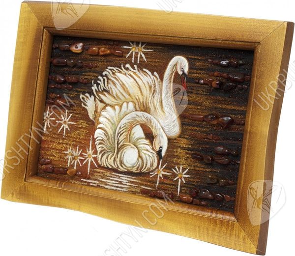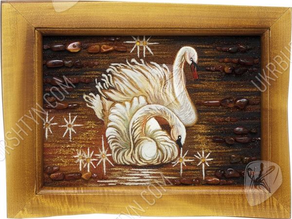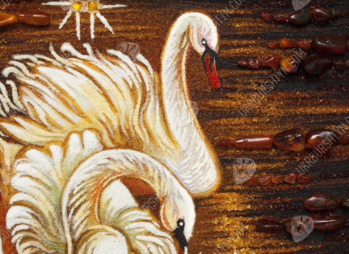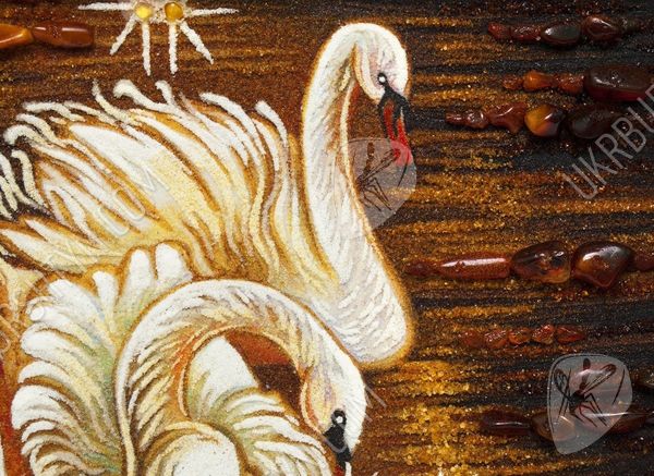 Такое идиллическое полотно «Лебеди на пруду» обязательно обратит на себя внимание романтика, обожающего природу. Живой янтарный самоцвет сотни лет ждал, когда у него появится возможность засверкать тысячами золотых оттенков, изображая нежную сцену любви. Руки и мастерство художника заставили тысячи маленьких камушков засверкать так, что, кажется, вы очутились в сказке. Нет более великолепного подарка на годовщину свадьбы своих родителей, чем эта картина. Они точно также были всегда рядом на длинном и сложном жизненном пути. Наступил золотой вечер, все затихло вокруг, глядя на эту потрясающую картину.
