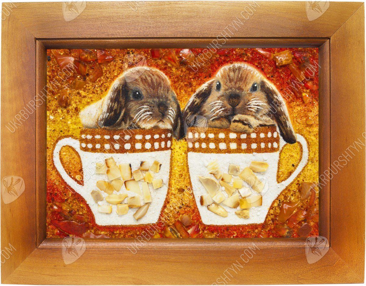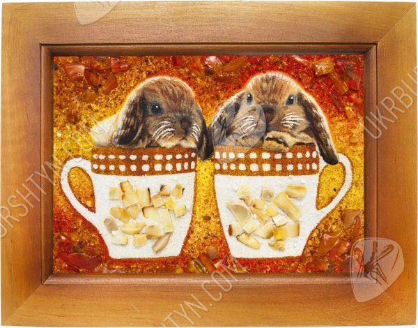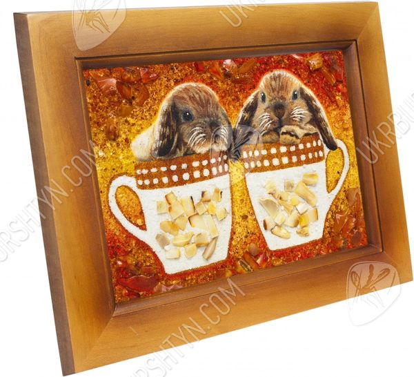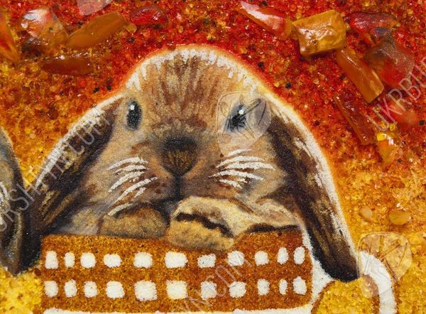 Милые и чудные кролики, застывшие на полотне, выглядят как красивая иллюстрация любимой в детстве сказки. Такой подарок по достоинству сможет оценить красавица дочка. Он будет помещен в центр комнаты на самое почетное место. Глядя на эти нежные плюшевые комочки, начинаешь испытывать настоящую нежность к нашим маленьким братьям. Малыши уже давно просят у вас купить им кролика. Однако вы сомневаетесь в необходимости приобретения. Чтобы выйти из положения, купите для них эту янтарную картину, и скоро разговоры о кроликах прекратятся.