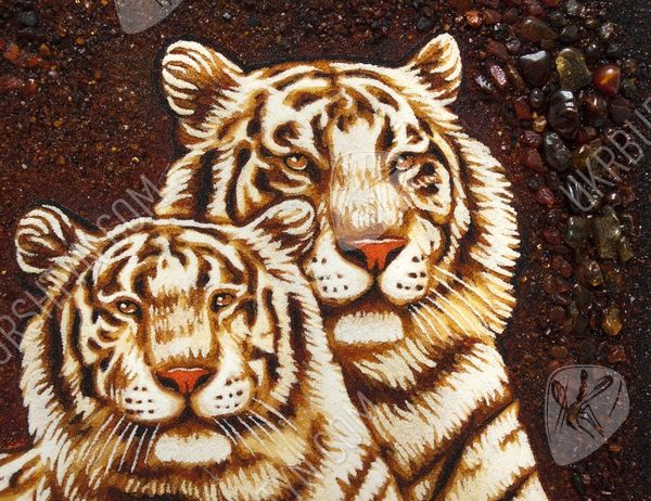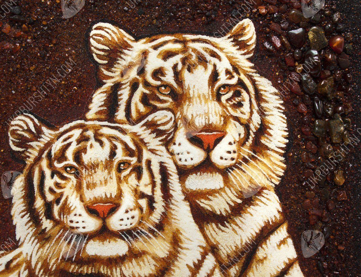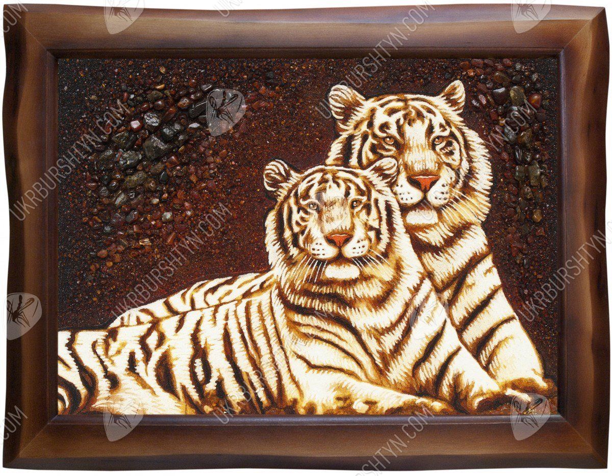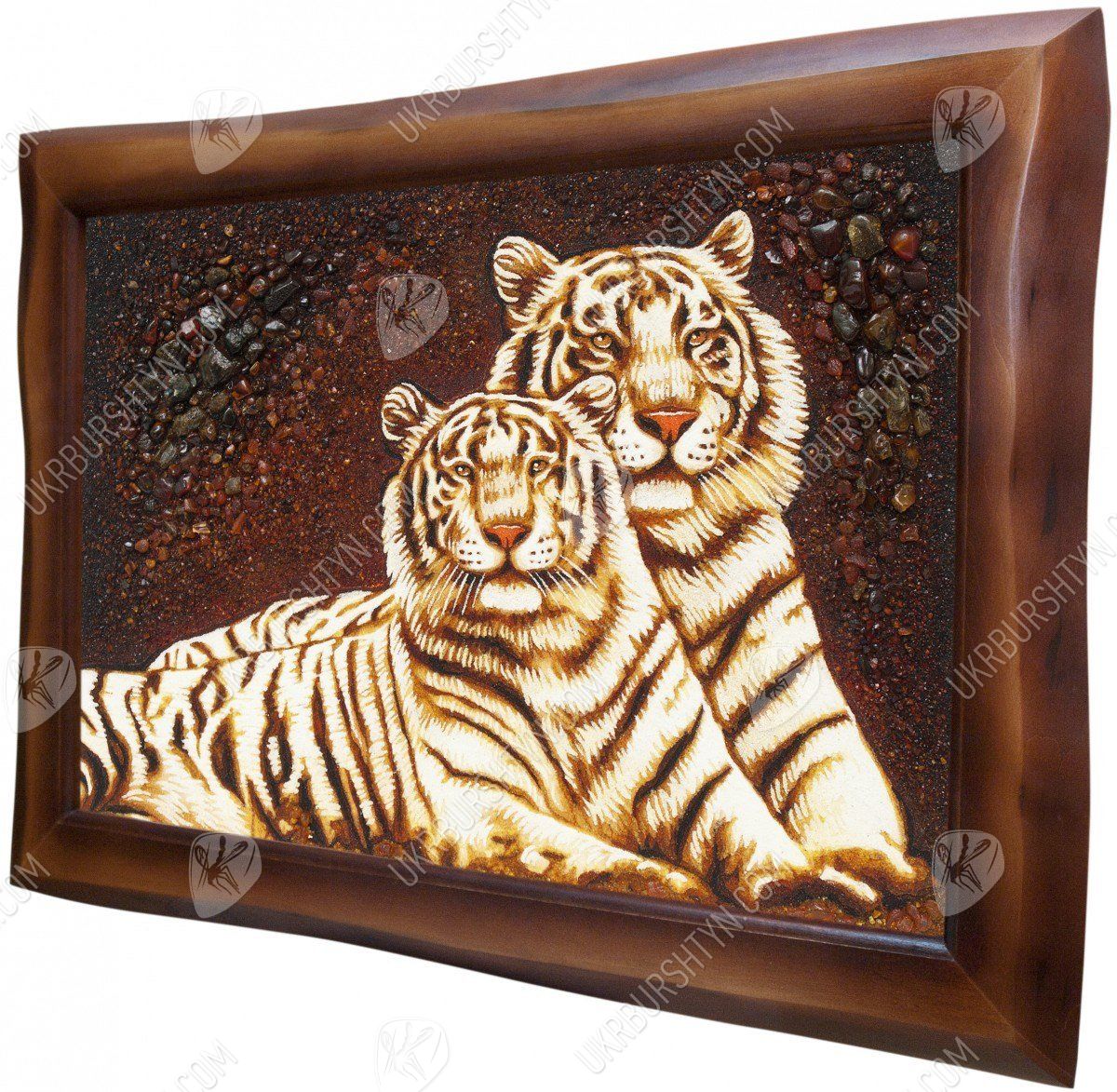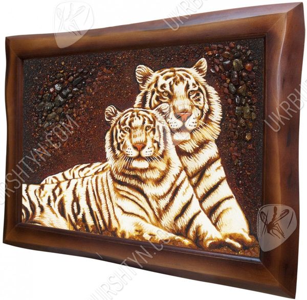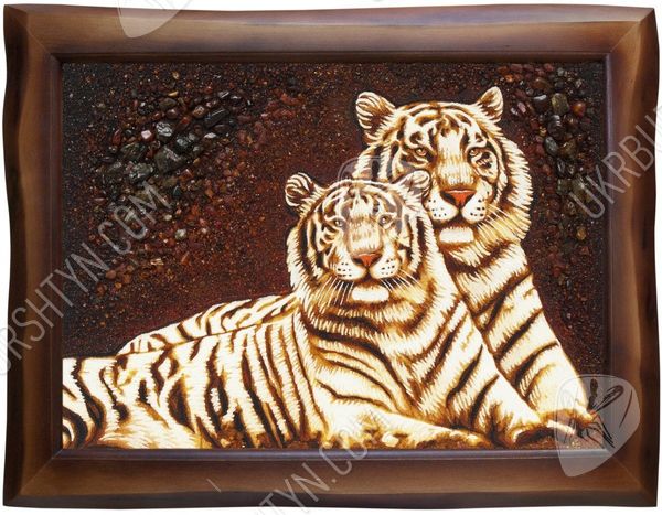 Потрясающая красота и непостижимость. Человеку сложно уловить и почувствовать все нюансы красоты поведения тигров. Эта грациозная кошка вызывает страх, она будоражит воображение. Изображение тигров украшено янтарными самоцветами. Благодаря им, так богато переливается его шерсть. Многообразие янтарного камня дает возможность предать изображению, настоящую природную естественность. Янтарные картины всегда остаются в моде. Благодаря их уникальности и мастерскому выполнению, они входят в группу вечных ценностей.