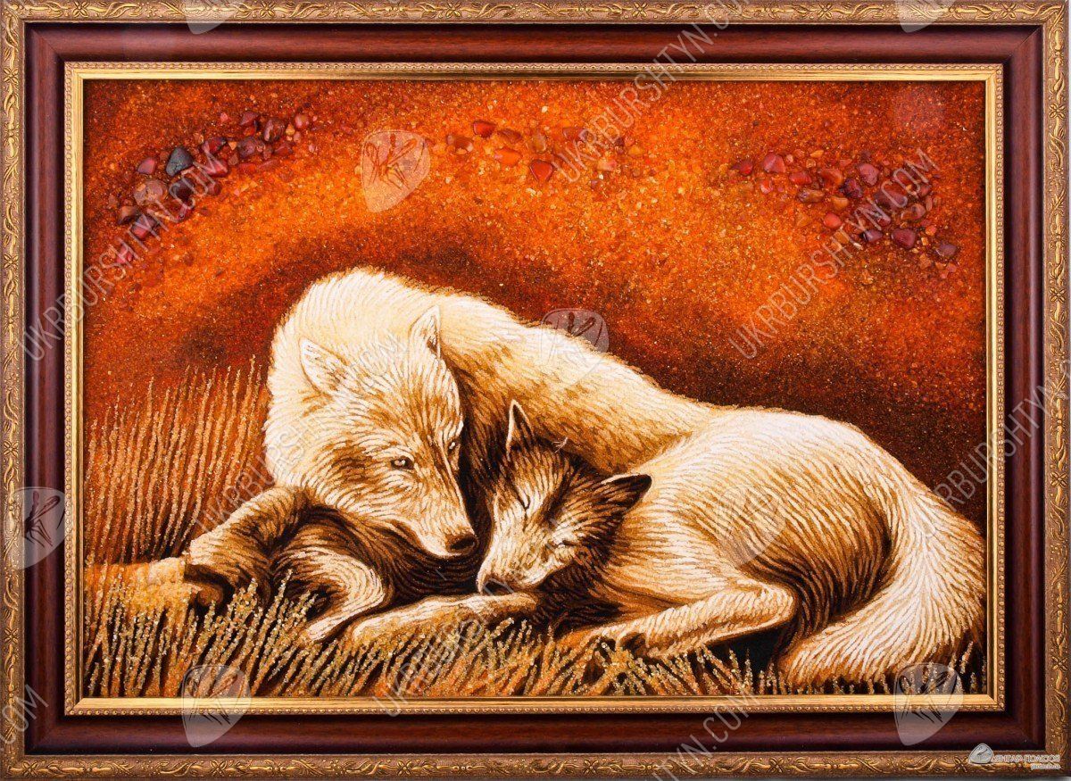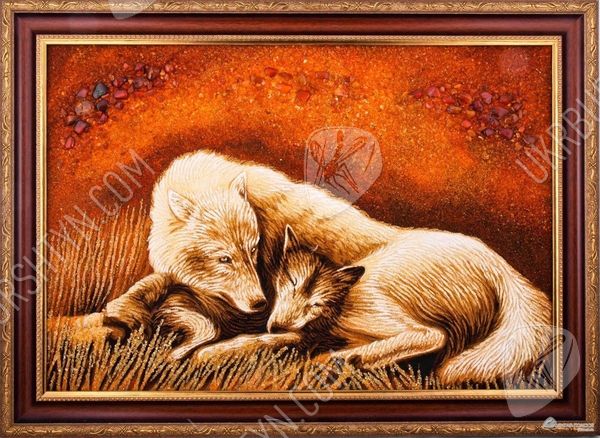 Картина с изображением двух спящих волков. Хотя волки ассоциируются у нас со свирепостью, жестокостью и коварством, они также обладают положительными качествами – храбростью, заботой, осмотрительностью. Эксклюзивная картина с волками прекрасно впишется в интерьер гостиной в классическом и винтажном стиле. Янтарь, которым инкрустировано полотно, придает насыщенности и живописности изображению. Будьте уверенны, панно которое вы видите, является уникальным и неповторимым, поскольку изготавливается вручную мастерами предприятия «Янтарь Полесья». Чтобы приобрести самоцветную картину, достаточно сделать один клик - Быстрая покупка.