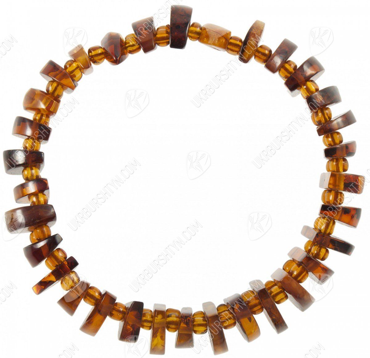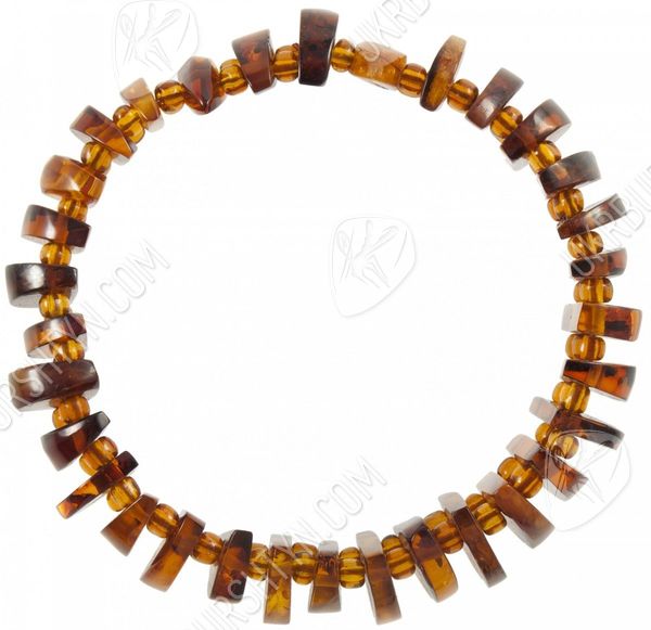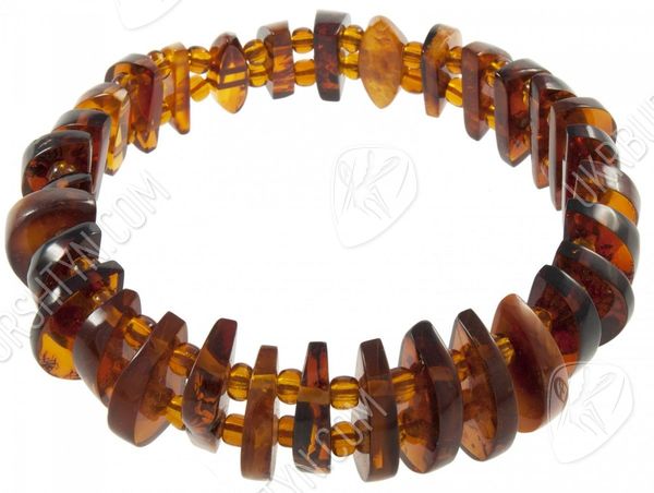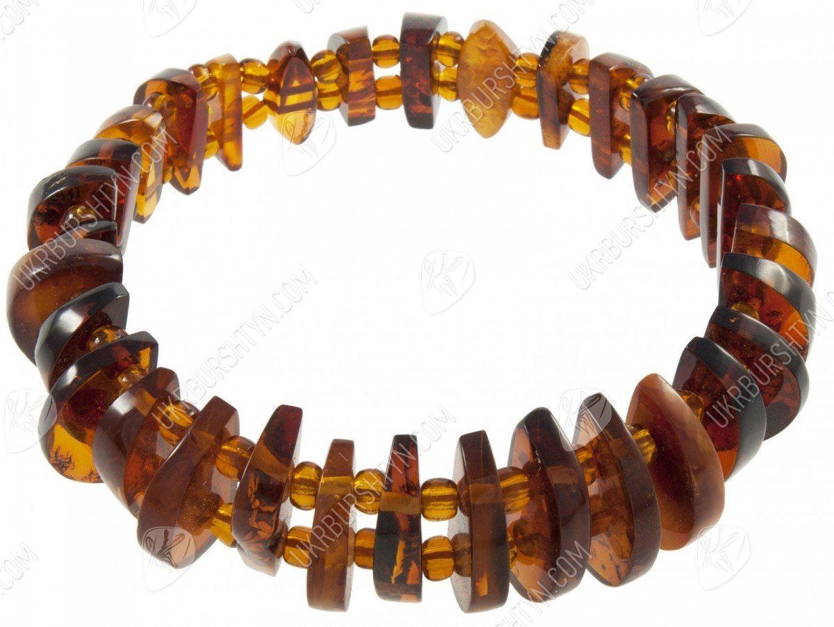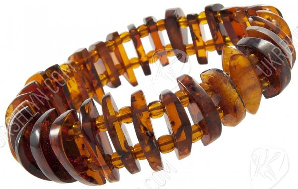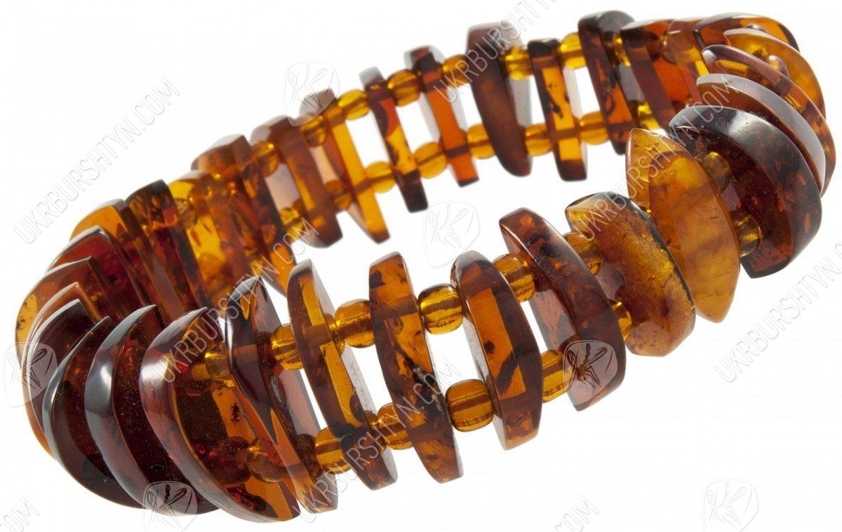 Подбираете качественные, оригинальные и красивые украшения из натуральных камней? Тогда Вам стоит взглянуть на этот уникальный браслет, представленный нашим интернет-магазином. В неординарном аксессуаре чередуются вырезанные вручную полукруглые пластинки из коньячного полесского янтаря и крошечные прозрачные бусинки-разделители. Такой дизайн значительно облегчает объёмное изделие, поэтому носить его легко и удобно. А непохожая конфигурация фигурных элементов вносит в произведение динамичность и разнообразие – так и хочется до него дотронуться, ощутив приятное тепло и гладкость, изучить контрастные включения, видимые в толще тщательно отполированной окаменевшей смолы.