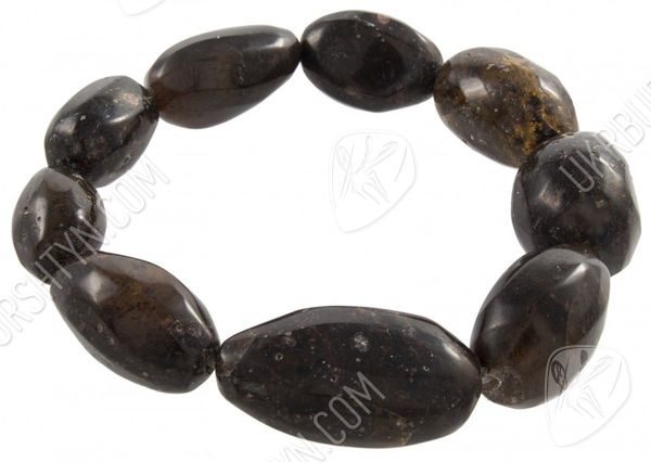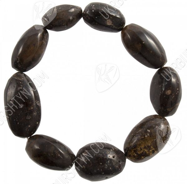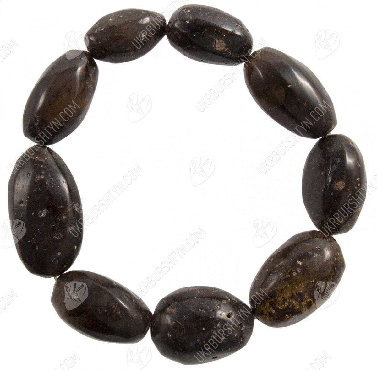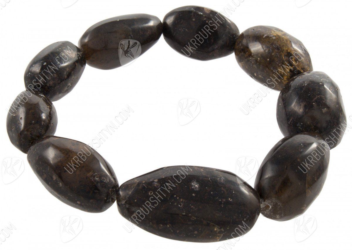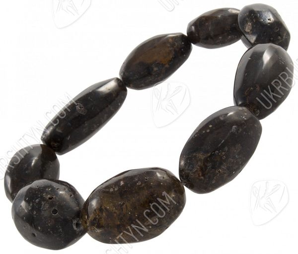 Массивные и объёмные аксессуары – тренд этого сезона. Правда, они идут не всем – на невысоких, изящных женщинах крупные украшения выглядят нелепо и слишком броско. Однако это не повод вовсе игнорировать модные тенденции – в нашем интернет-магазине Вы можете купить браслет, который будет идеально гармонировать с Вашей фигурой! Мастер составил изделие из удлинённых кусочков натурального полесского янтаря. Их расцветка очень необычна – продолговатые бусины кажутся непроницаемо-тёмными, и лишь кое-где видны более светлые коричневатые пятна. Однако стоит Вам прикоснуться к слегка шероховатой поверхности – и Вы откроете для себя тепло, скрывающееся в глубинах этих уникальных самоцветов!