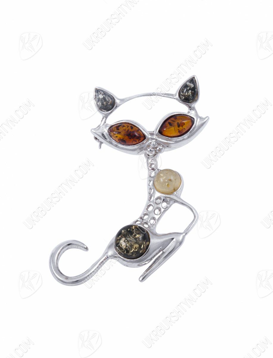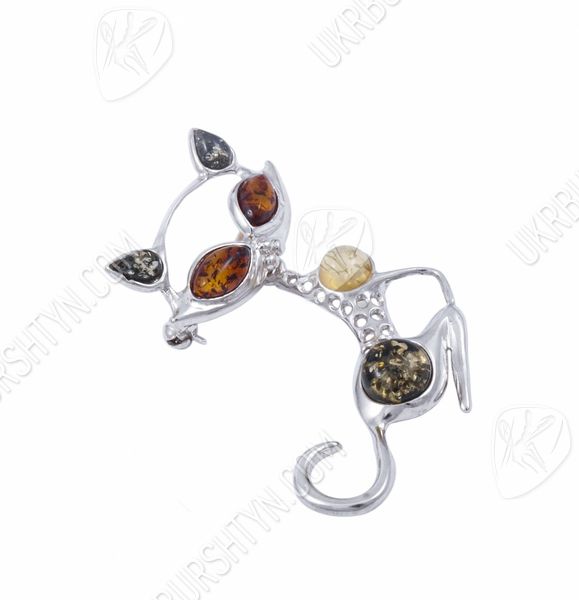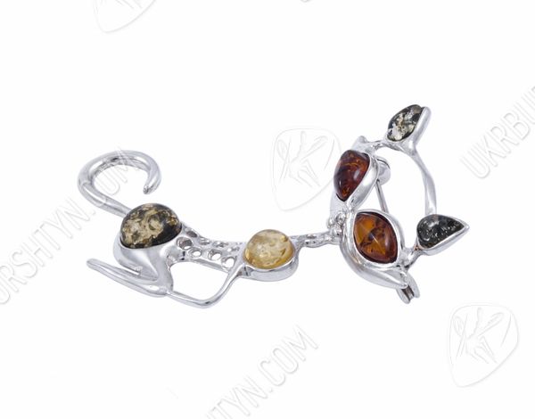 Необходим подарок для подруги? Намекните на грациозность, изящество, независимый и гордый нрав приятельницы, преподнеся ей этот аксессуар. Мастер выковал фигурку кошки из светлого металла, украсив ажурное произведение кусочками полесского янтаря. Глаза зверька выполнены из овальных оранжево-коньячных кабошонов, уши заменяют каплевидные искристые самоцветы, а на тельце расположены сразу два драгоценных камня – нежно-кремовый и тёмно-оливковый с золотистыми включениями. Благодаря подобному дизайну вид у этой броши с натуральными камнями из серебра стал неординарным, эффектным и запоминающимся – так что её можно носить и с одеждой в стиле «кэжуал», и с более нарядными ансамблями.