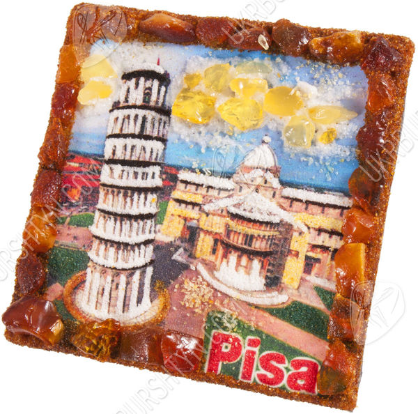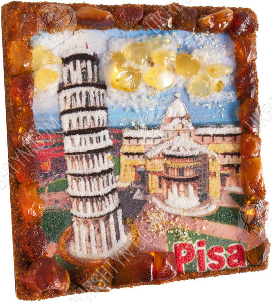 Эта конкретная модель особенно поражает богатством палитры. Для создания пейзажа были задействованы лазурные, лимонные, молочные и бледно-серые оттенки. Наклоненная Пизанская башня и строгая городская постройка, расположенные в центре изображения, в сочетании создают удивительно гармоничную композицию. Крупные темно-коричневые и желтые куски янтаря прекрасно вписались в цельный ансамбль.