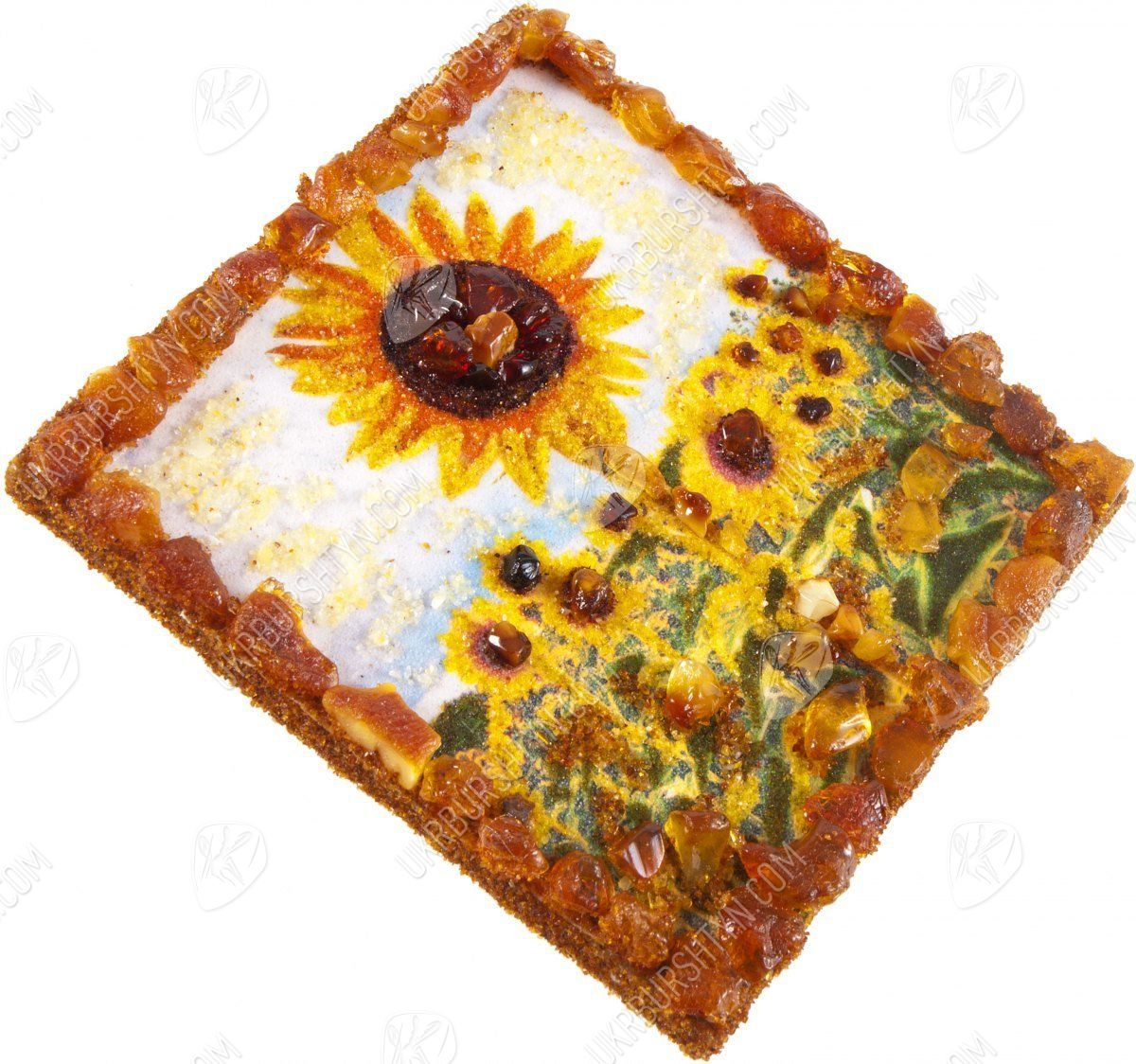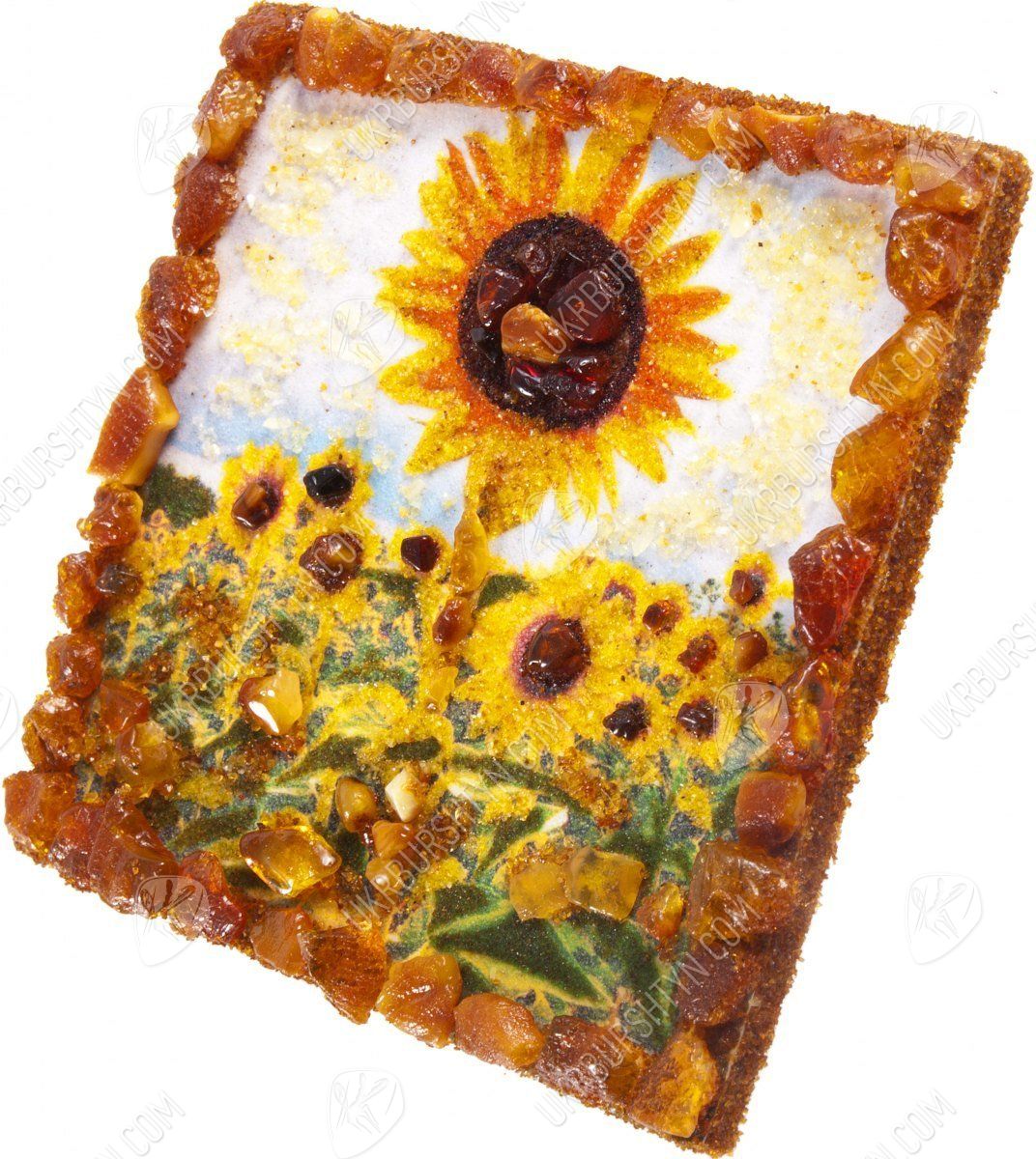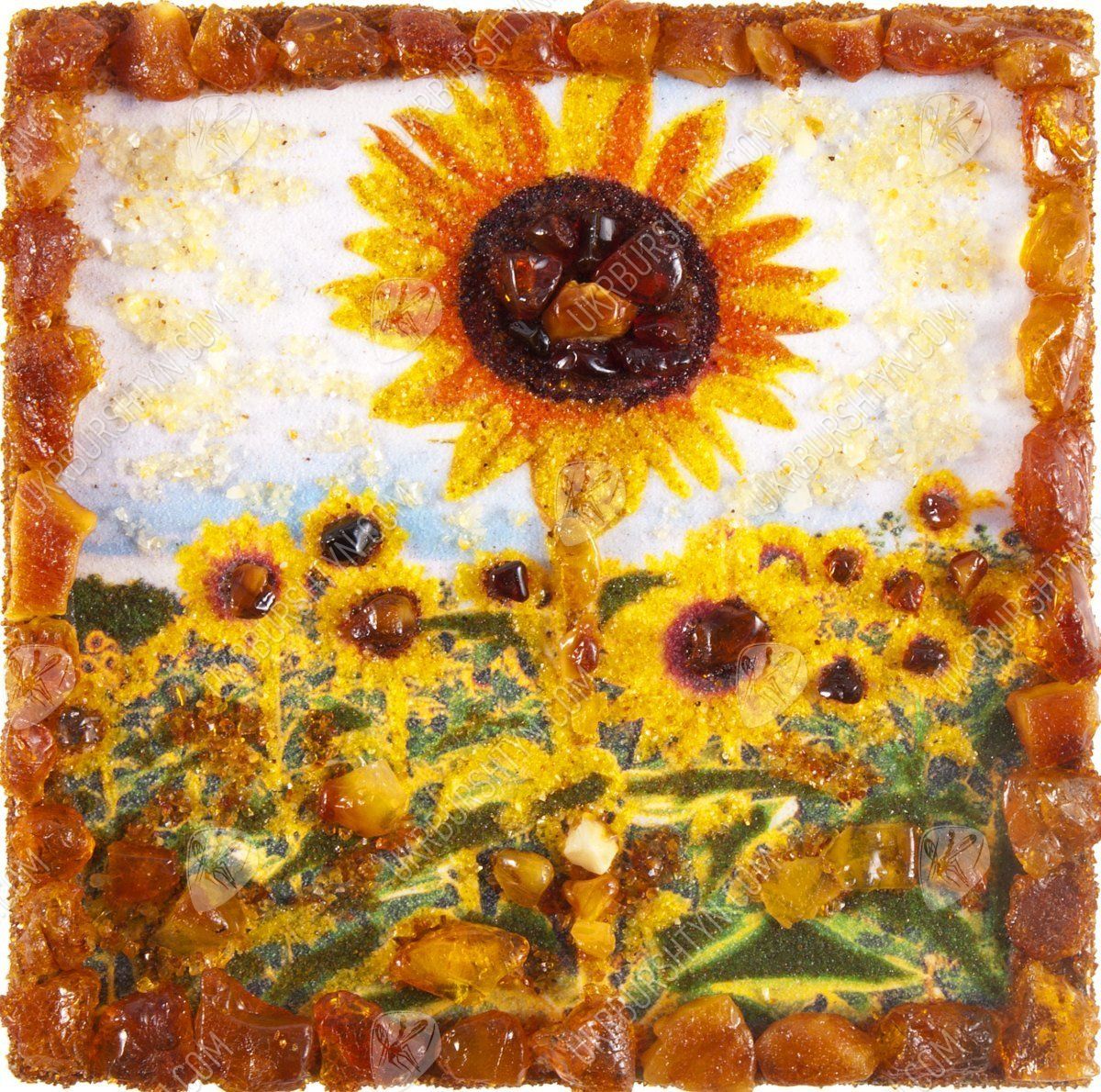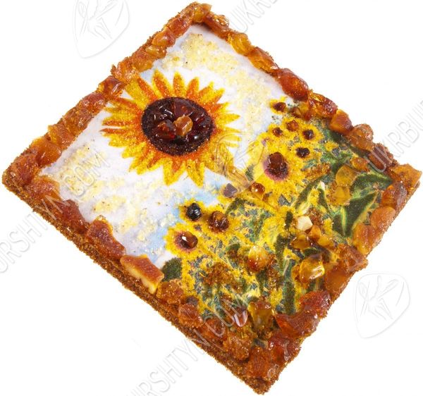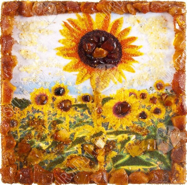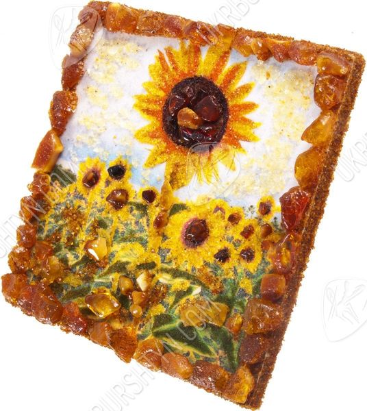 Хотите сделать своё жилище более оригинальным, стильным и ярким? На помощь придёт наш интернет-магазин декора, ведь здесь Вы всегда можете приобрести неординарные авторские сувениры! Среди подобных вещиц особо выделяется этот магнит, вручную изготовленный из полесского янтаря. Золотая, шафрановая, медово-жёлтая и лимонная каменная крошка идеально подошли для того, чтобы изобразить упругие лепестки подсолнухов, из оливково-зелёной застывшей смолы созданы листья растений, а цельные коричневые и терракотовые кабошоны имитируют зёрнышки, которыми усыпаны сердцевины цветов. Объёмные элементы украшают и каёмку рисунка – благодаря такому обрамлению он напоминает настоящую картину.