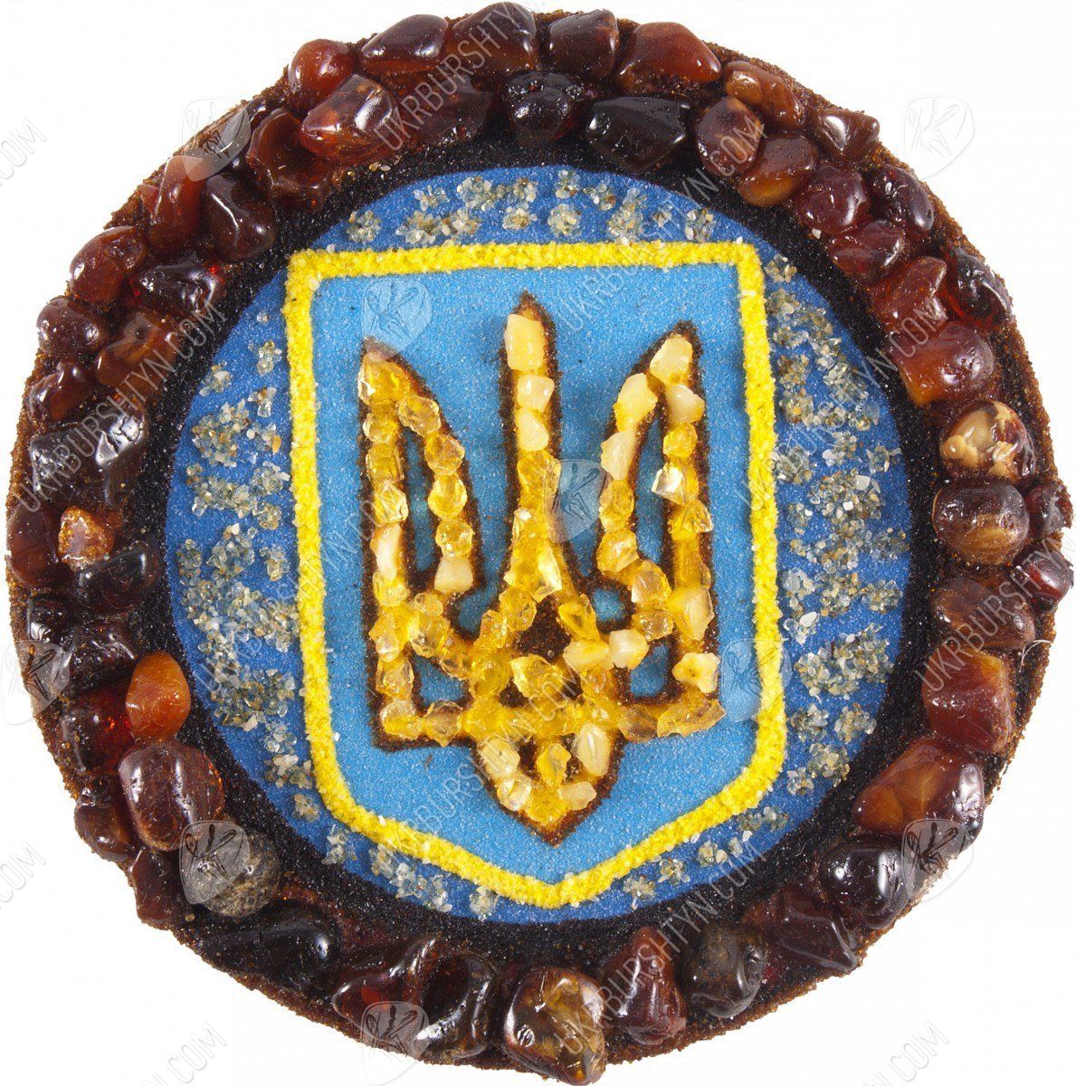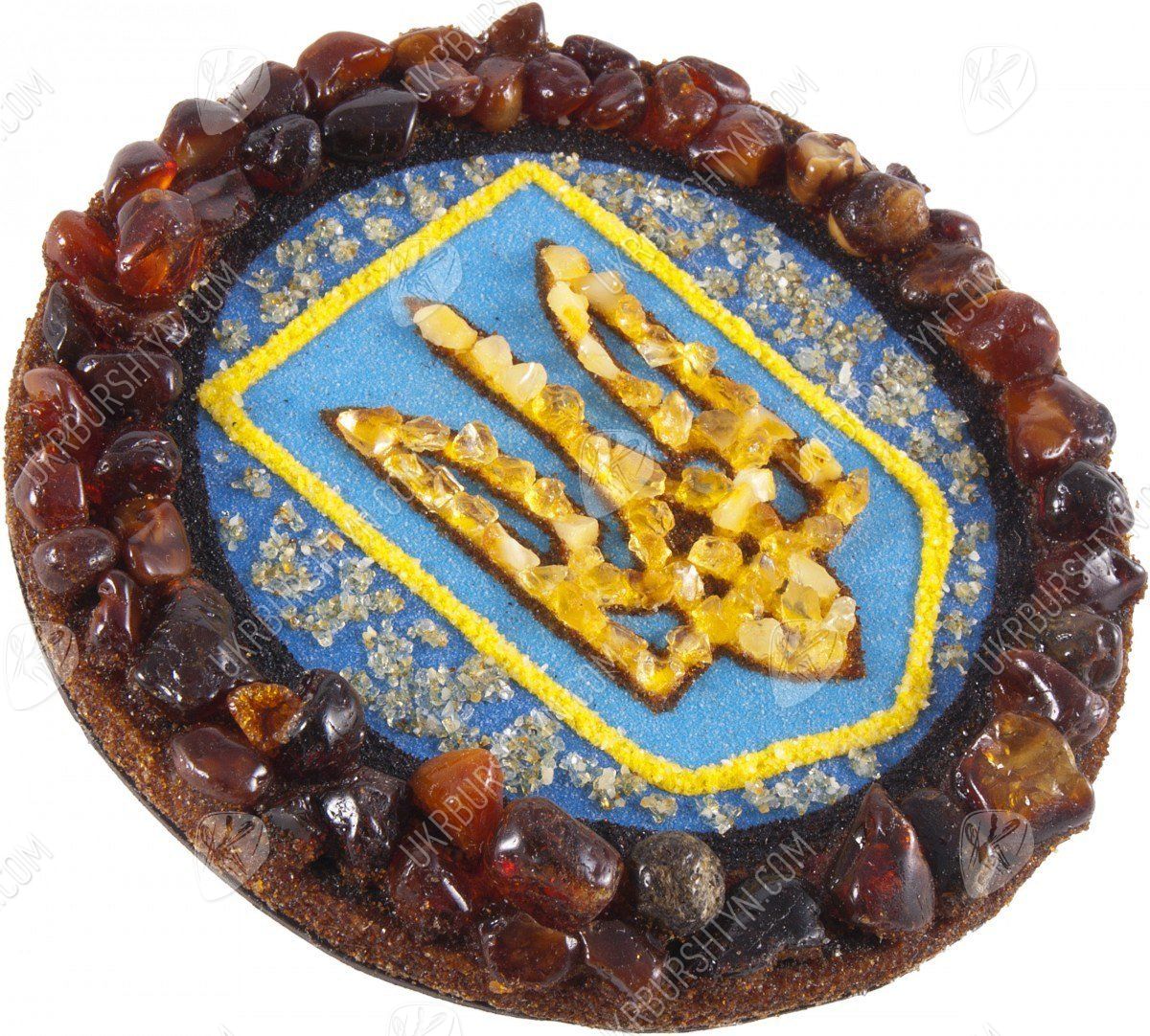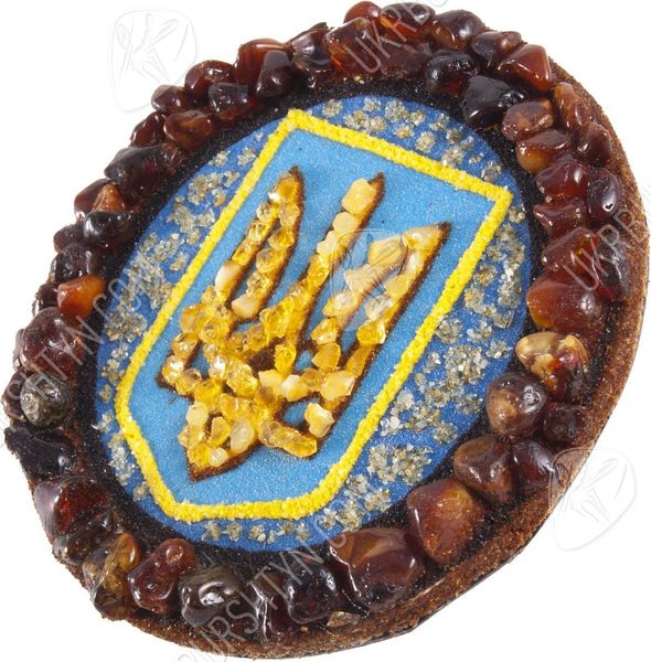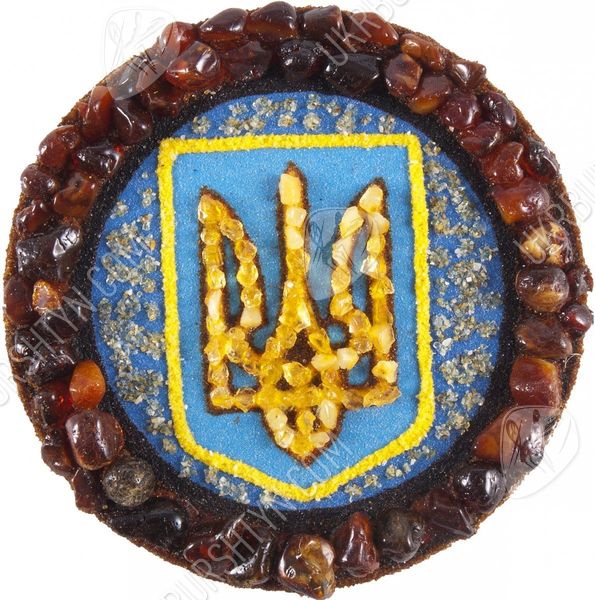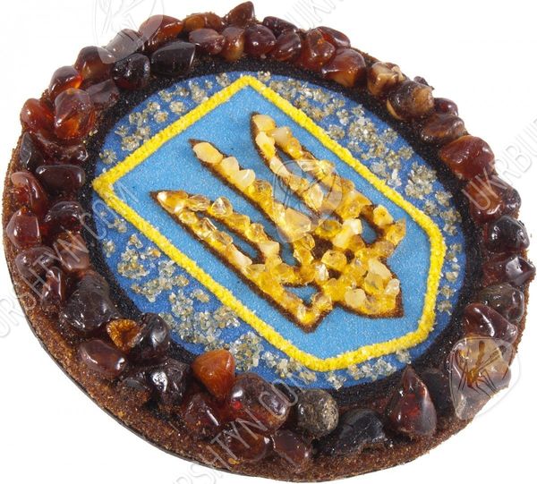 Взять хотя бы эту эксклюзивную вещицу – на лазурном фоне сияет палевыми, золотыми и лимонно-жёлтыми бликами Трезуб, вручную выложенный из цельных кусочков застывшей смолы. Герб Украины окружает широкая рамка из терракотово-багряных кабошонов. Подобное изделие понравится как патриотам своей страны, так и гостям из других государств.