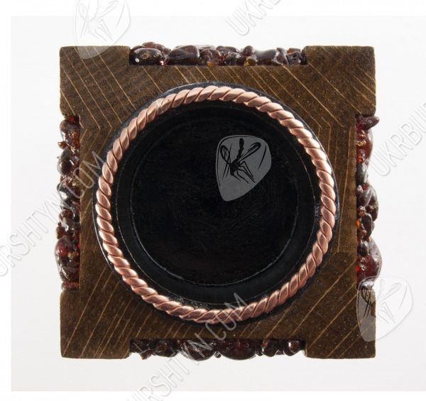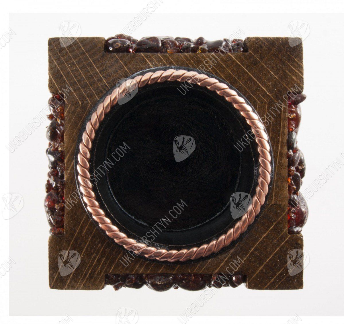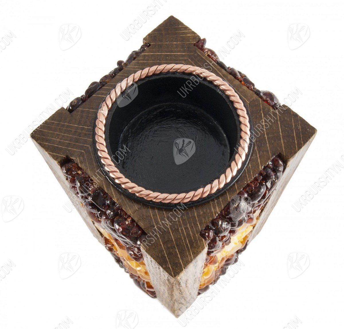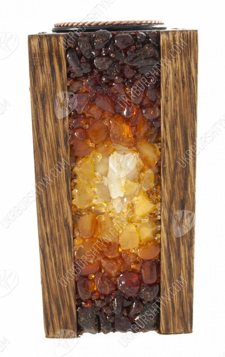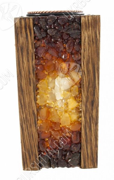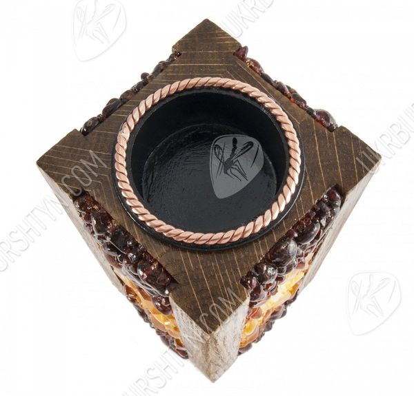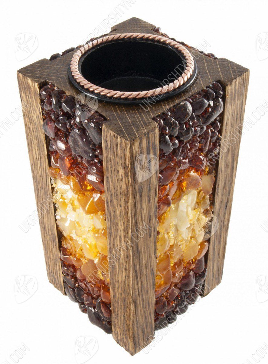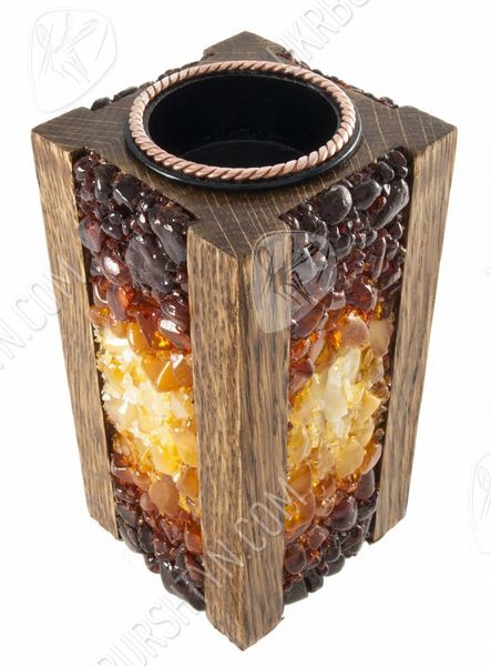 Сделанные качественно и со вкусом предметы интерьера купить сложно, особенно если они необычны и оригинальны. Но наш интернет-магазин изделий из янтаря поможет вам в этом. Только полюбуйтесь на изготовленный мастером подсвечник, умело сочетающий в себе всю привлекательность и самобытность натуральных материалов – дерева и янтаря. Основа из тёмной древесины с хорошо различимым рисунком украшена мозаикой из небольших драгоценных камней. Оттенок самоцветов постепенно меняется от тёмного к светлому, точно нагреваясь от горящего пламени. А подставка для свечи окружена металлом, что позволит вам не волноваться о безопасности, зажигая огонь.