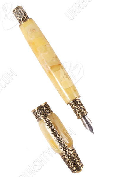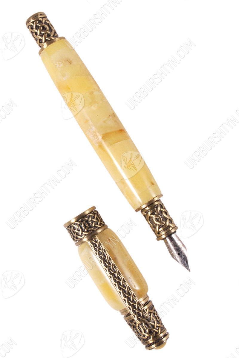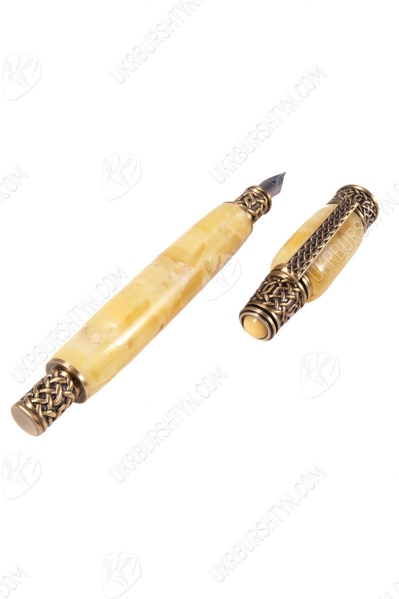 Янтарный корпус имеет насыщенный песочно-медовый окрас. Глянцевая поверхность вместе с деликатными отблесками выстраивает оригинальный акцентный ансамбль. Две секции разделены бронзовыми элементами фурнитуры с черными вставками. Основной орнамент, задействованный в композиции, – плетение. Изделие выглядит сбалансированным и стильным. Такой письменный прибор подчеркнет высокий статус и проработанный имидж своего владельца.