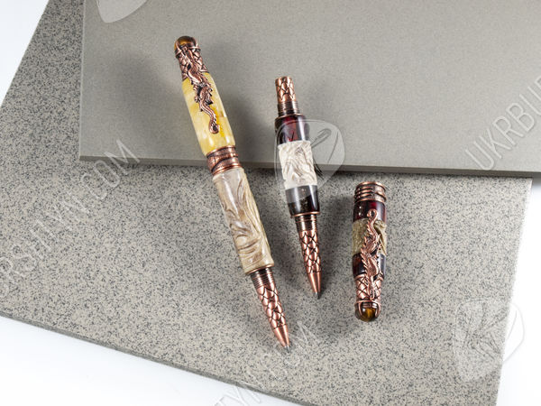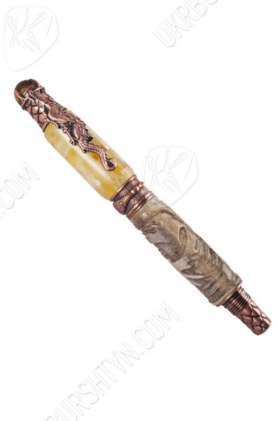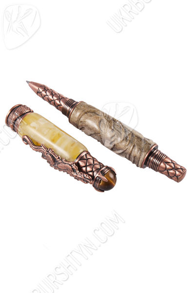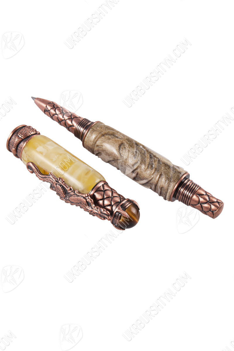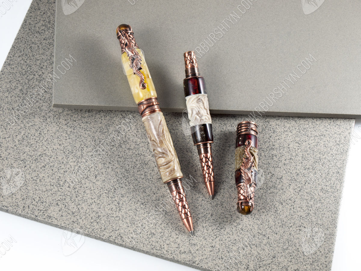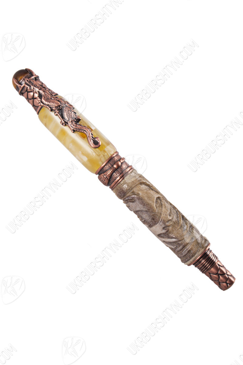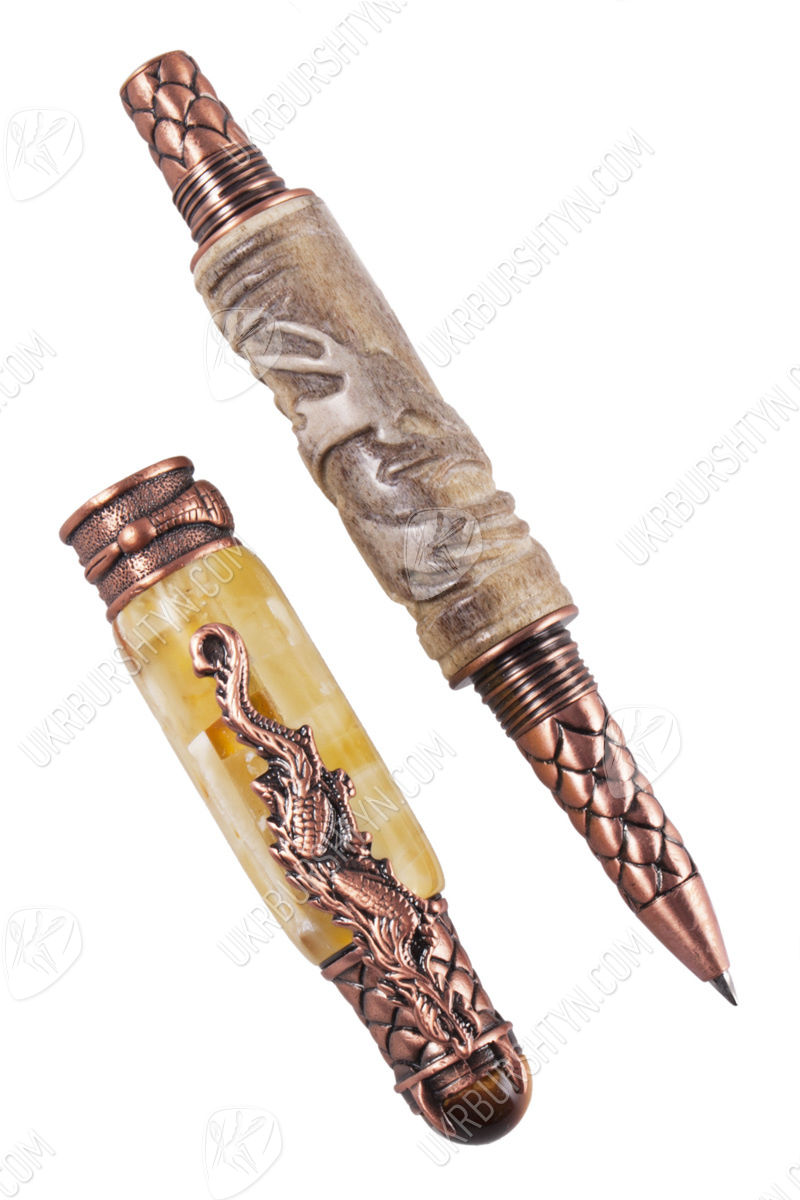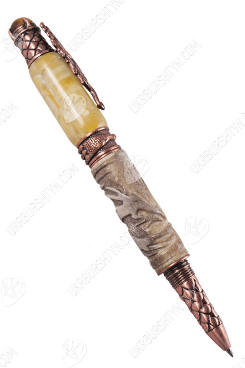 В магазине декора и разнообразных украшений из природного минерала Вы можете купить замечательные картины, поражающие воображение подсвечники и настоящие деревья с дорогими самоцветами разных оттенков вместо листьев, а также VIP-подарки для руководителей. Отличным презентом для большого босса и любимого начальника станет отделанная янтарем ручка с включением оленьего рога, украшенного диковинной резьбой. Молочно-желтый камень в комбинации с бледно-серой роговой пластиной и бронзовой фурнитурой выглядит очень стильно и солидно. Изделие декорировано фигуркой дракона и стилизованной чешуей.
