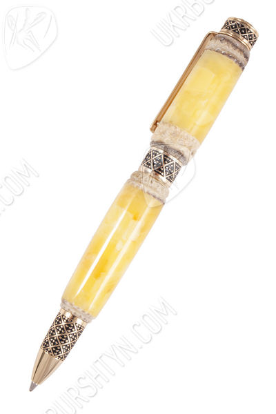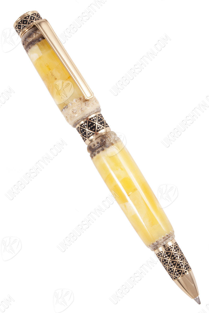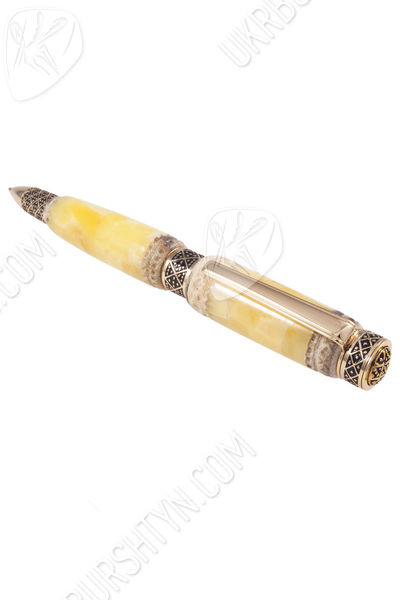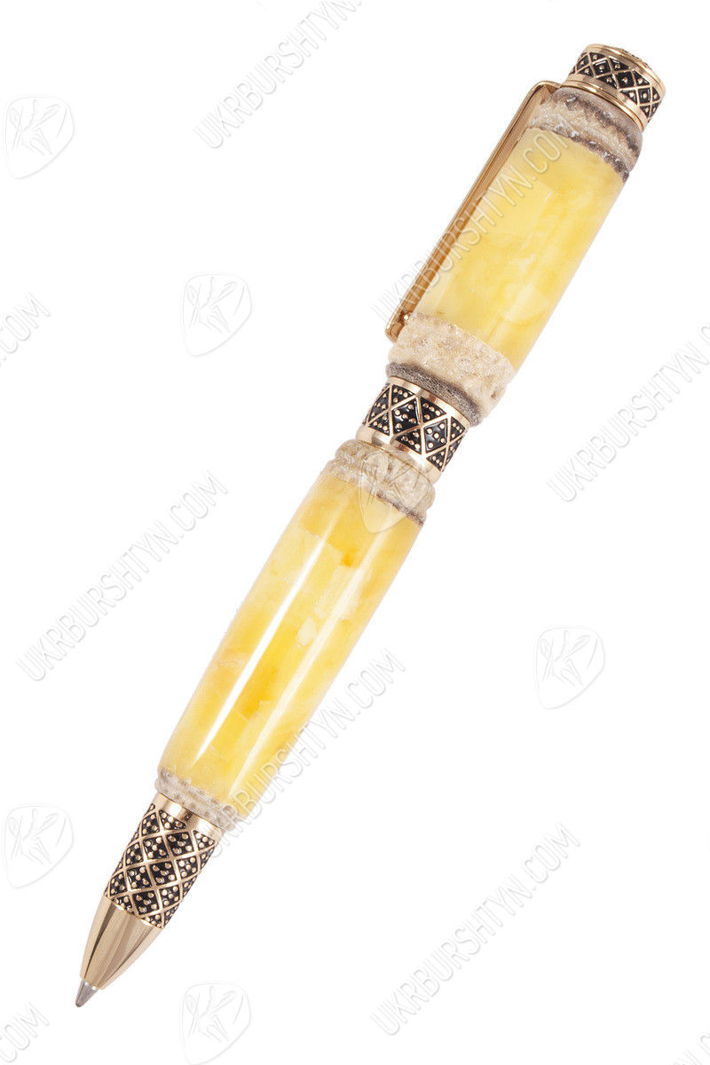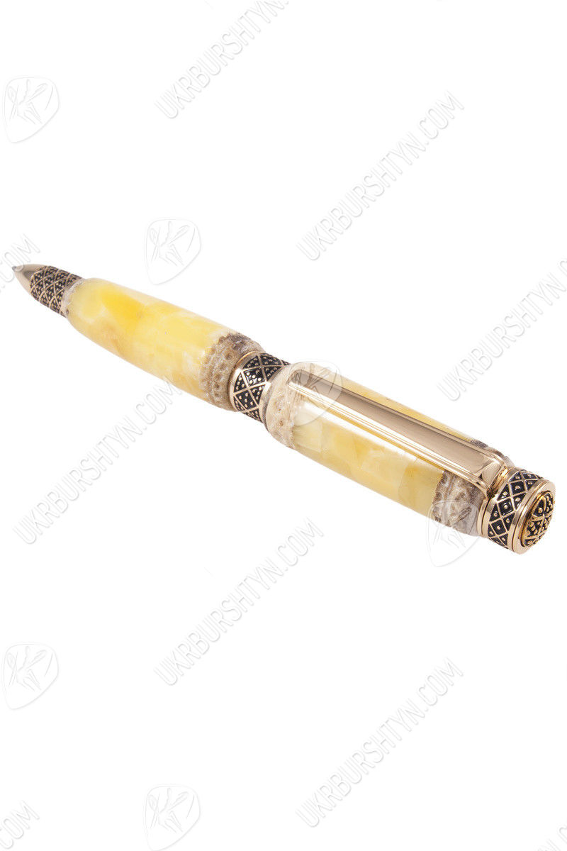 Изделие с резным рогом выигрышно сочетает в себе практичность и эстетику. Две крупные лимонно-сливочные части корпуса соединены черно-золотистым фрагментом фурнитуры. Узкий носик и плоская верхушка выполнены в едином геометрическом узоре. Заметные золотые отблески отлично дополняют естественную красоту янтарной основы. Чернило не вытекает из наконечника, так что нужды в дополнительном колпачке нет. Письменный прибор прекрасно помещается в ладонь; невероятно удобен в применении.