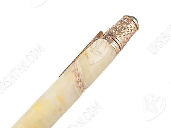 Представленная шариковая ручка – роскошный подарок юристу и не только. Милый презент подойдет женщине руководителю и даже юной девушке, мечтающей об ошеломительной карьере. Столь необычный презент вдохновит на плодотворную работу, воплощение смелых идей. Корпус выполнен из натурального янтаря нежного жемчужного оттенка. Дополнен эффектным плетением оттенка слоновой кости из рога косули. На позолоченной фурнитуре повторяются похожие узоры. Композиция целостная, а само изделие смотрится красиво и по-современному. Авторская работа принесет удачу и благополучие. Сувенир подчеркнет индивидуальность и наличие эстетического вкуса.