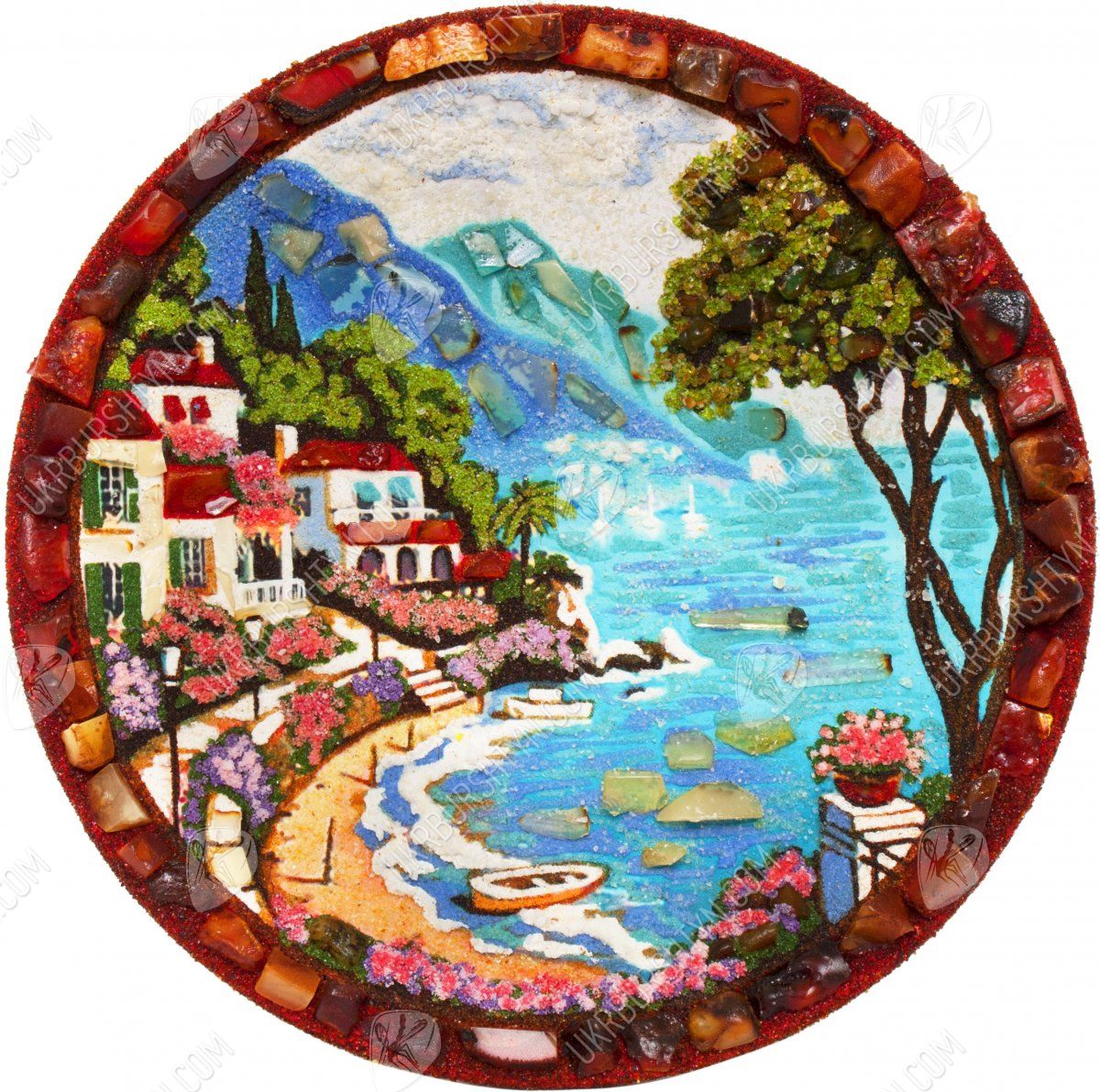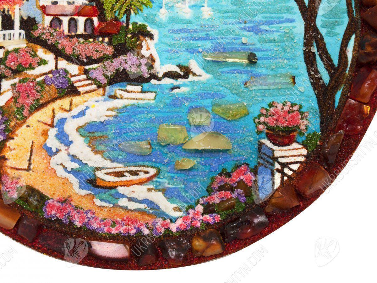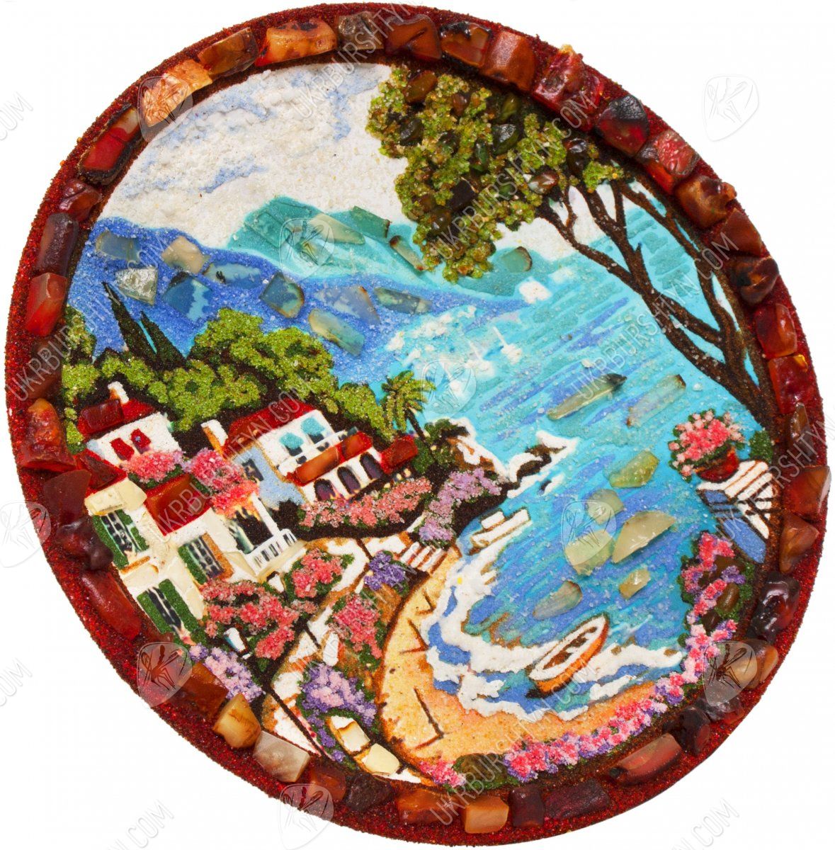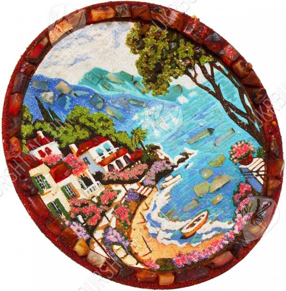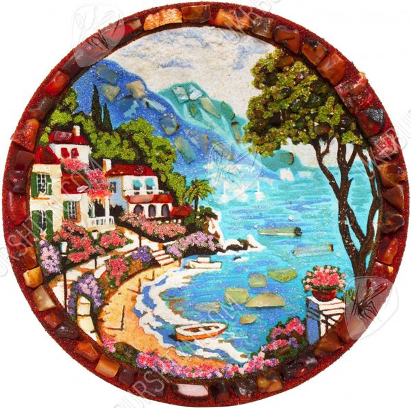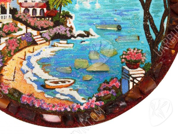 В рамку из тёмно-коричневых и терракотовых полесских самоцветов заключена яркая панорама морского берега. Высыпанный из каменной крошки город – белые дома с алыми черепичными крышами – искрится и сияет под Солнцем, а вокруг него простирается уютный парк и набережная, усаженная цветущими кустами. Воды залива, где покачивается лодка, и далёкие горы украшены цельными кабошонами – они придают изображению рельефный и объёмный вид.