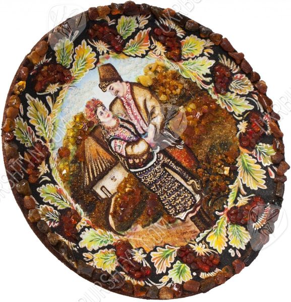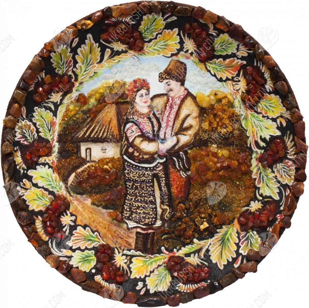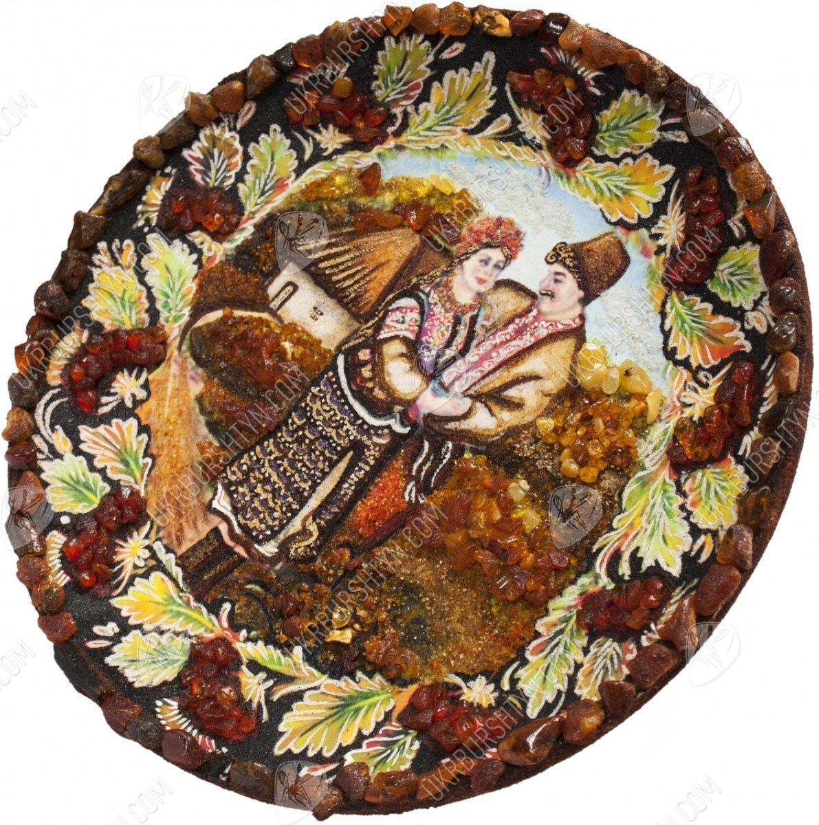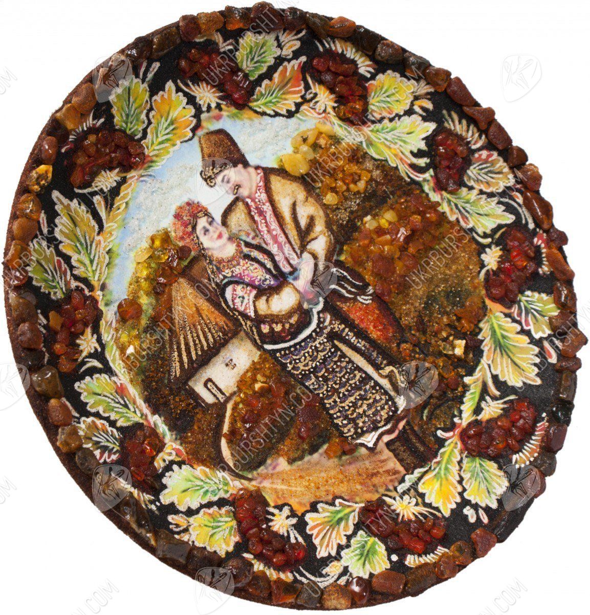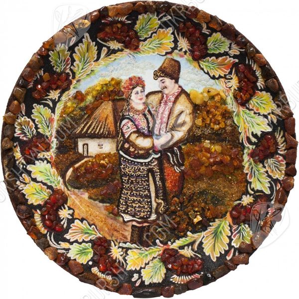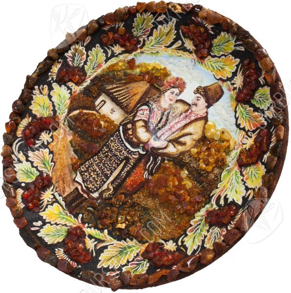 Прощание девушки с воином – распространённый сюжет дум и баллад. Но подобная народная тематика встречается и в других произведениях – взять хотя бы этот аксессуар, созданный по мотивам традиционных росписей. Мастер изобразил казачку и казака, наряженных в вышиванки и жупаны. Каменная крошка позволила передать даже узор на сорочках и плахте женщины! Фигуры оттеняет пейзаж из кусочков полесского янтаря, которые сияют оранжевыми и коньячными бликами, а также орнамент из переплетённых гроздьев калины. Такие тарелки декоративные на стену – интернет-магазин может предложить Вам и другие работы, которые гармонично дополнят коллекцию – находка для тех, кто ценит историю и культуру своей страны.