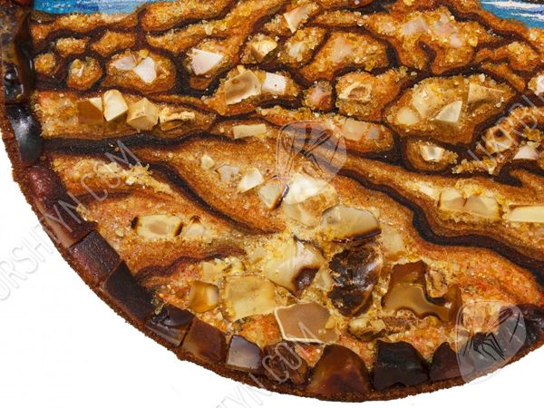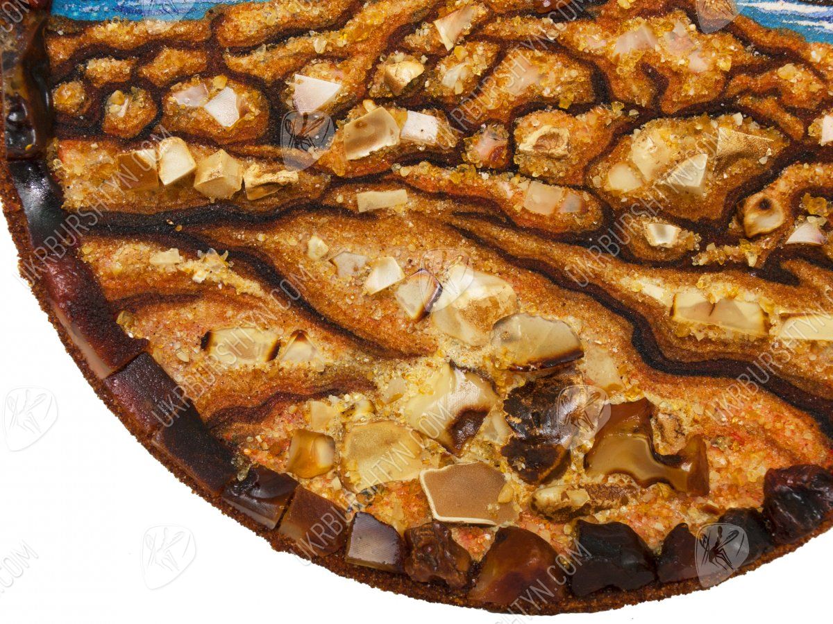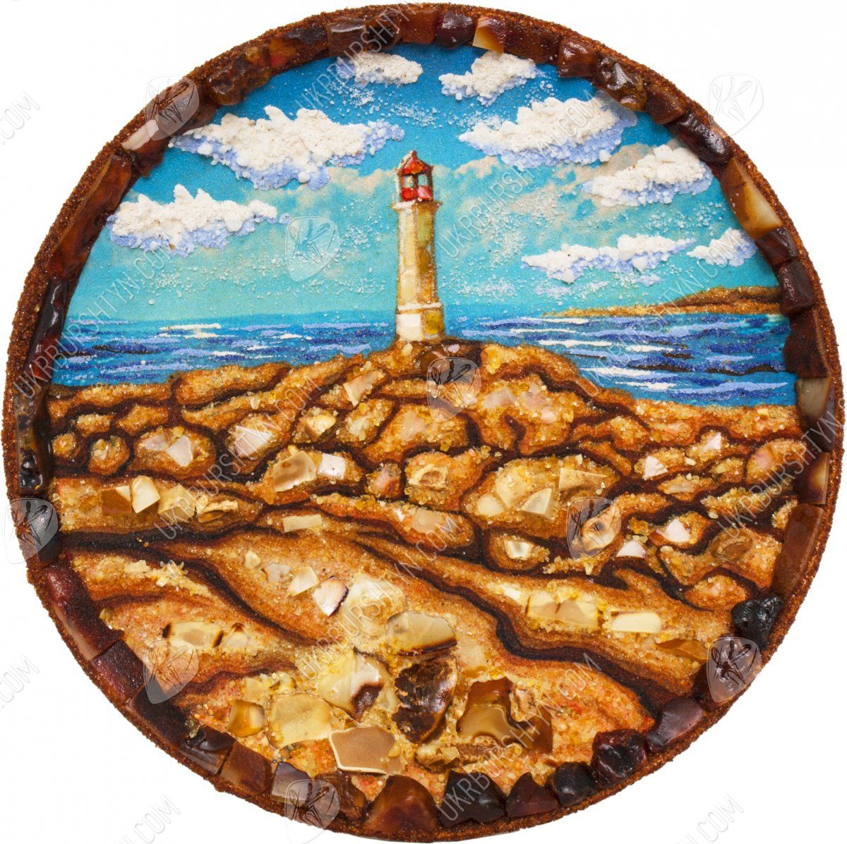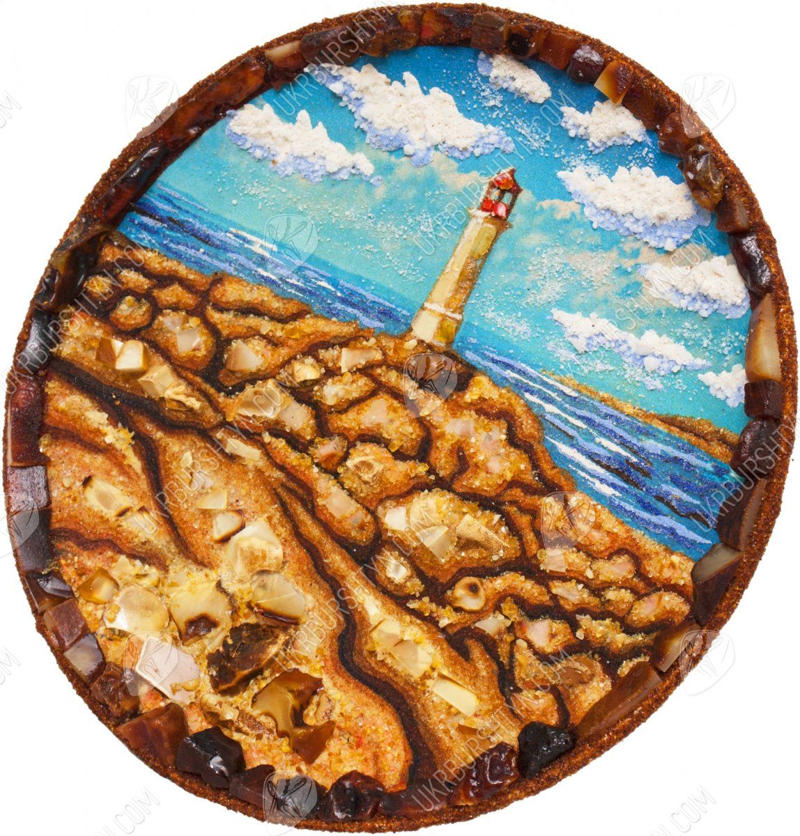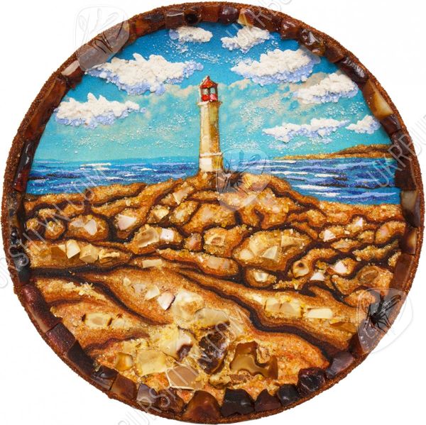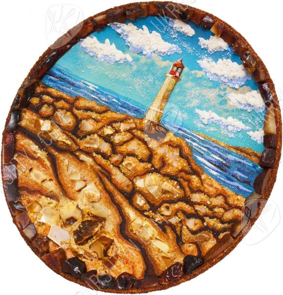 Мастер создал рисунок из мелкой янтарной крошки. Пенные гребни волн, плывущие в небе облака, полоска берега на горизонте – всё это выполнено из застывшей смолы и украшено цельными солнечными самоцветами. На переднем плане пейзажа, посреди инкрустированного рельефными кабошонами побережья, высится золотистый маяк с красной башенкой – он указывает путь идущим мимо кораблям. Завершает сувенир рамка из терракотовых и коричневых драгоценных камней.