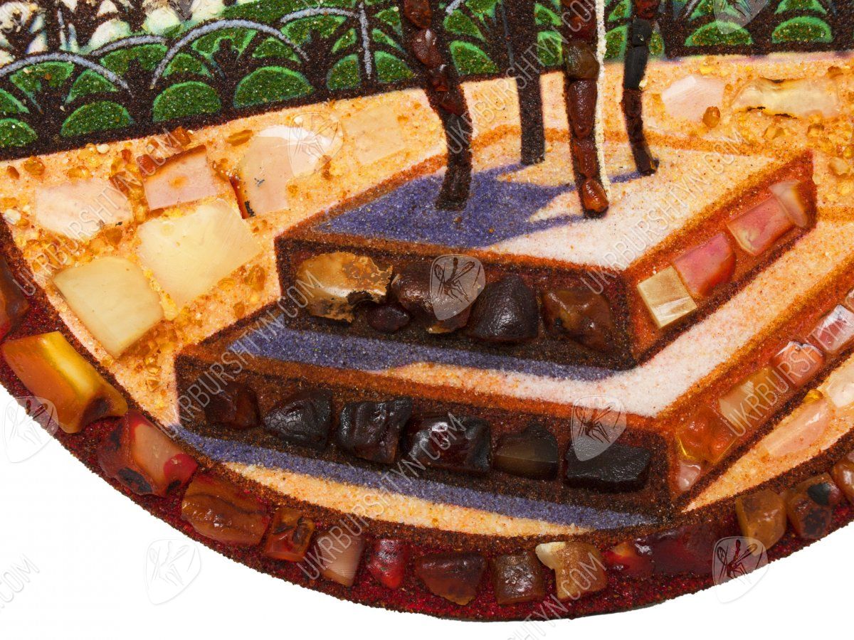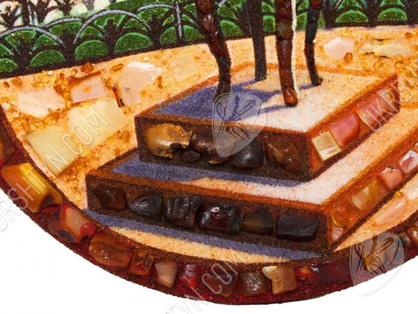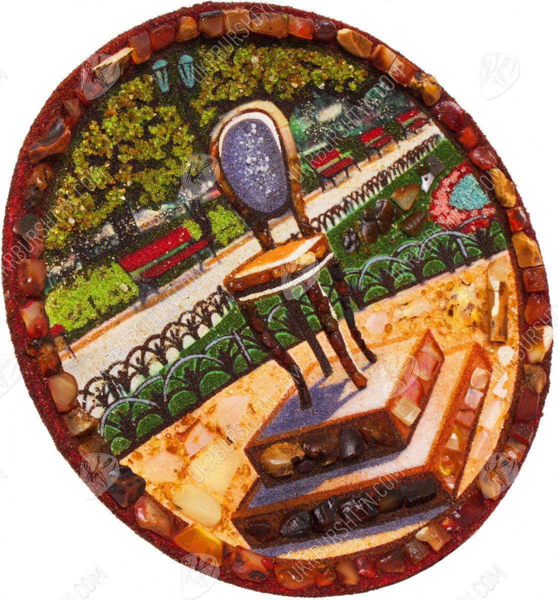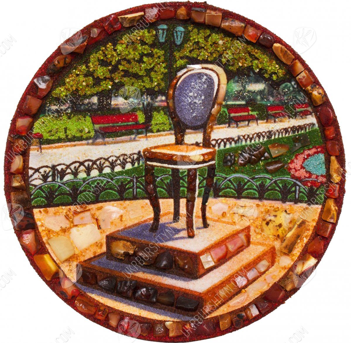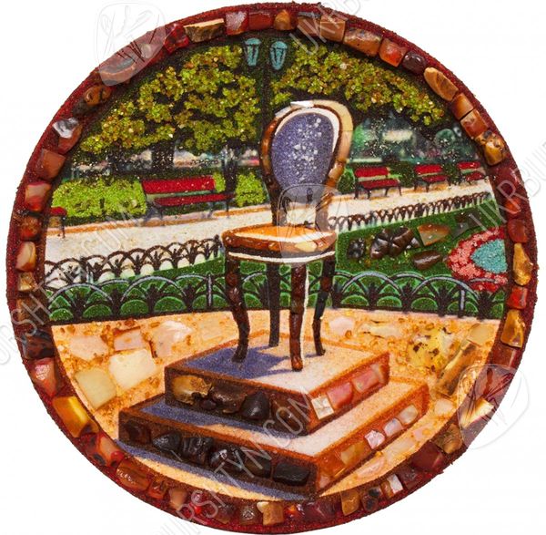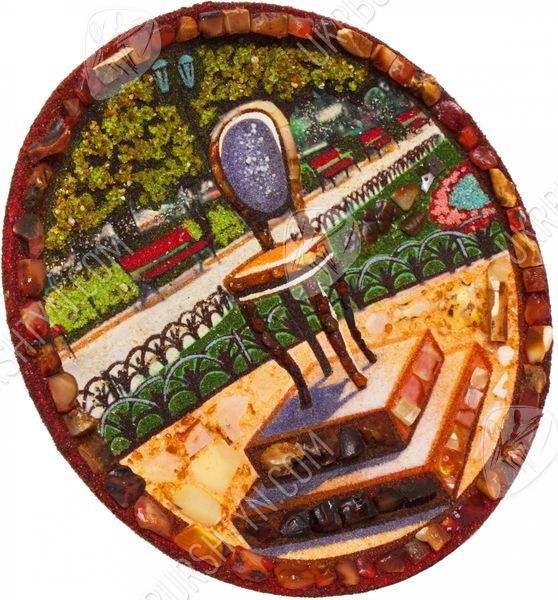 Нравятся нестандартные сувениры? Тогда эта самоцветная тарелка просто создана для Вас! В ней всё – от материала до тематики – выглядит креативно и чрезвычайно привлекательно. На изображении показан памятник И. Ильфу и Е. Петрову – авторам великолепных романов «Золотой телёнок» и «Двенадцать стульев». Именно этот предмет мебели, за которым охотились концессионеры, и увековечил скульптор. А когда наш мастер воспроизвёл оригинальный монумент, используя мелкую янтарную крошку и полесские драгоценные камни, пейзаж засиял новыми красками.