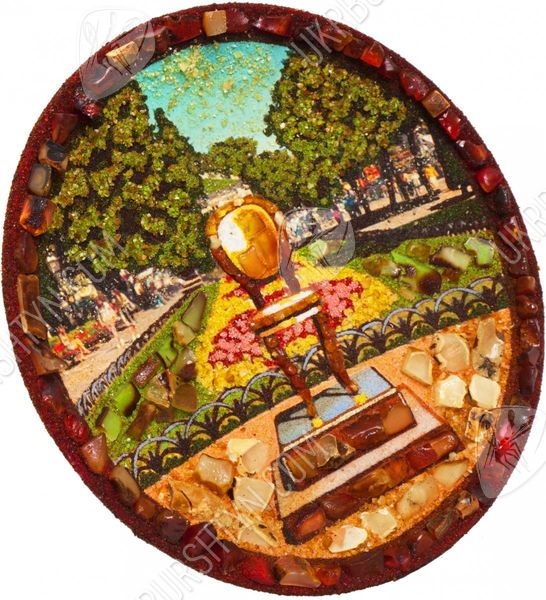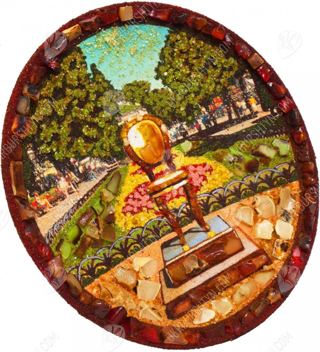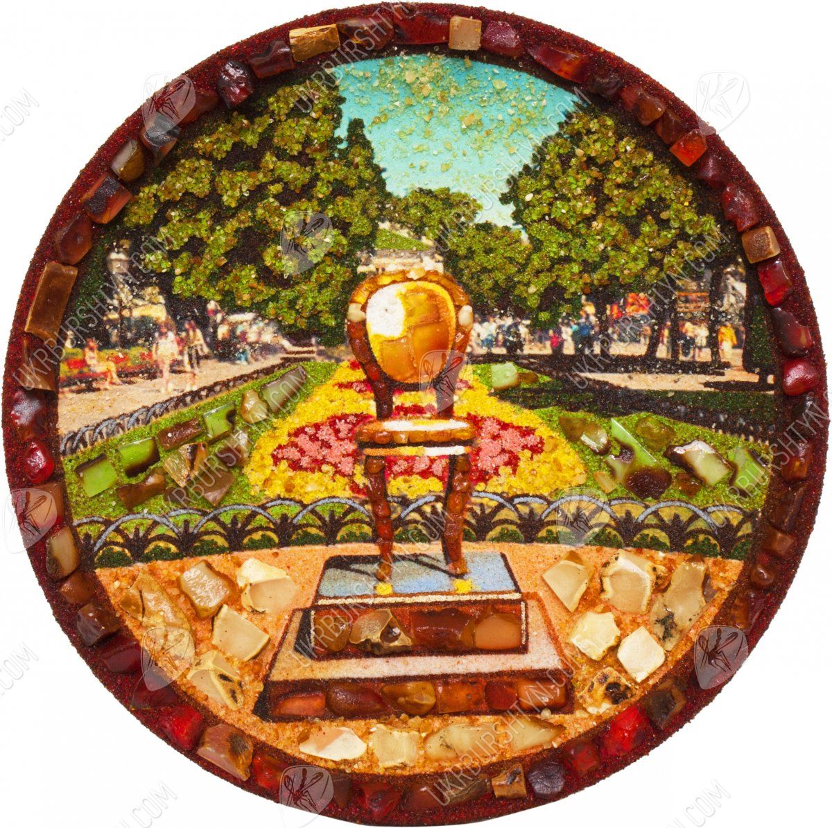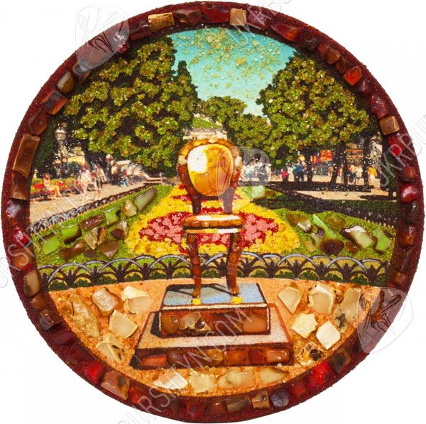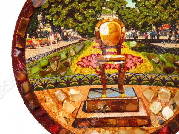 Увлекаетесь творчеством И. Ильфа и Е. Петрова – лучших юмористических писателей ХХ ст.? Оригинальным дополнением к собранию любимых книг станет настенная тарелка, на которой запечатлён памятник соавторам! Палитра полесского янтаря позволила воссоздать всё детали и оттенки пейзажа – пышные кроны деревьев, цветущую клумбу, освещённые жаркими солнечными лучами аллеи Литературного парка. Но центральным элементом изображения является стул – он высыпан из золотистой и терракотовой каменной крошки и украшен цельными кабошонами.