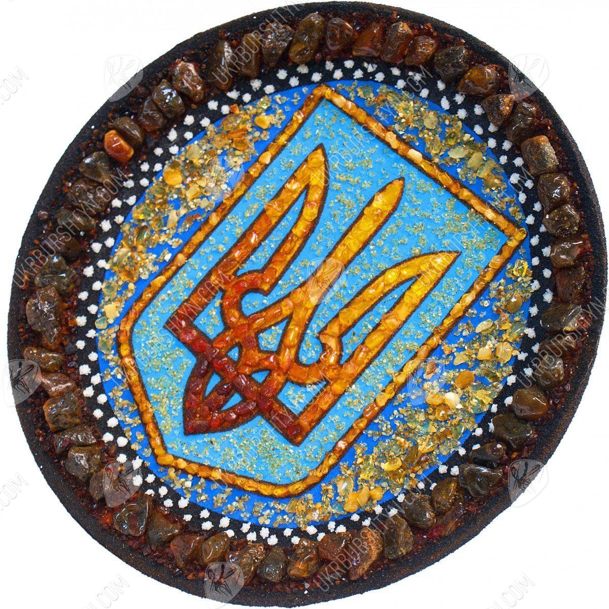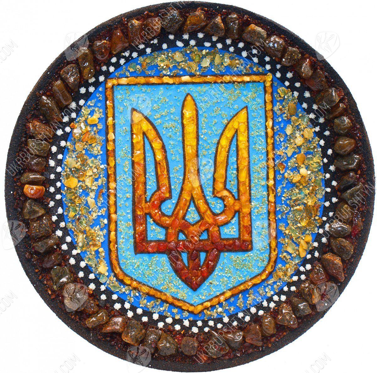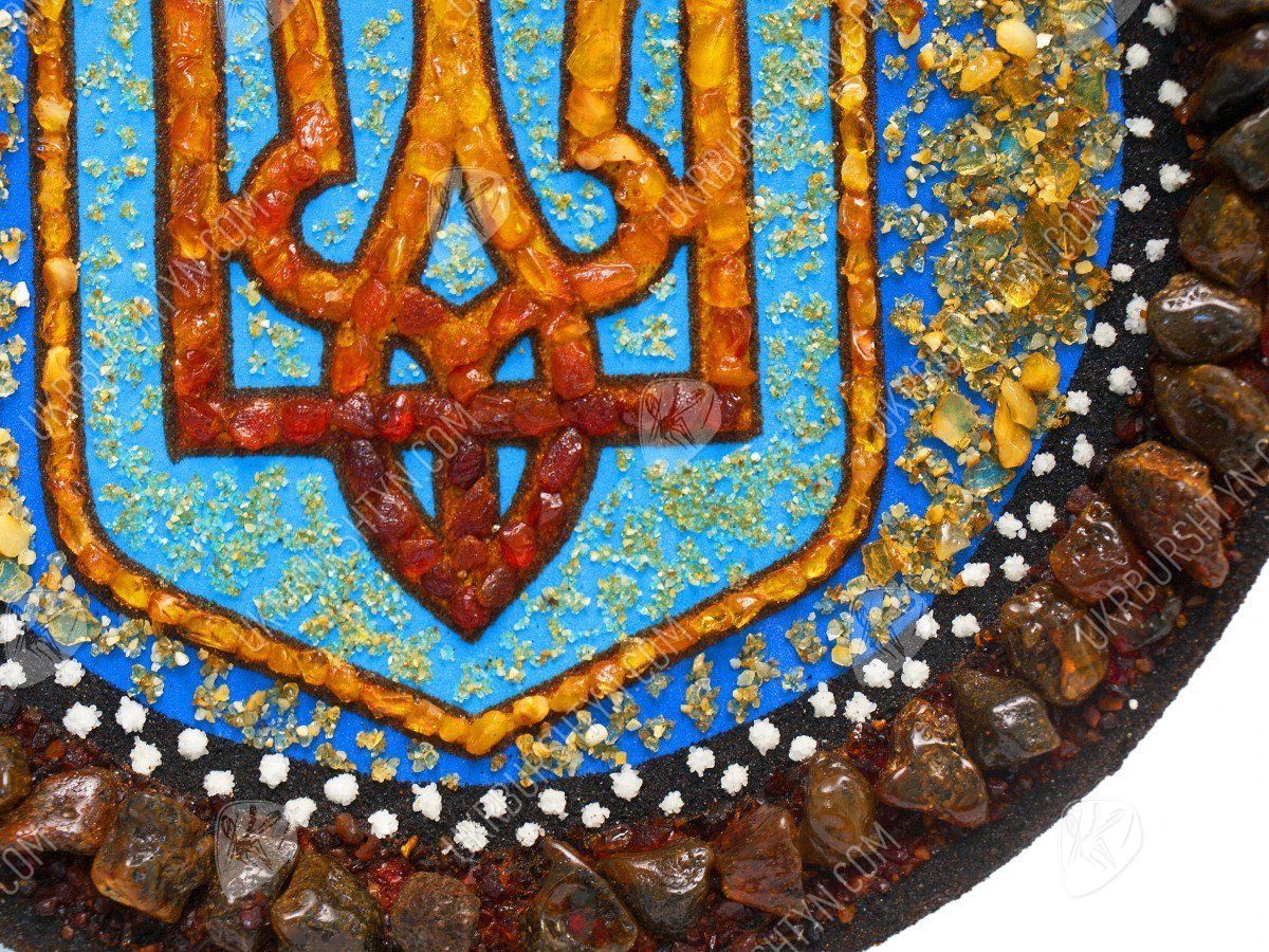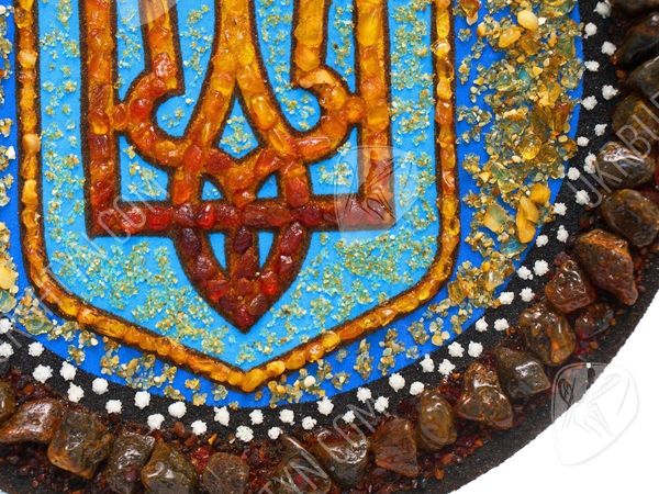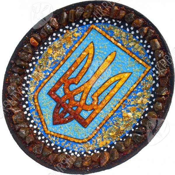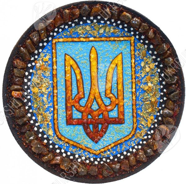 Мечтаете оформить рабочий кабинет в национальном стиле? Тогда не упустите шанс взглянуть на украшенные украинской символикой декоративные настенные тарелки. Купить их, а также другие произведения схожей тематики, легко – нужно лишь обратиться в интернет-магазин сувениров в Украине. Наши мастера постоянно создают оригинальные изделия, и на этой странице Вы видите превосходный образчик таких работ. Тризуб выложен из цельных полесских самоцветов – их тона подобраны таким образом, что Герб постепенно меняет тон от солнечно-жёлтого до насыщенного терракотового. Такую расцветку гармонично оттеняет лазурный фон, усыпанный янтарной крошкой. А завершает сувенир рамка из коричневатых камней.