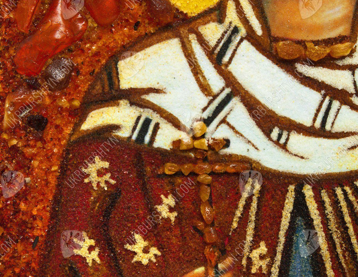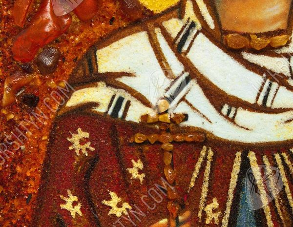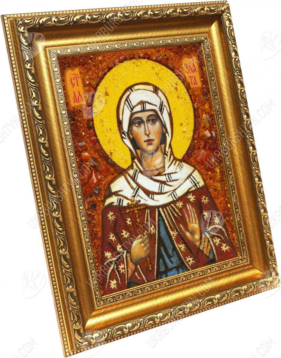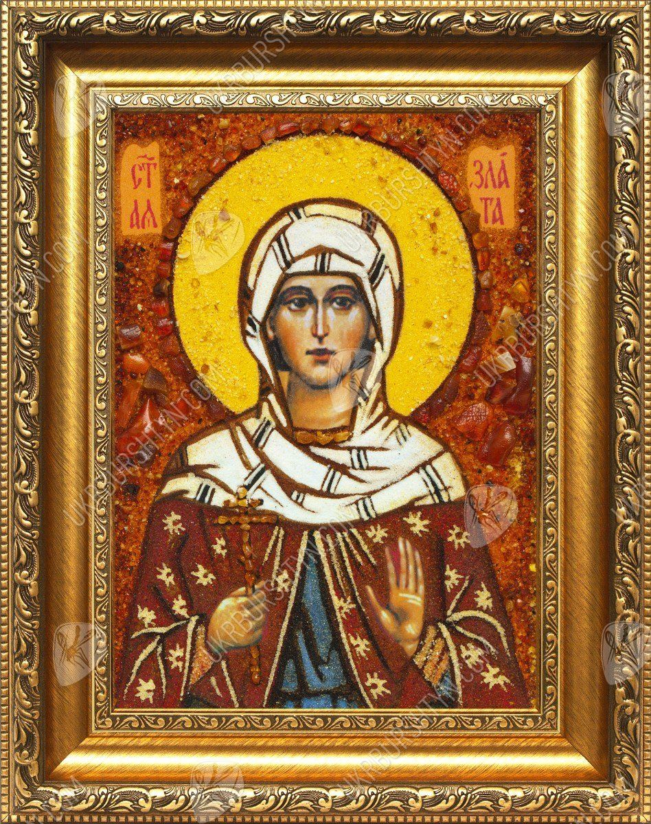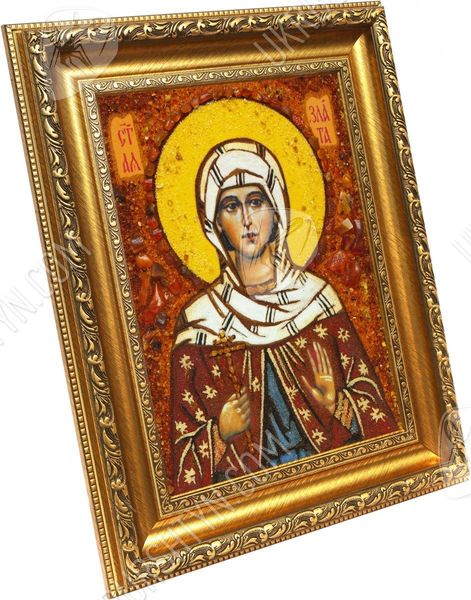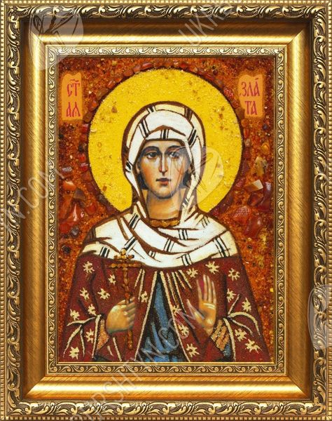 Болгарія прославилася багатьма праведниками та подвижниками. Серед них і свята, якій присвячена ця іменна ікона з бурштину – Злата Могленська. З дитинства вона вирізнялася надзвичайною твердістю у вірі, цнотливістю та силою духу. Коли язичник-турок спробував спокусити дівчину, щоб змусити її прийняти мусульманство, вона не піддалася ані на вмовляння, ані на погрози, не злякалася навіть найважчих тортур.