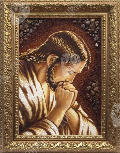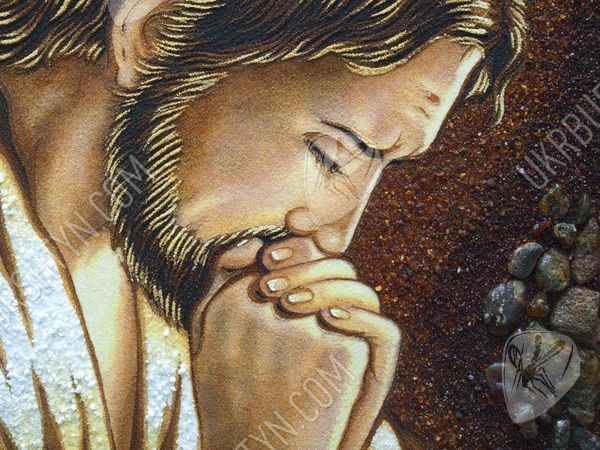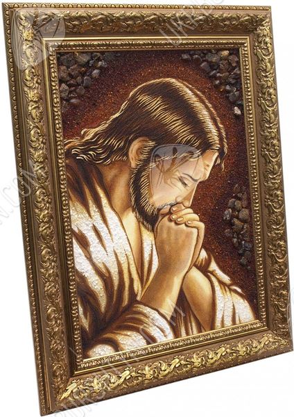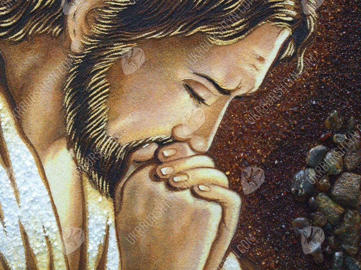 Майстер показав Спасителя у момент молитви – Його лик виглядає натхненним, умиротвореним та спокійним. Гармонійне поєднання цільних поліських самоцвітів та різнобарвної кам’яної крихти надало виробу мальовничості, виразності і рельєфності. Саме тому, схиляючись перед реліквією, Ви зможете проказати найщиріші слова вдячності, висловити ревні прохання до Господа, виховати в собі істинно християнські чесноти, попередити сварки та конфлікти, позбутися від спокус і нечестивих думок.