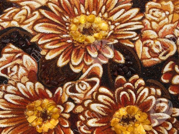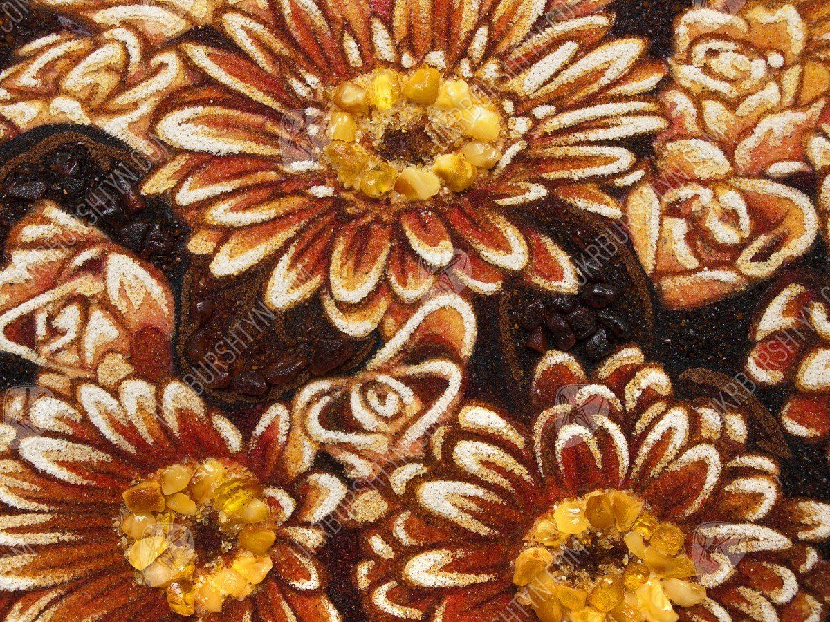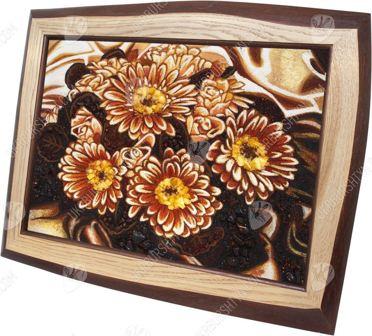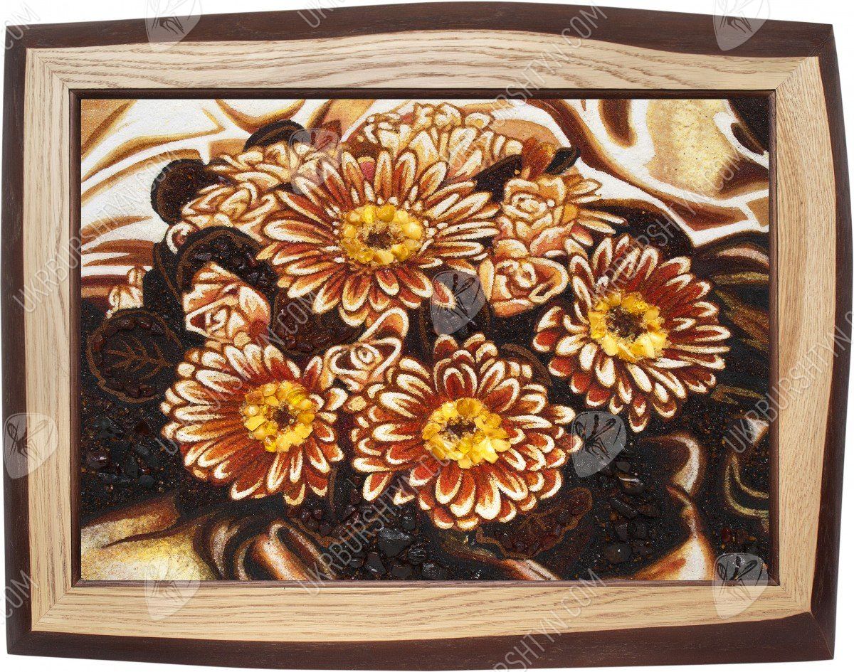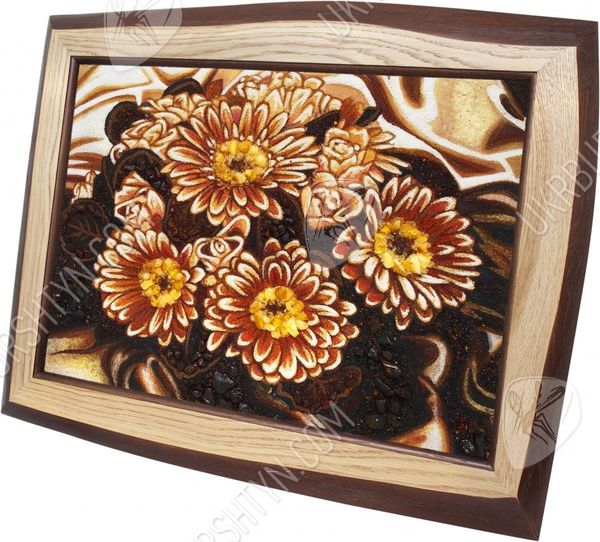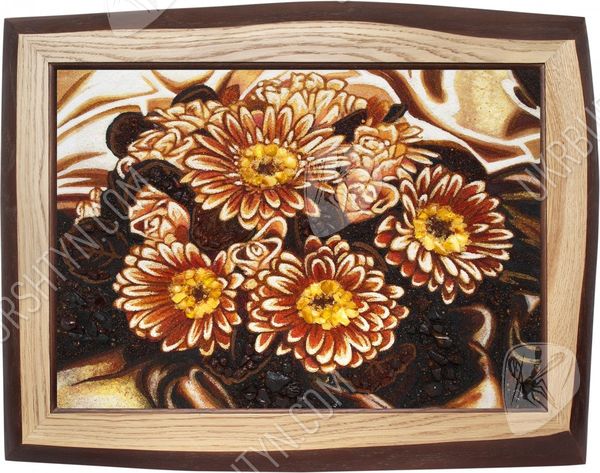 Необхідні картини для вітальні, оформленої в класичному або модерновому стилі? Можливо, Вам сподобається це ексклюзивне панно «Букет», витримане у приємній пастельній гамі! Ніжні хризантеми із самоцвітної крихти виглядають майже живими – майстер відтворив і гру світла та тіней на м’яких пелюстках, і об'ємні серцевини кожної квітки, і багаті переливи сяючого атласу, на якому лежать чудові рослини. А інкрустація з теракотових, брунатних та шафранових дорогоцінних каменів лише посилює враження, яке виникає при спогляданні.