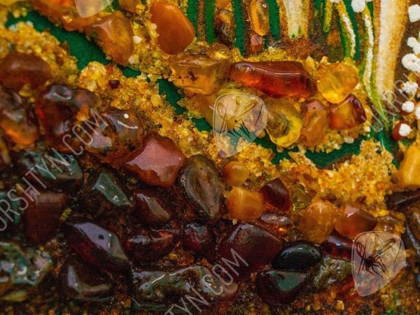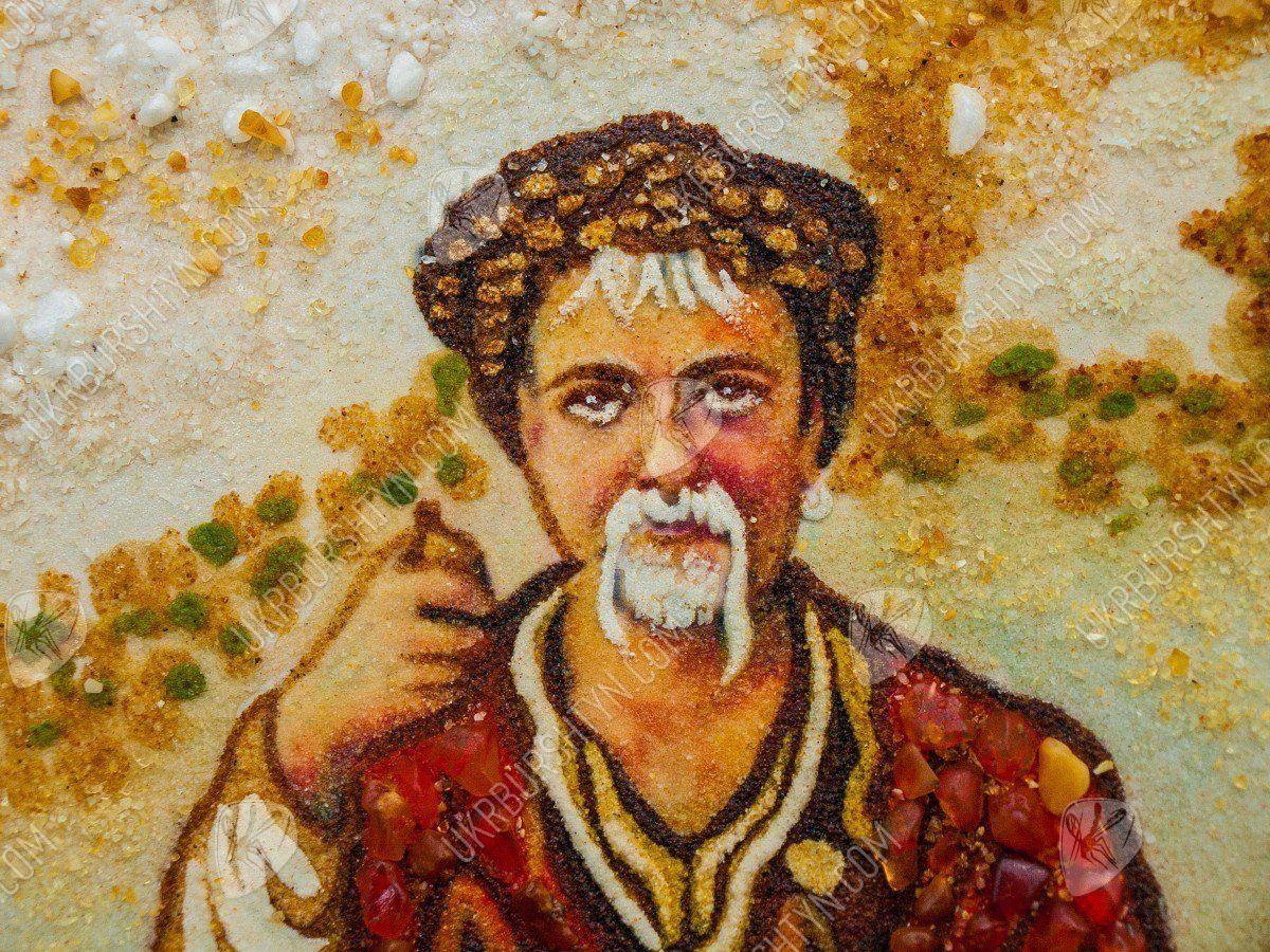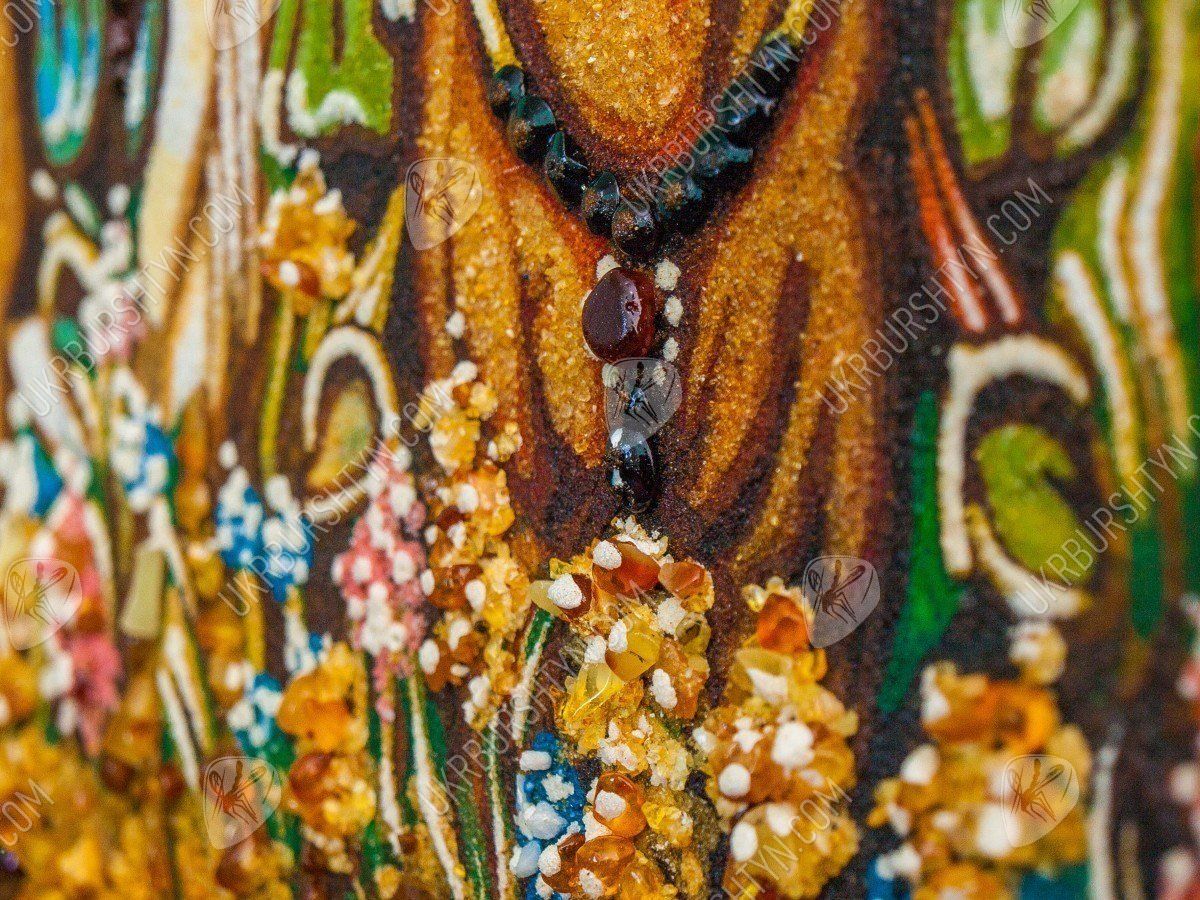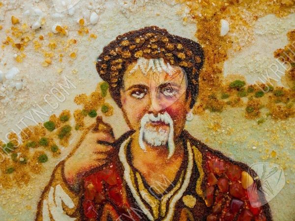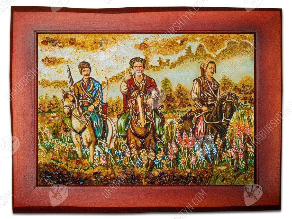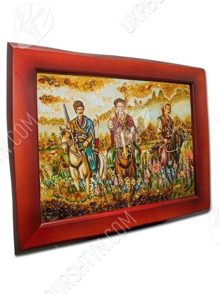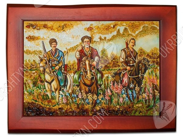 Донські козаки - етнічна група з самобутніми звичаями, одягом та традиціями. Збереглися картини художників, які намагалися зобразити цей колорит, але мало кому вдавалося зробити це так повно, яскраво і жваво. Саме за такими мотивами і виконане панно з поліського бурштину. Троє воїнів підганяють коней по квітучому полю. Їхній одяг та зброя, а також збруя коней прикрашені цільним камінням, мерехтливими червоними, золотистими, шафрановими і теракотовими іскрами. А дрібна самоцвітна крихта дозволила відтворити навіть вирази облич! Завдяки тому, що продаж картин проводиться через інтернет-магазин, Ви можете самостійно вибрати розмір виробу і рамки.