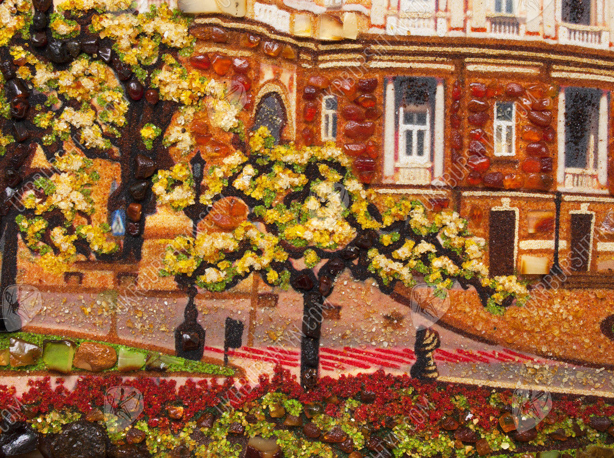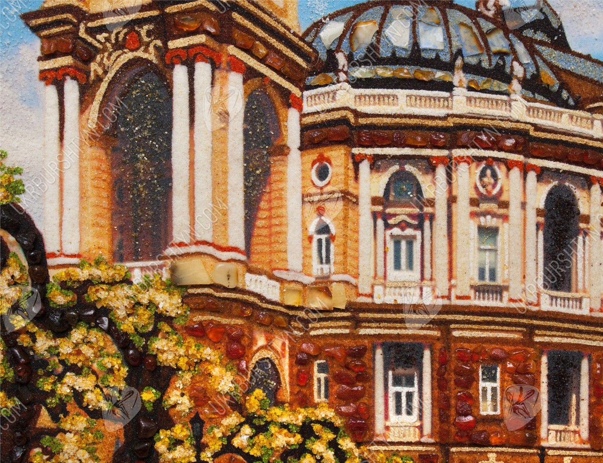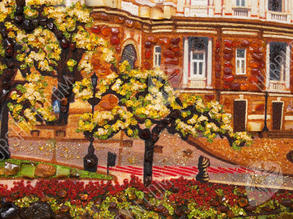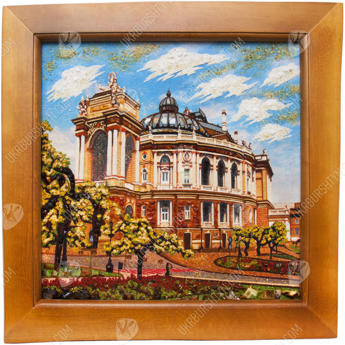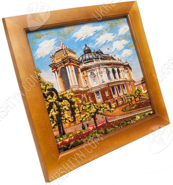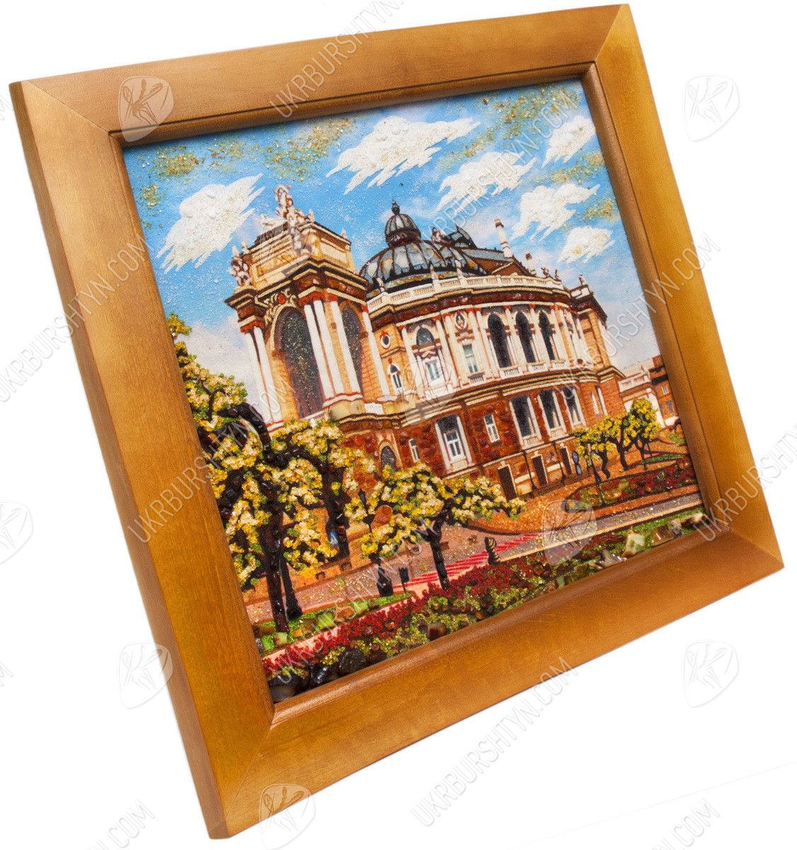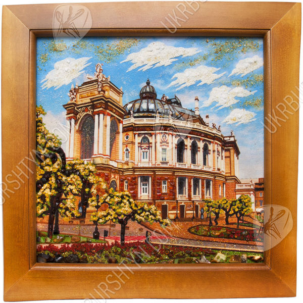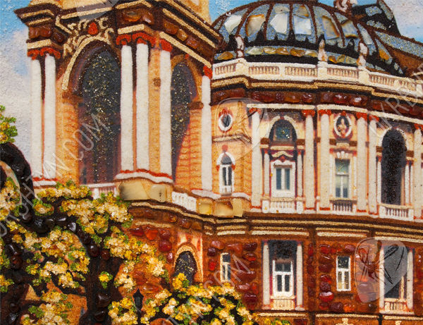 Зокрема, цей мальовничий пейзаж зображує відому пам'ятку Перлини Чорномор'я – Театр опери та балету. Велична будівля з кам'яної крихти і масивних кабошонів промениться рудими, охровими, піщаними, кремовими та коньячними тонами. Не забув майстер і про решту деталей ландшафту – з оливкової та брунатної застиглої смоли висипані дерева, клумби й доріжки, а світло-золотавими самоцвітами інкрустовані хмари, що плинуть небом.