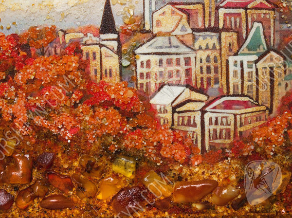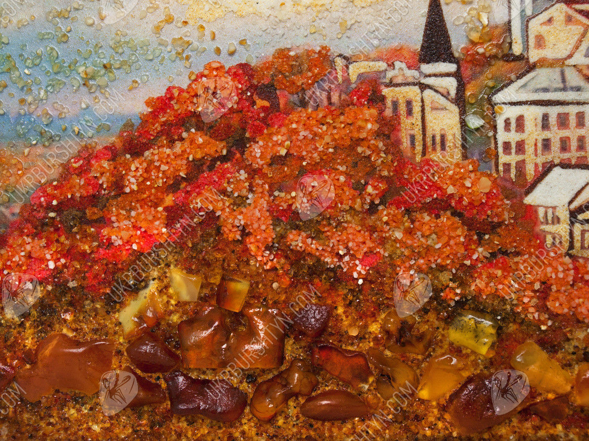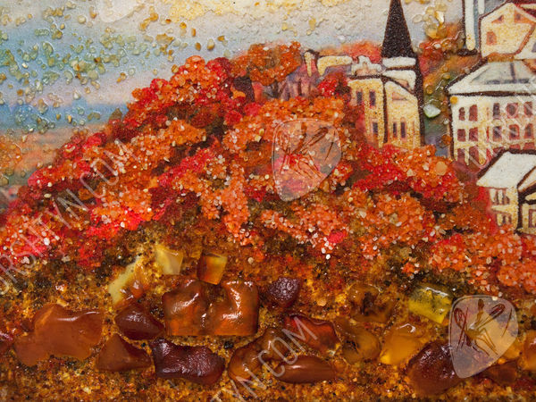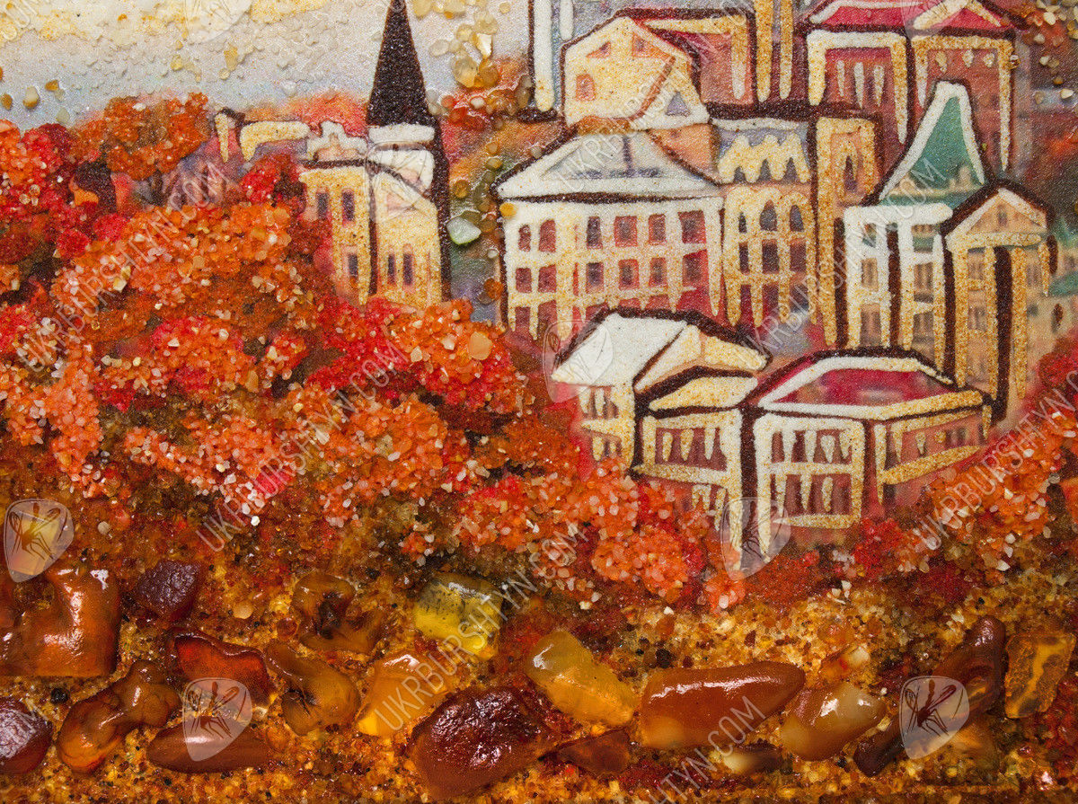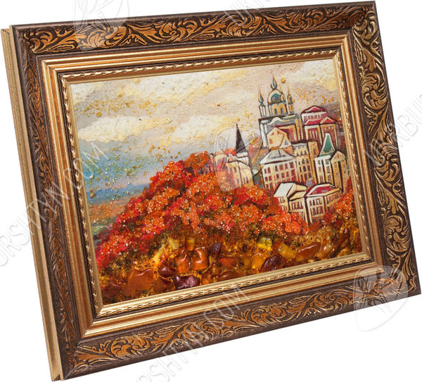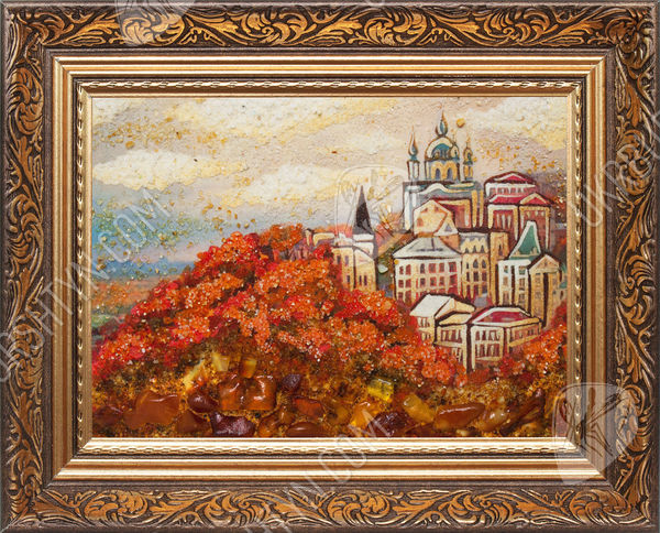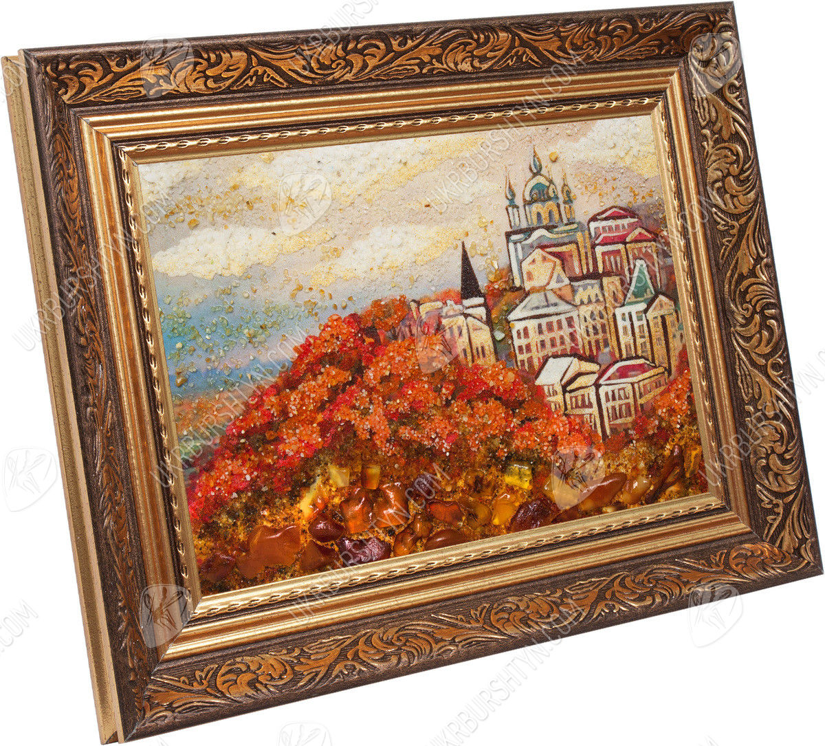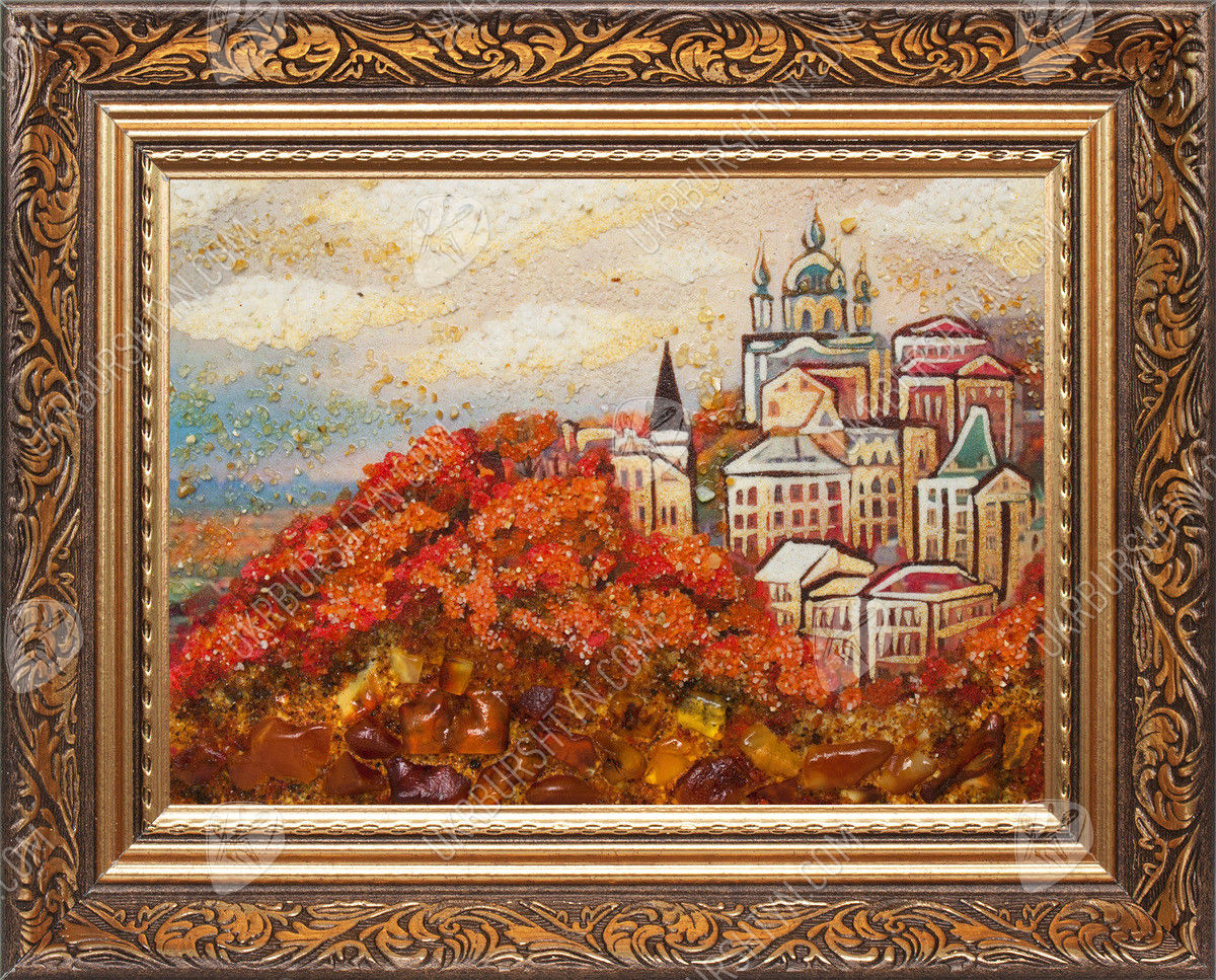 Зображення Києва, який потопає в різнокольоровому осінньому листі, - красиве та яскраве. Храми і будинки купаються в червоно-жовтих фарбах. Розкішні дерева в осінньому вбранні заповнюють майже весь простір картини, а столиця стоїть на пагорбі, на задньому плані. Це зображення, ніби, випромінює світло і нагадує про золоту осінь. Якщо Ви хочете купити картини для інтер’єру, тоді, цей виріб - те, що потрібно. Дивлячись на нього, Ви кожен день будете отримувати заряд позитиву і творчої енергії. Панно наповнить Ваш дім гармонією і теплом.