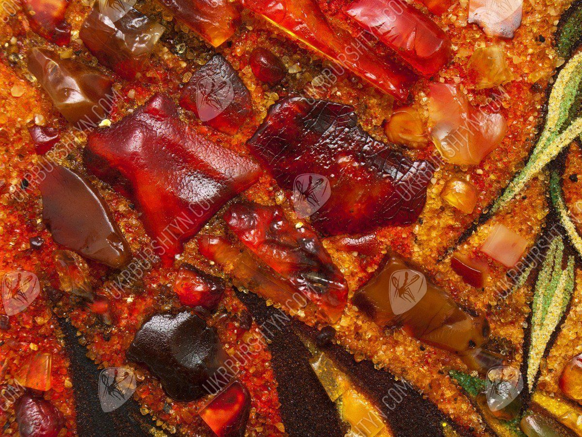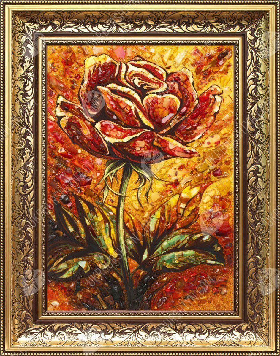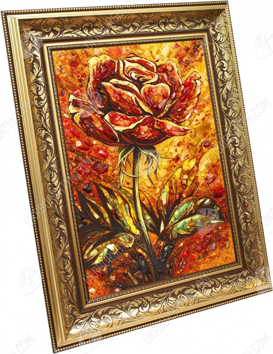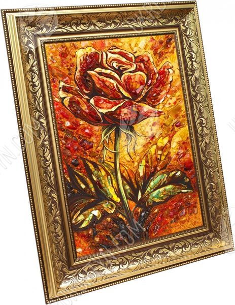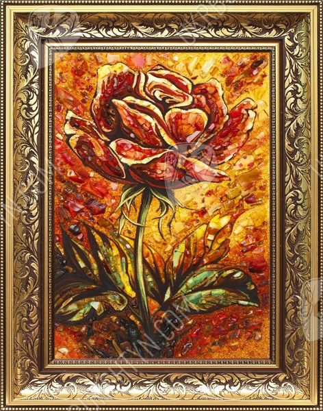 У кожному приміщенні повинен бути центральний акцент - аксесуар, який привертає увагу та об'єднує весь дизайн. В якості такого оригінального і ефектного штриха до інтер'єру Ви можете купити декоративне панно, представлене на цій сторінці. Майстер зобразив розпускаючу троянду, використовуючи червоний, багряний, теракотовий та помаранчевий поліський бурштин. Листя царственої квітки, зроблені з оливково-зелених, смарагдових і коричневих шматочків скам'янілої смоли, вносять в загальну палітру нотку прохолоди та свіжості. Цілісні самоцвіти, якими усипана картина, надають їй об’єм і рельєфність. А кам'яна крихта дозволила передати найтонші нюанси тонів, відтінків та форм.