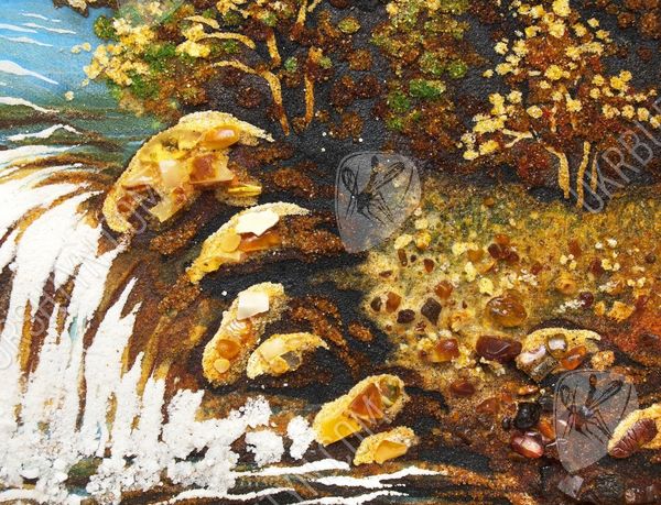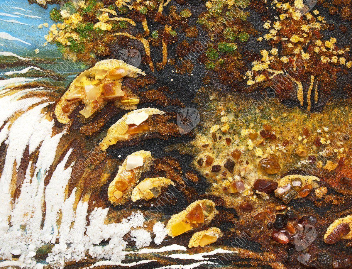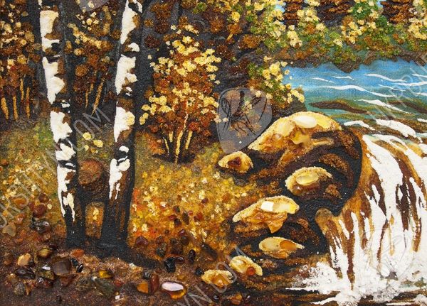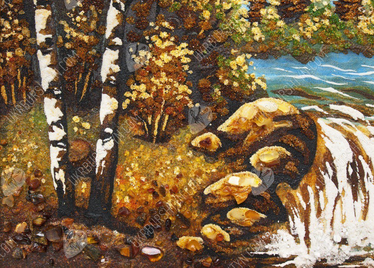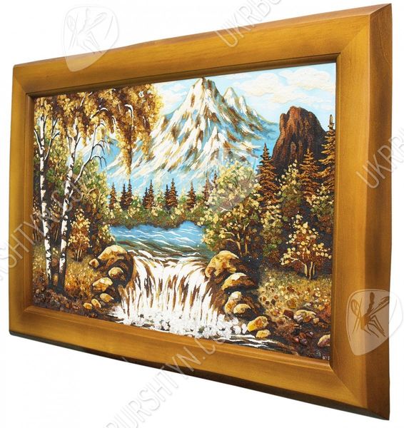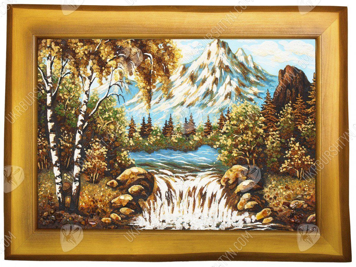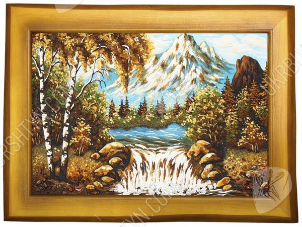 Альпінізм - ризикове захоплення, але все ж воно дарує стільки позитивних емоцій, що люди готові знову і знову долати круті схили та підкорювати неприступні вершини. А скрасити перерви між походами Вам допоможе це самоцвітне панно ручної роботи. З дрібної бурштинової крихти висипана альпійська долина, яка поросла берізками, ялинами і модринами, невеликий водоспад, а також висока засніжена гора, що видніється на горизонті. Цілісні шматочки скам'янілої смоли, якими прикрашене зображення, надають йому об’єм і жвавість. А ще наш інтернет-магазин виконує будь-які копії картин на замовлення - тому Ви зможете підібрати виріб в залежності від своїх уподобань, інтересів та схильностей.