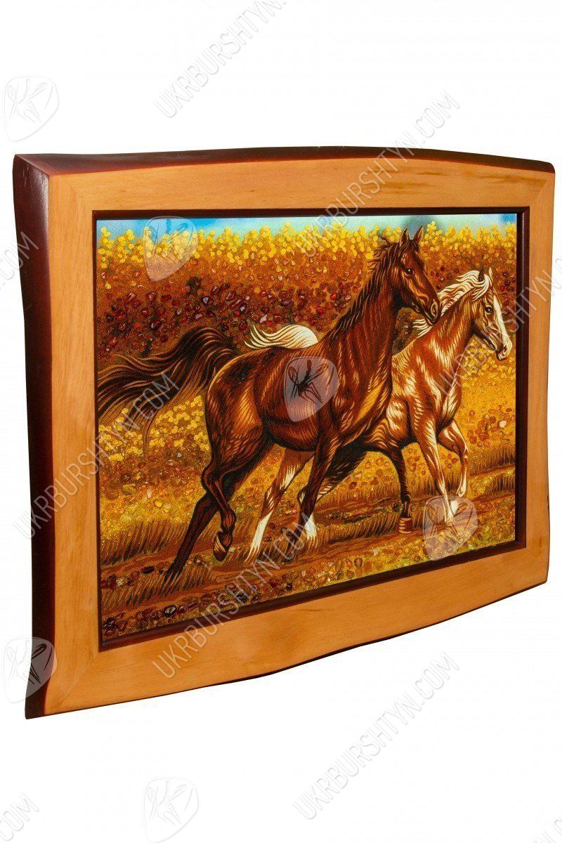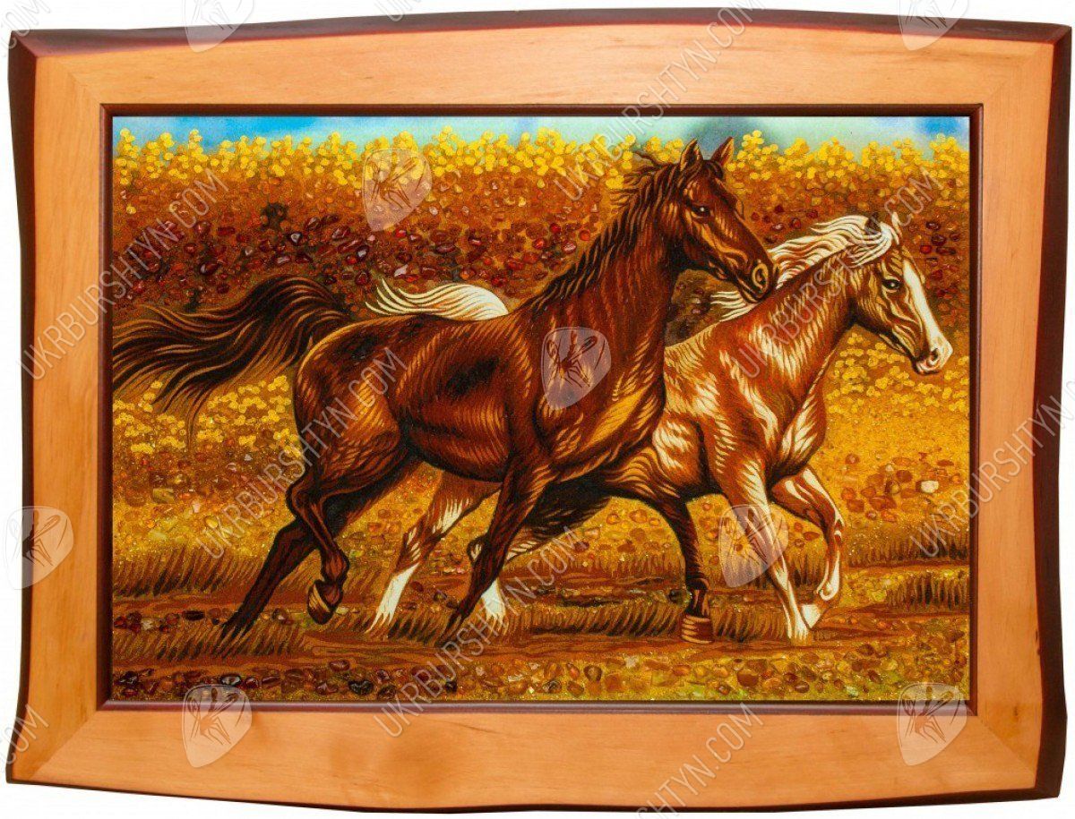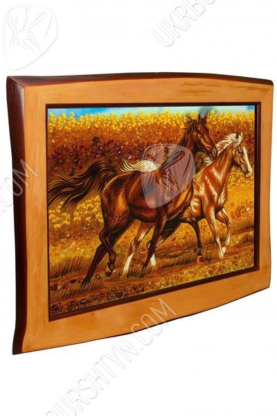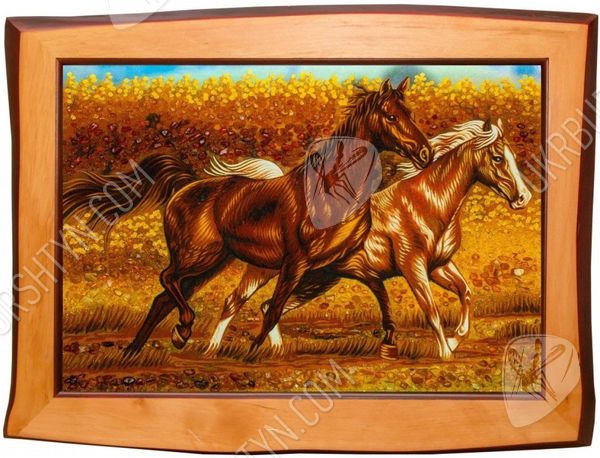 Вся краса полягає в зображенні коней серед мальовничої природи. Їм не потрібно працювати, вони вільні, ніхто їх не прив'язав. Вони можуть бігти куди захочуть. Ці тварини були створені природою саме такими. Шерсть переливається на крупі рисаків. Цей ефект стає ще сильнішим, коли промені сонця торкаються бурштинових самоцвітів і вони з подвоєною силою їх відображають. Зображення тварин завжди залишаються модними. Вони змушують нас згадувати наше коріння і подумати про вічне життя. Ця картина стане відмінним подарунком своєму другу, а також її можна піднести своєму начальнику.