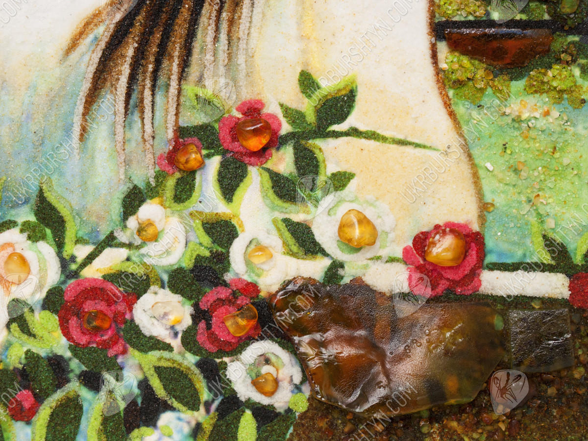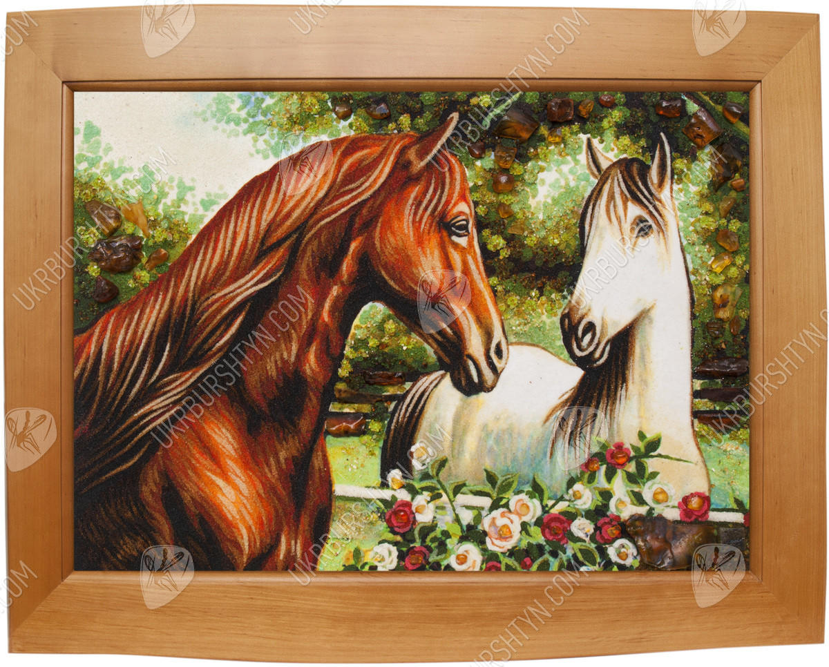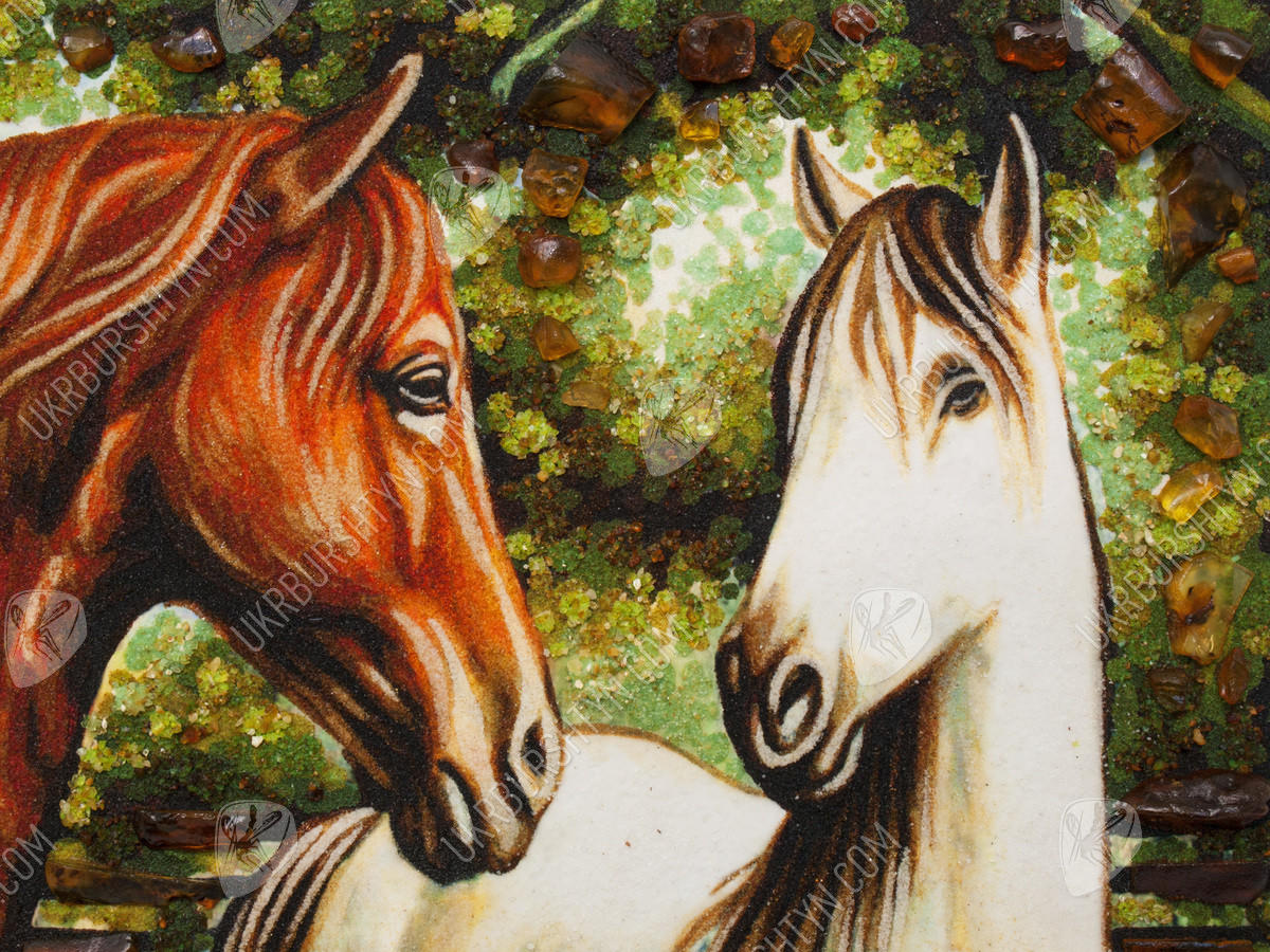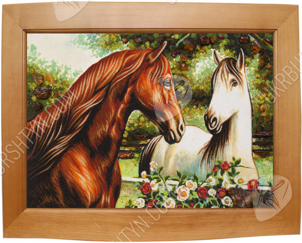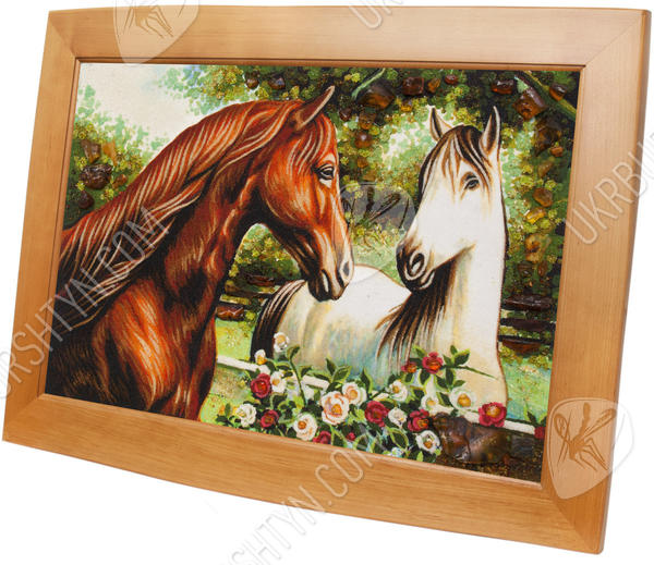 Захоплюєтеся кінним спортом? Або, можливо, вам просто подобаються ці сильні, граціозні тварини? Тоді ви напевно будете раді, дізнавшись, де можна купити картини, що зображують прекрасних та гордих коней. І одним з кращих подібних витворів є це панно. На ньому зображені прекрасні мустанги, що рухаються разом, ніжно та лагідно дивлячись один на одного. Майстер виклав з бурштину їх шкури, які виглядають бархатистими і ніжними завдяки вмілому використанню високоякісної самоцвітної крихти. Здається, що ось-ось коні рушать з місця, зафиркають і помчать вдалину. Ця картина прекрасно впишеться в інтер'єр вітальні.