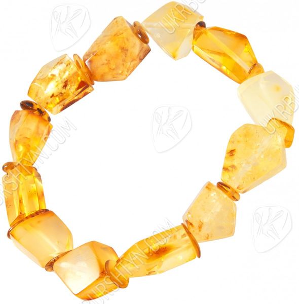 Браслет зі світлого бурштину ручної роботи складається з незграбних каменів неправильної форми, розділених між собою дрібними намистинами-камінчиками під колір основних каменів. Світлий, жовтуватий колір прикраси буде гармоніювати з одягом теплої колірної гамми (жовтим, коричневим, помаранчевим) і виграшно виглядатиме влітку на сонці. Янтар переломлює сонячне світло і розсіює промені, створюючи навколо себе ауру теплого, м'якого світіння.
