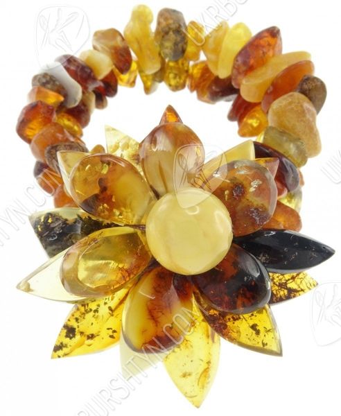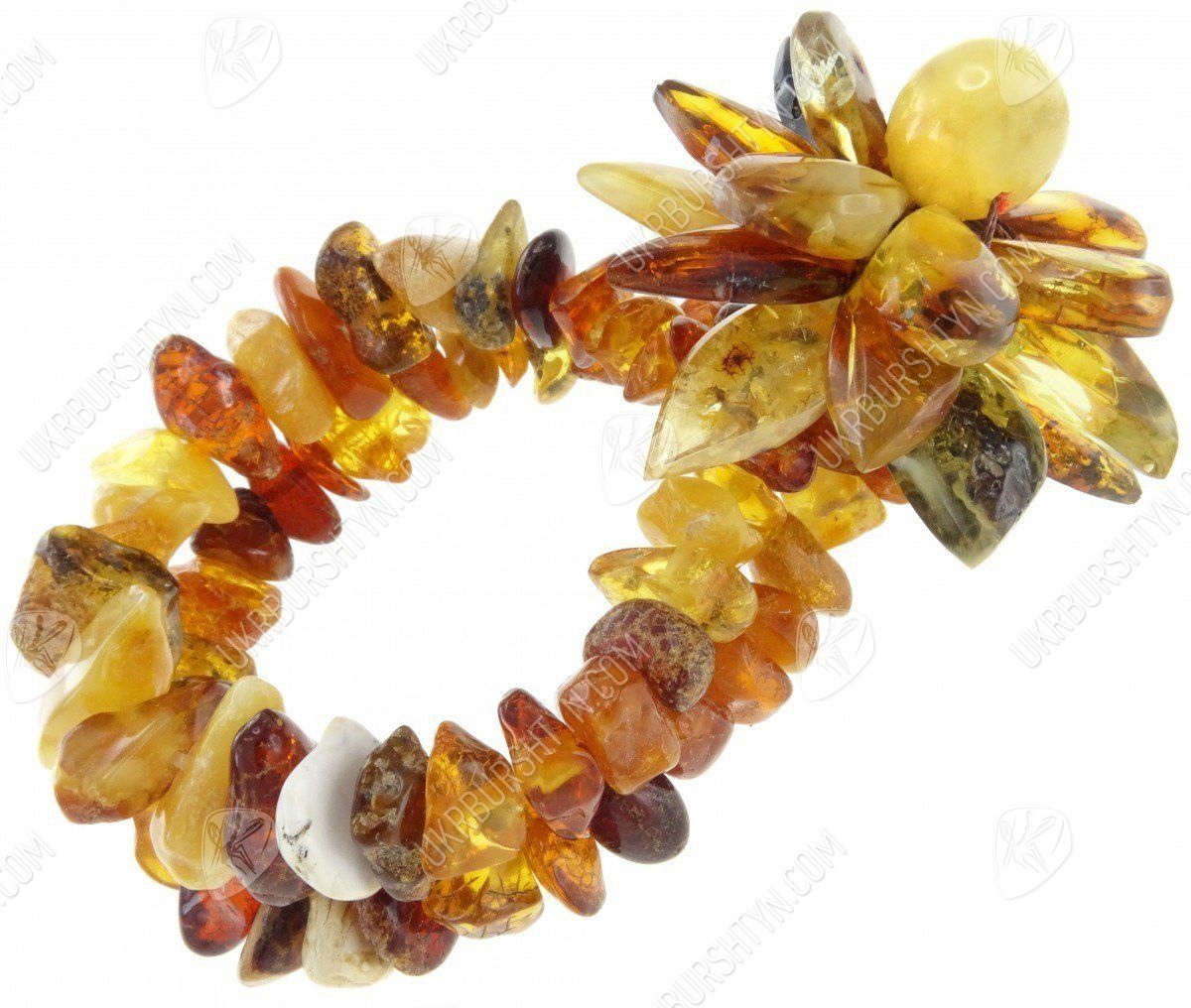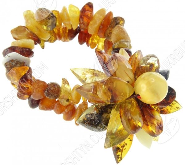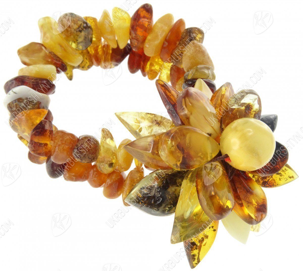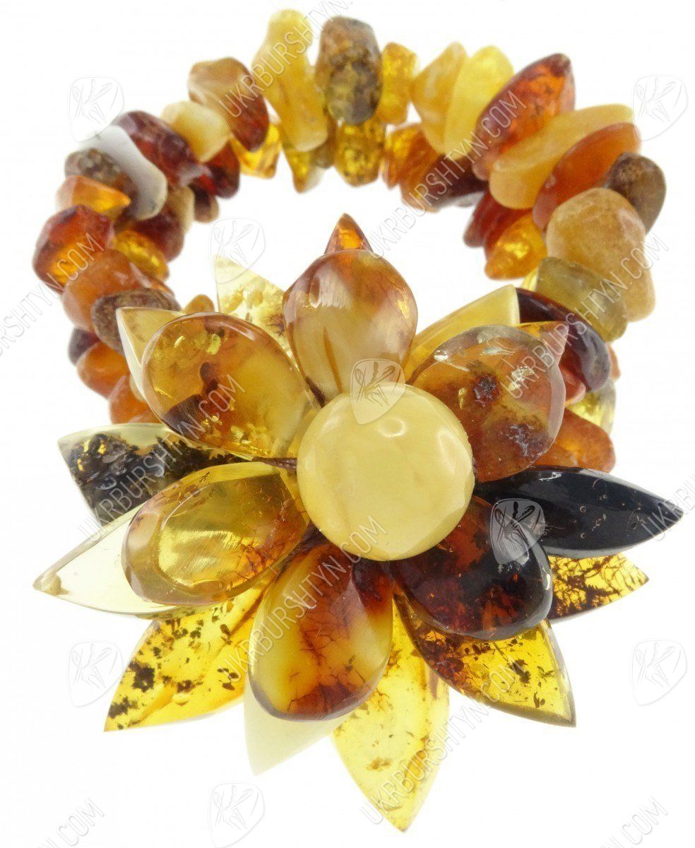 Прикраси з натуральних каменів - кращий спосіб продемонструвати свій смак, відчуття стилю та естетичне чуття. Всього один подібний аксесуар здатний повністю перетворити Ваш наряд - особливо якщо він виглядає так само стильно, ефектно і шикарно, як показаний тут авторський браслет! Дворядна низька з золотистого, шафранового, оранжевого та теракотового поліського бурштину завершується пишною квіткою - її пелюстки зроблені з каплевидних і ромбовидних шматочків скам'янілої смоли, а в якості серцевини майстер використав кульку з матового самоцвіту. Такий дизайн відразу ж виділить цей виріб на фоні будь-якого наряду - тому його варто носити «соло», щоб не перевантажувати образ.