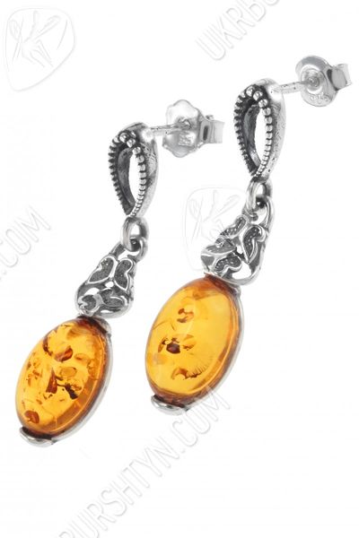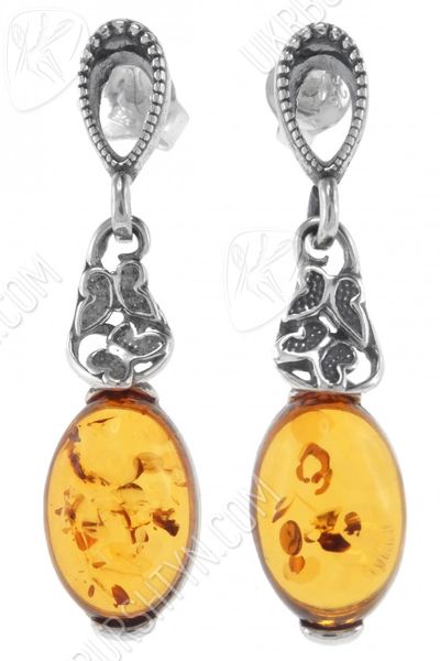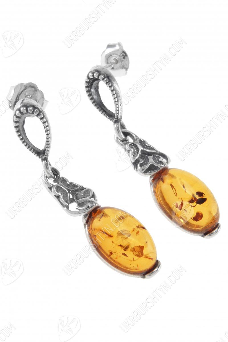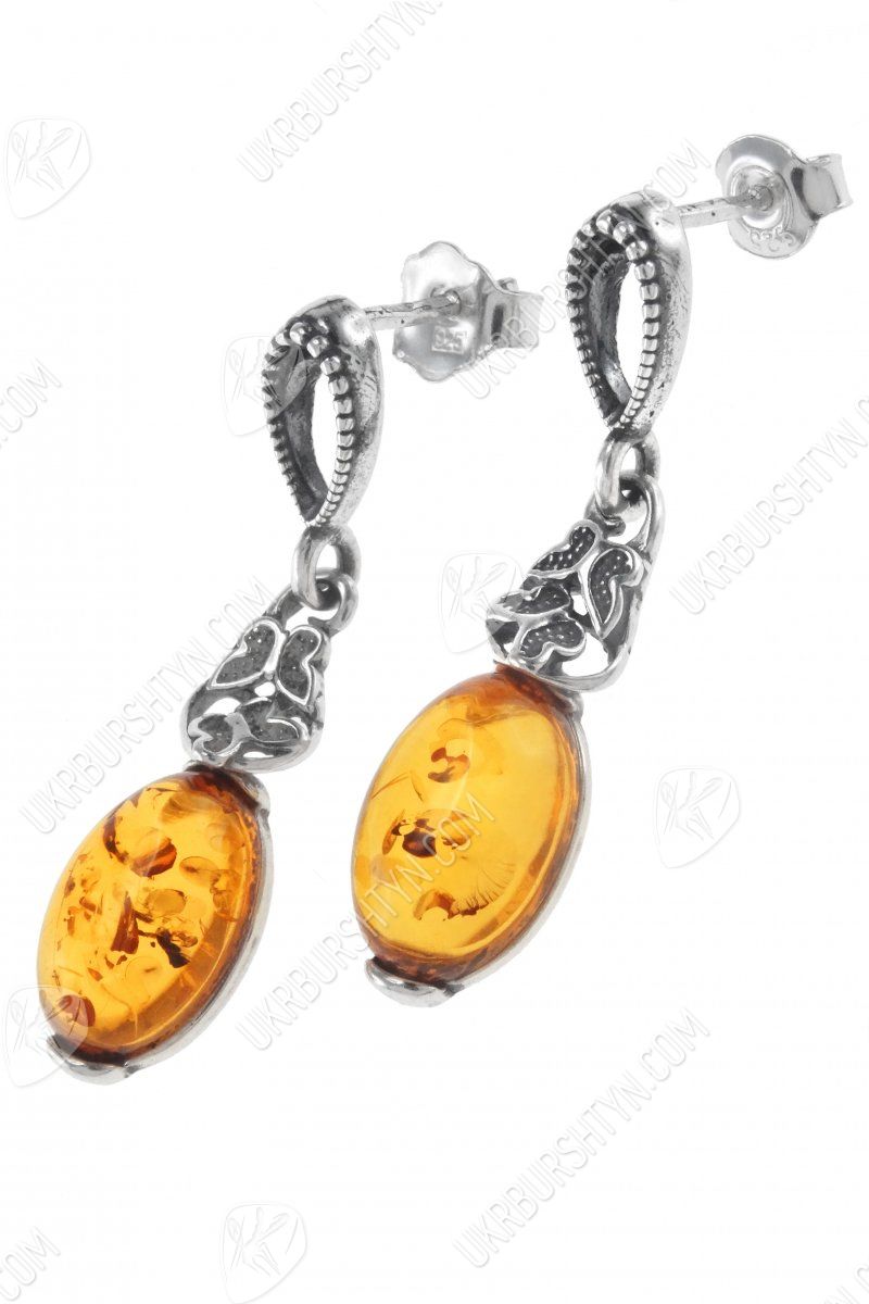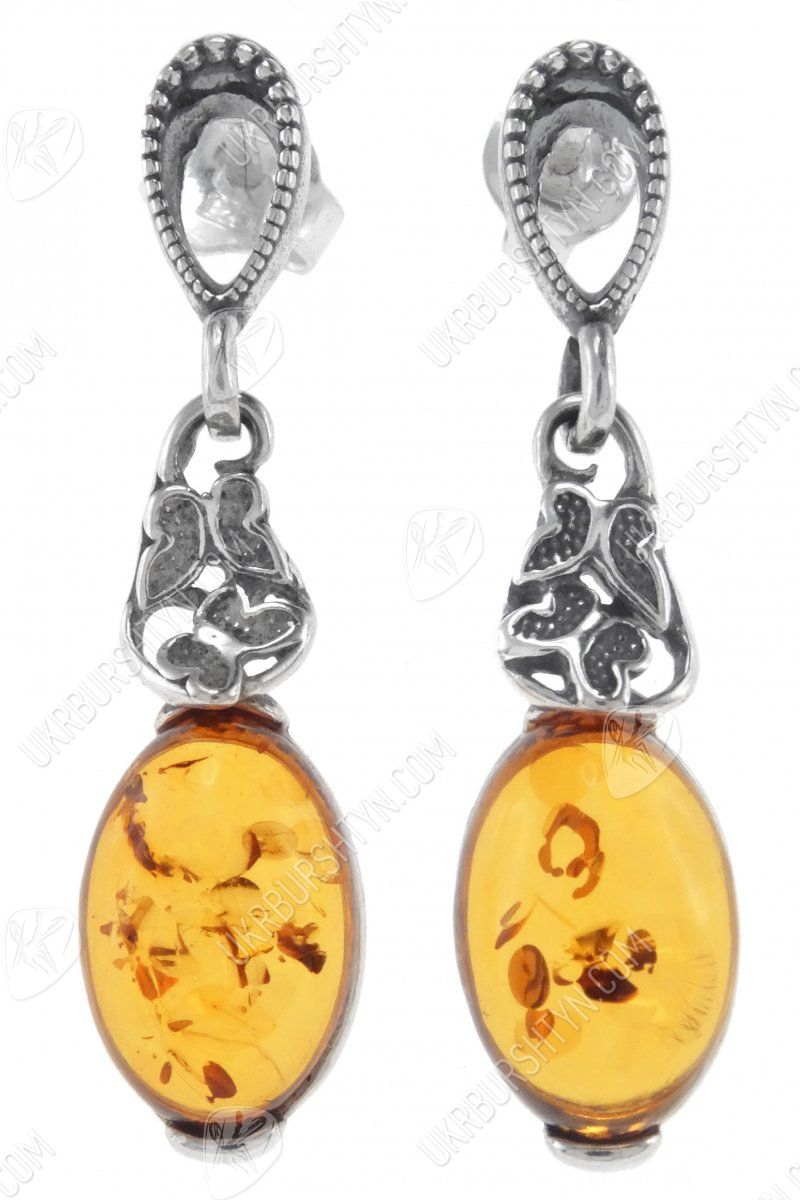 Срібні сережки-пусети з бурштином «Політ метеликів»