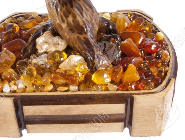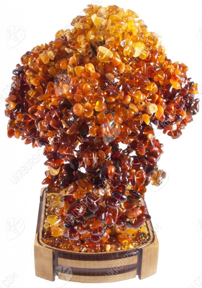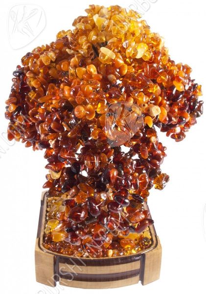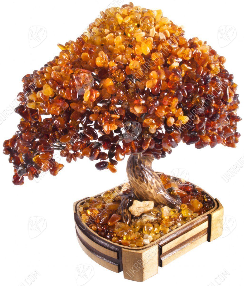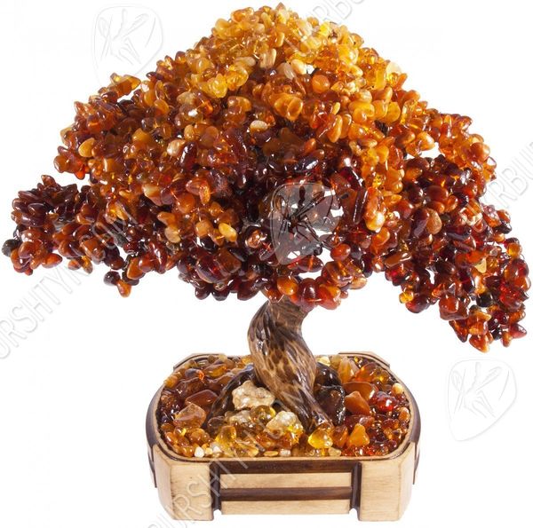 Класичний стиль - один з найпопулярніших напрямків в оформленні інтер'єру. А щоб декороване в подібній манері приміщення не виглядало стереотипним і нудним - помістіть в нього унікальні сувеніри з бурштину. Саме таким акцентом може стати цей незвичайний бонсай. Створюючи його, майстер ретельно відібрав дорогоцінні камені і розташував їх так, щоб домогтися плавного градієнта - від медово-жовтого і помаранчевого тону до коричневого і темно-коньячного. Завдяки цьому крона здається освітленою яскравим вересневим сонцем! Подібне враження тільки підсилює розсип самоцвітів біля коріння мініатюрного деревця - вони випромінюють м'які золотисті, бежеві, рудуваті відблиски.