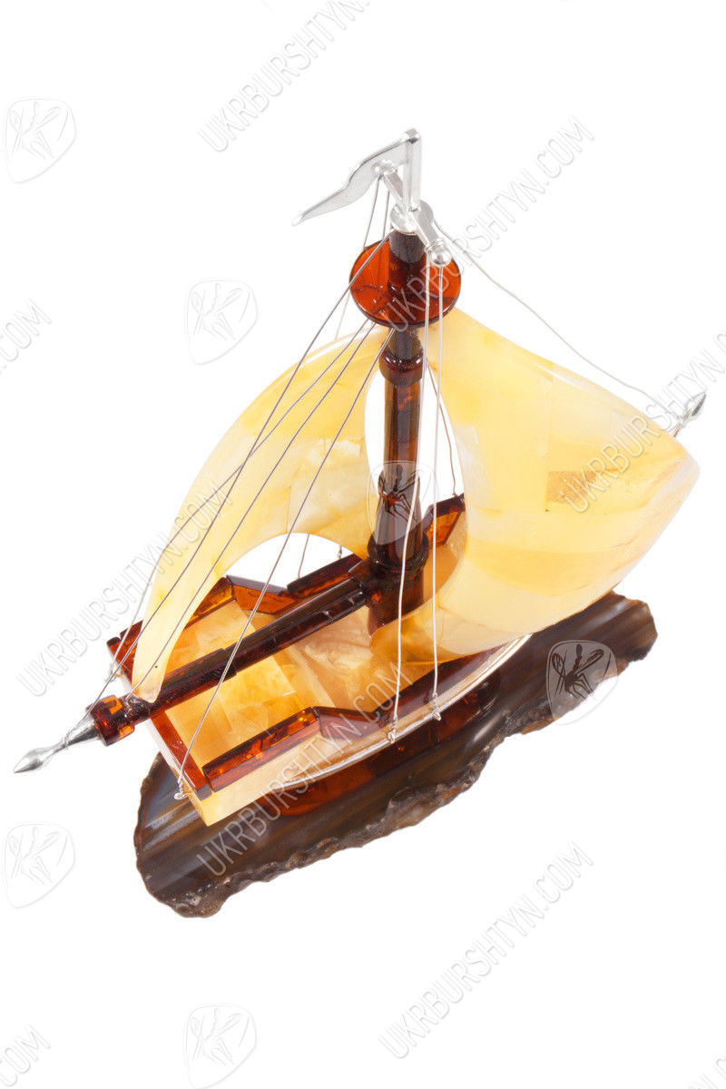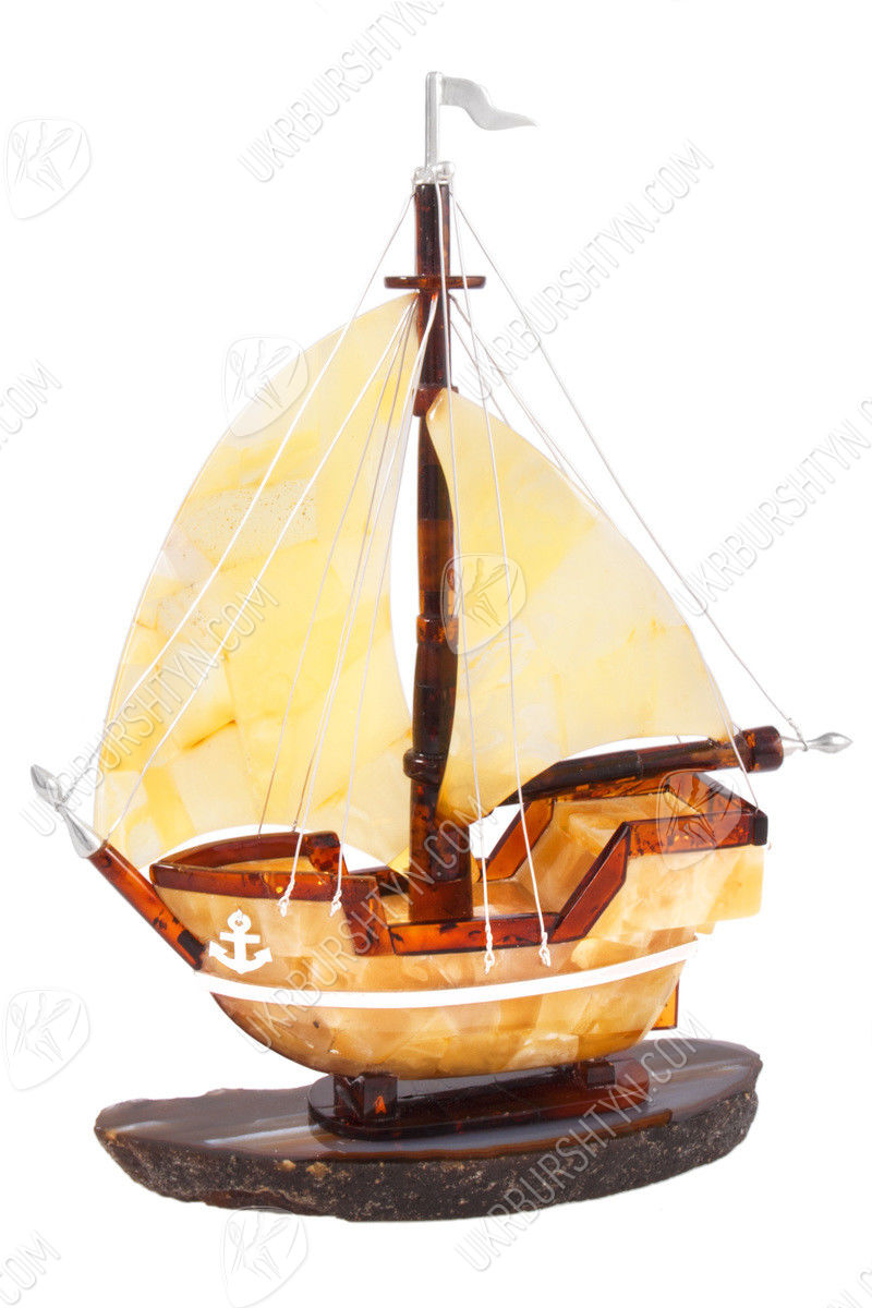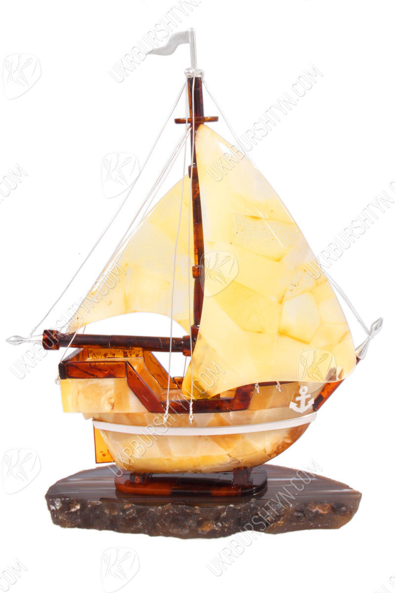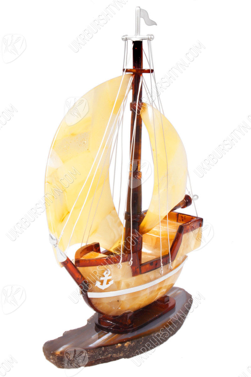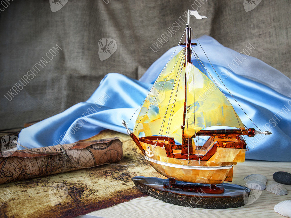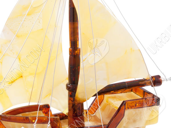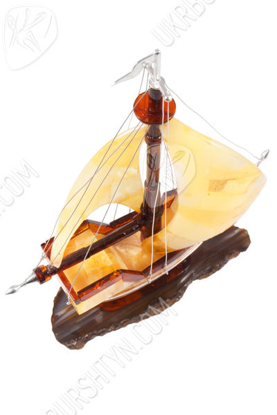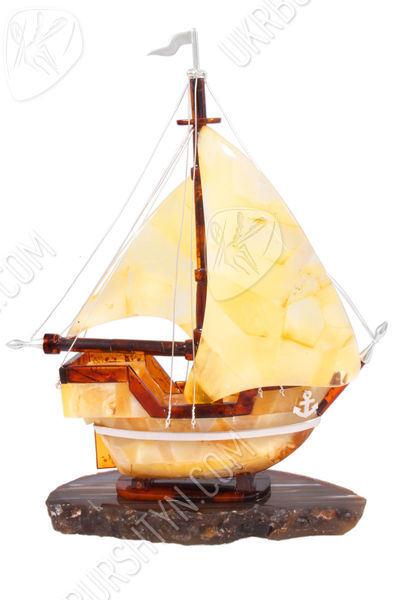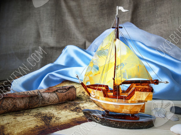 Щоб створити мініатюрний кораблик, майстер скомбінував деталі з поліського бурштину різних відтінків. Напнуті вітрила судна виконані з молочно-кремових самоцвітів, для міцного корпусу використані коштовні камені золотаво-бежевого забарвлення, а щогла та оздоблення палуби виготовлені з теракотово-коньячних кабошонів. Не забутий і такелаж – його імітують тонкі нитки. Наш магазин сувенірів гарантує – настільки оригінальна річ потішить будь-якого представника сильної статі!