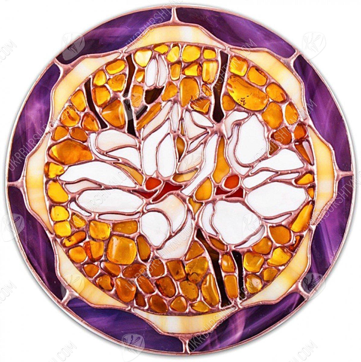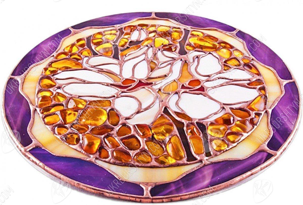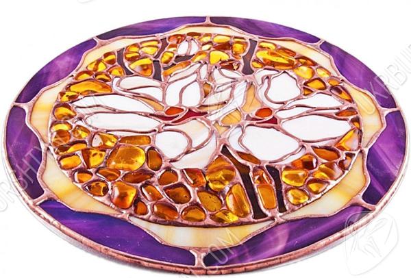Маєте намір купити оригінальний подарунок на день народження подруги або близької родички? Зверніть увагу на цей ексклюзивний витвір, в якому ефектно поєднуються різнобарвне вітражне скло і натуральний поліський бурштин. Майстер виклав з білосніжних пластинок ніжні пелюстки лілій, оточивши їх золотими, шафрановими, червоними та помаранчевими самоцвітами. Фантазійні квіти відразу ж привертають увагу глядача завдяки асиметричному і неординарному дизайну. А завершує роботу контрастне обрамлення, зроблене з фіолетових та бежевих елементів. Такі тарілки сувенірні чудово впишуться в інтер'єр, витриманий в дусі «ар-нуво», «модерну» або «авангарду».