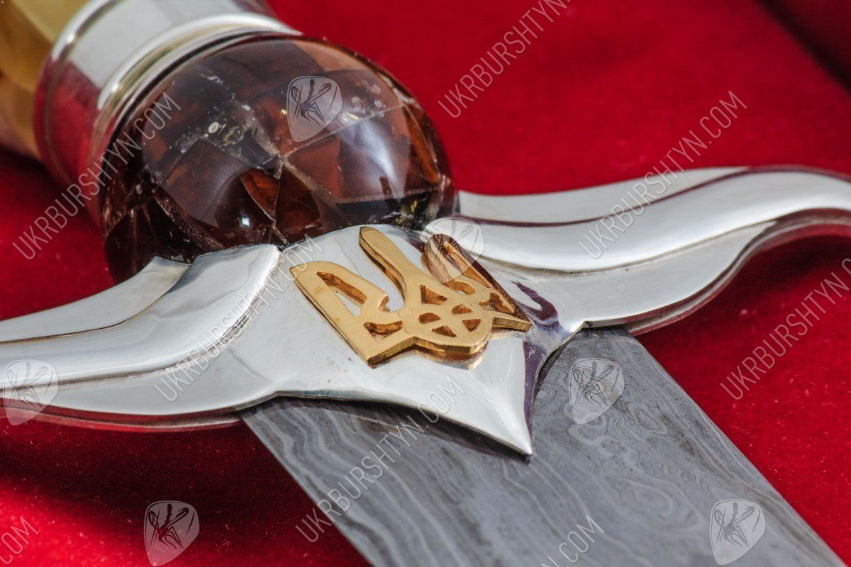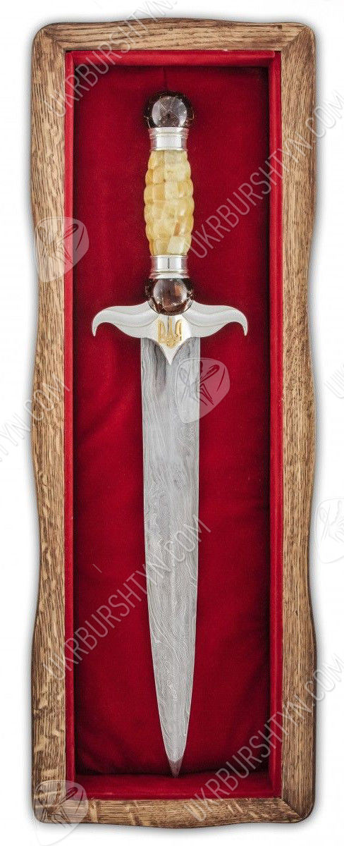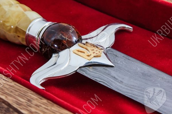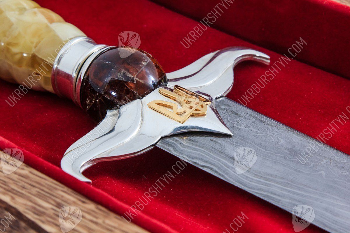 Вам потрібні ВІП-подарунки для чоловіків, що займають високі посади? Цей сувенірний кинджал стане чудовим, символічним і небанальним сюрпризом для таких індивідів. При створенні виробу використовувалися тільки високоякісні матеріали - натуральний поліський бурштин, дамаська сталь, «стерлінгове» срібло 925 проби. Майстер ретельно обробив фігурну рукоятку витвору, прикрасивши її об'ємною самоцвітною інкрустацією, виконаною в техніці «флорентійська мозаїка». Золотисті, жовті, шафранові та коньячні дорогоцінні камені відтіняє холодний блиск благородного металу, з якого викувані доповнений рельєфною накладкою у вигляді українського герба ефес і навершя.