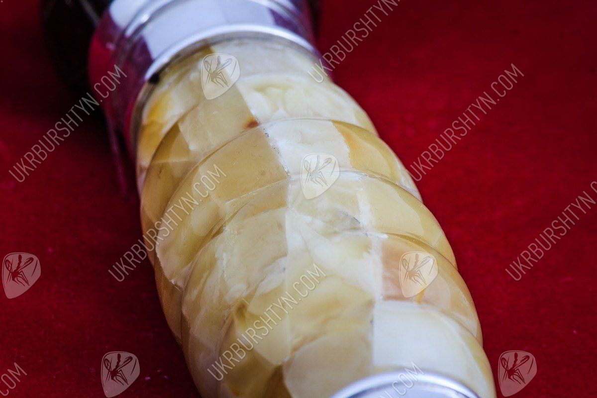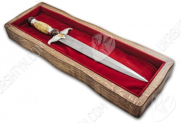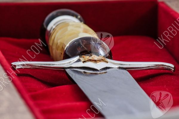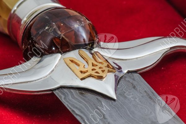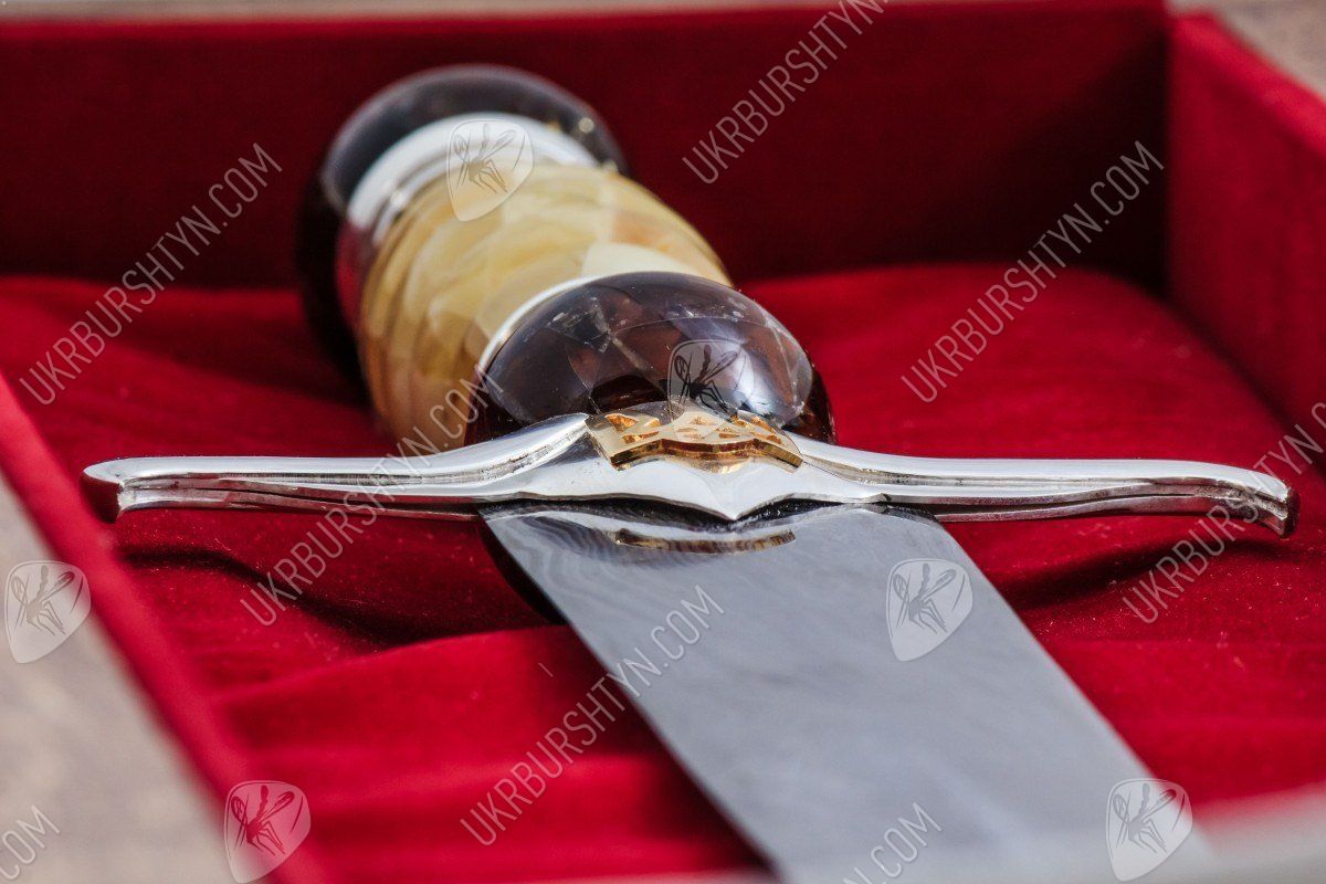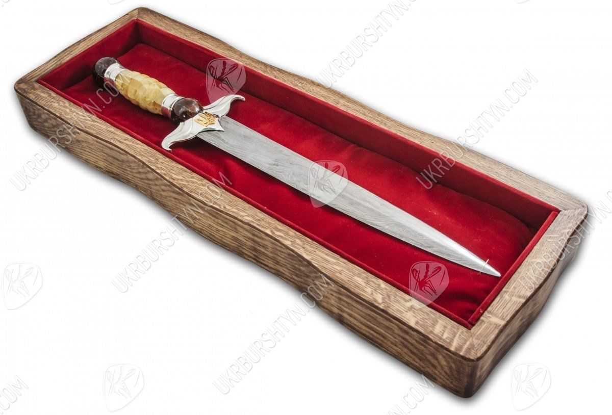 Вам потрібні ВІП-подарунки для чоловіків, що займають високі посади? Цей сувенірний кинджал стане чудовим, символічним і небанальним сюрпризом для таких індивідів. При створенні виробу використовувалися тільки високоякісні матеріали - натуральний поліський бурштин, дамаська сталь, «стерлінгове» срібло 925 проби. Майстер ретельно обробив фігурну рукоятку витвору, прикрасивши її об'ємною самоцвітною інкрустацією, виконаною в техніці «флорентійська мозаїка». Золотисті, жовті, шафранові та коньячні дорогоцінні камені відтіняє холодний блиск благородного металу, з якого викувані доповнений рельєфною накладкою у вигляді українського герба ефес і навершя.