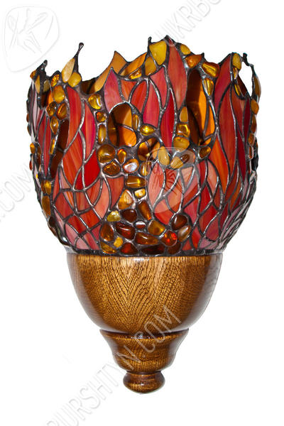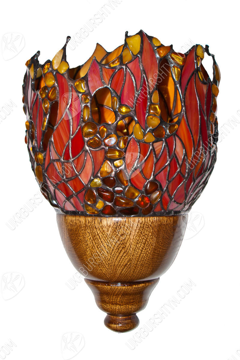 Эта янтарная лампа выполнена не то в виде экзотического цветка, не то в виде огненной короны – именно такое впечатление создают янтарные кристаллы и витражные вставки, из которых собран её корпус. А надёжное основание из полированной дубовой древесины обеспечивает надёжность и безопасность всей конструкции.