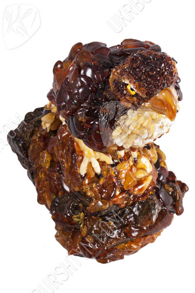 Изделие, вдохновленное образом мужественной птицы, имеет приятную глубокую расцветку. Палитра объединяет темно-коньячные, карамельные, молочные, песочные и медовые оттенки. Аккуратность пропорций и деликатность деталей сообщают композиции гармоничной сдержанности и фактурности. Геометрические фрагменты солнечного камня, использованные в дизайне, придают модели выразительного лоска.