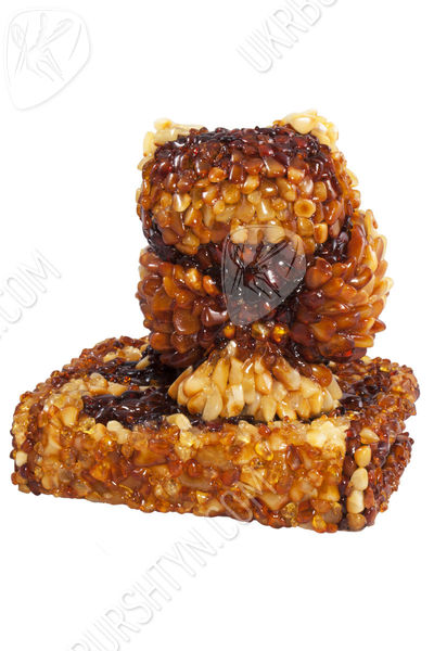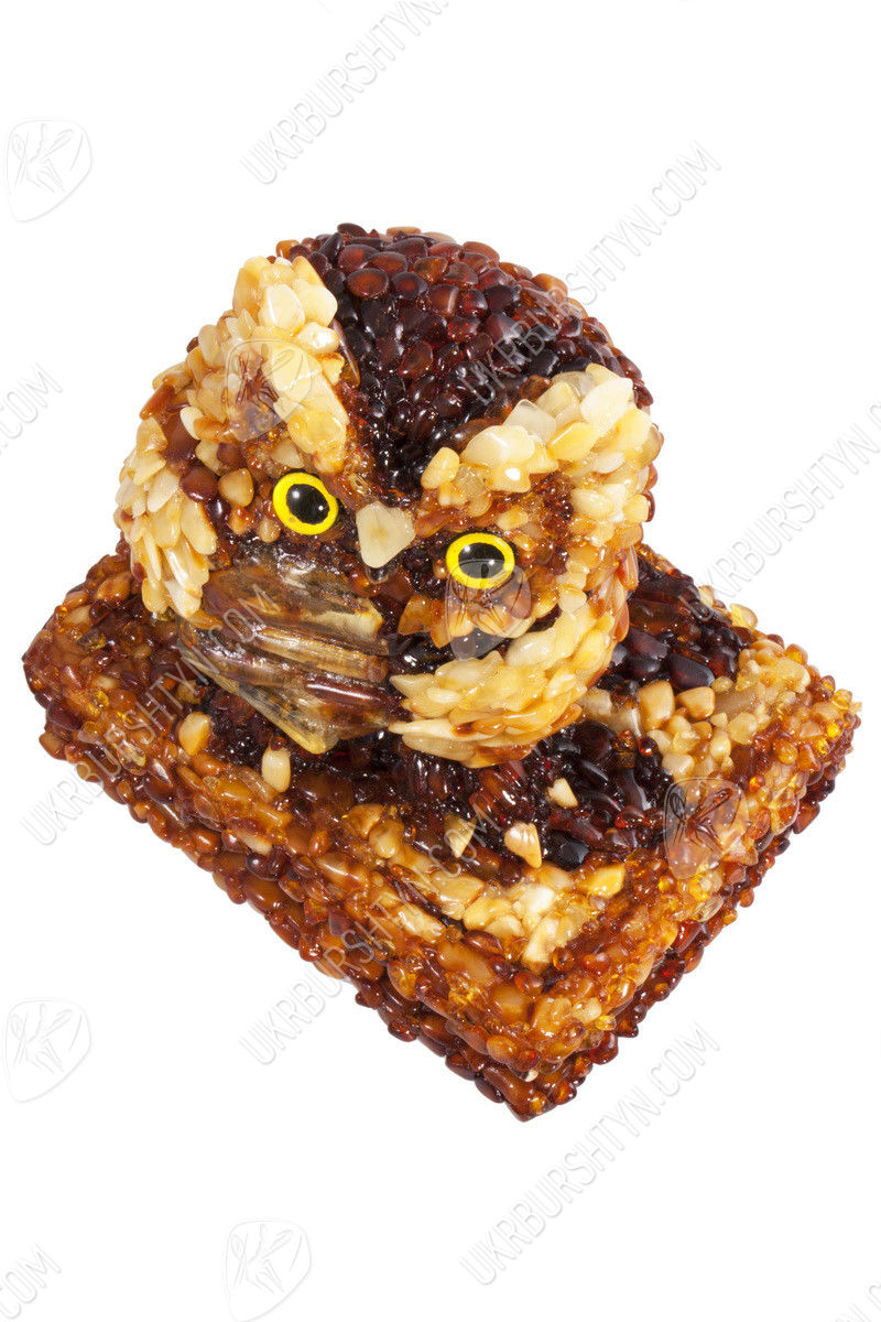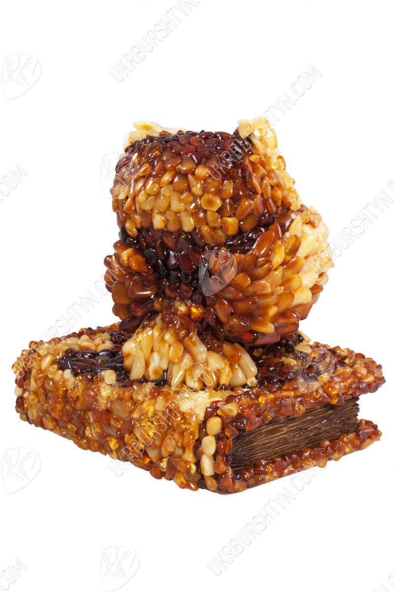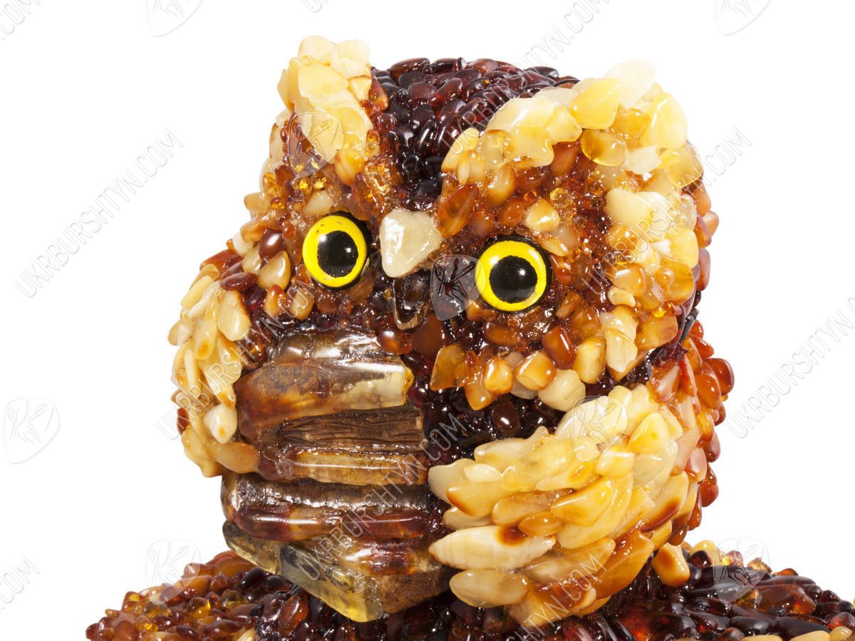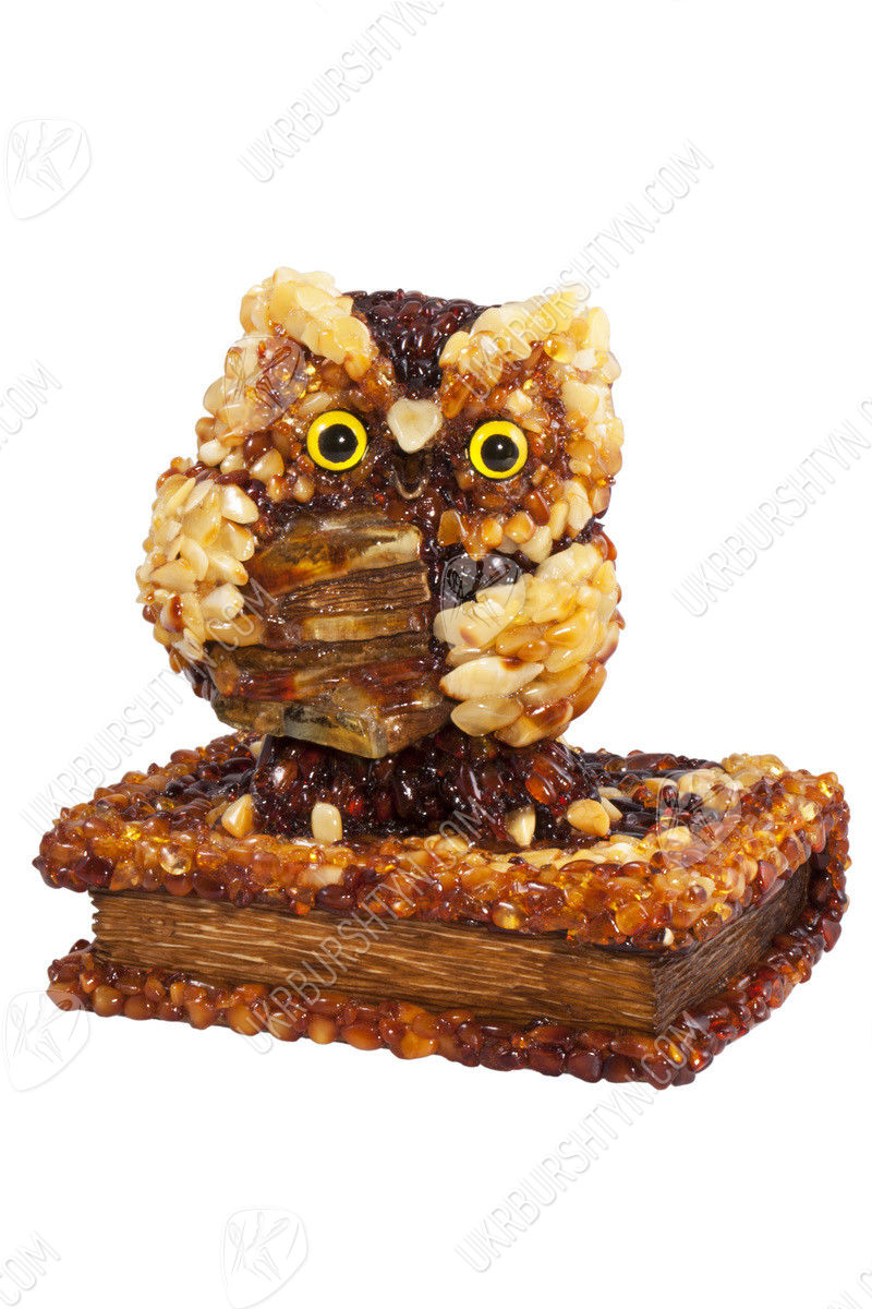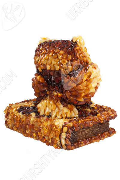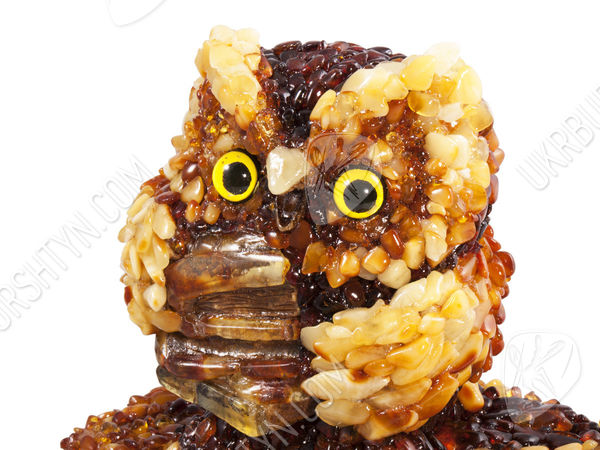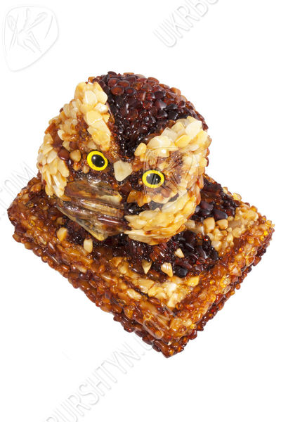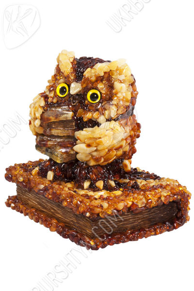 Изделие воплощает образ очаровательного совенка (символа мудрости и любви к знаниям), который стоит на плотном фолианте. Богатство задействованных оттенков – миндального, каштанового, карамельного, персикового и коньячного – искусно подчеркивает естественную красоту солнечного камня.